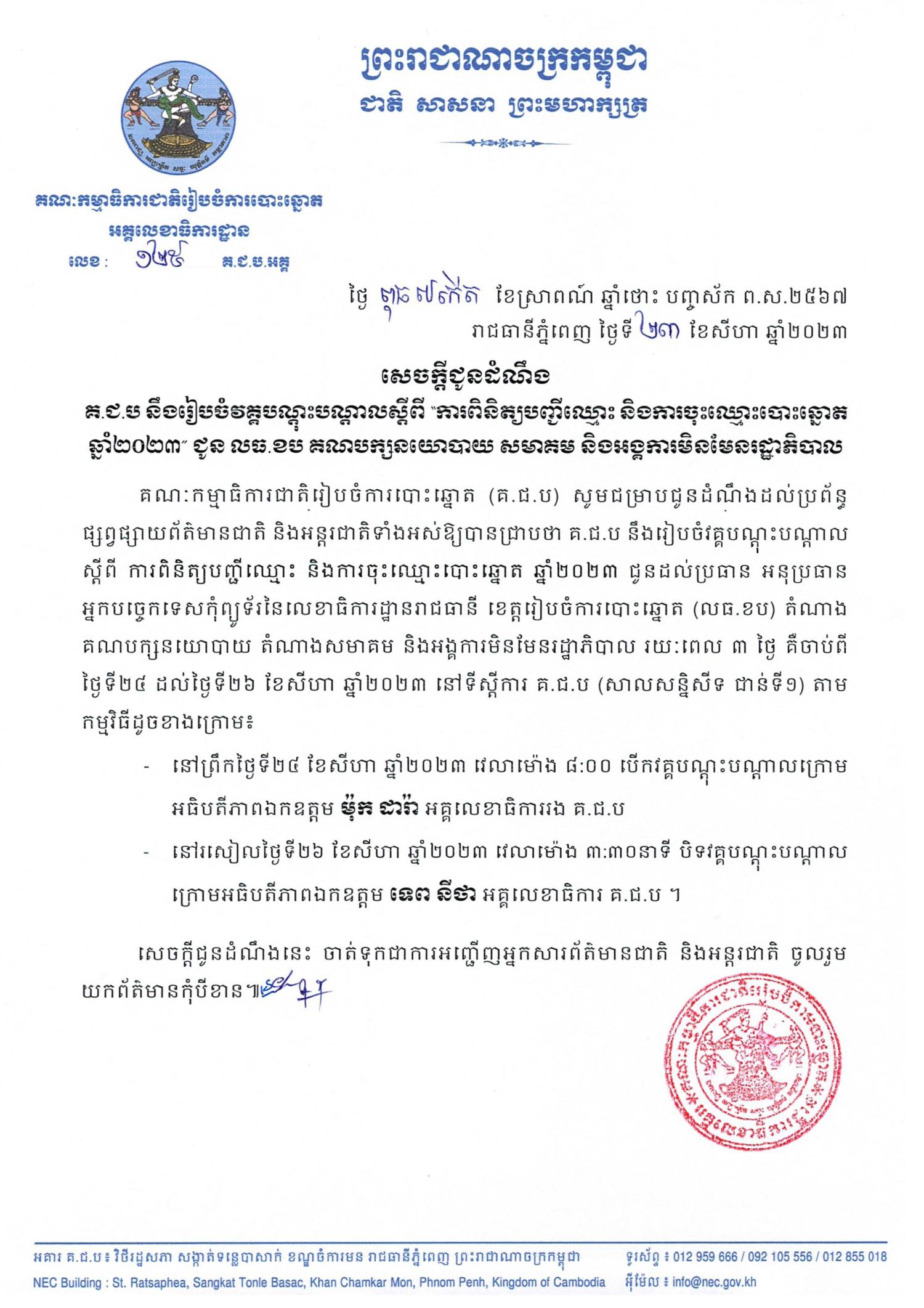 គណៈកម្មាធិការជាតិរៀបចំការបោះឆ្នោត (គ.ជ.ប) សូមជម្រាបជូនដំណឹងដល់ប្រព័ន្ធផ្សព្វផ្សាយព័ត៌មានជាតិ និងអន្តរជាតិទាំងអស់ឱ្យបានជ្រាបថា គ.ជ.ប នឹងរៀបចំវគ្គបណ្ដុះបណ្ដាលស្ដីពី ការពិនិត្យបញ្ជីឈ្មោះ និងការចុះឈ្មោះបោះឆ្នោត ឆ្នាំ២០២៣ ជូនដល់ប្រធាន អនុប្រធាន អ្នកបច្ចេកទេសកុំព្យូទ័រនៃលេខាធិការដ្ឋានរាជធានី ខេត្តរៀបចំការបោះឆ្នោត (លធ.ខប) តំណាងគណបក្សនយោបាយ តំណាងសមាគម និងអង្គការមិនមែនរដ្ឋាភិបាល រយៈពេល ៣ ថ្ងៃ គឺចាប់ពីថ្ងៃទី២៤ ដល់ថ្ងៃទី២៦ ខែសីហា ឆ្នាំ២០២៣ នៅទីស្ដីការ គ.ជ.ប (សាលសន្និសីទ ជាន់ទី១) តាមកម្មវិធីដូចខាងក្រោម៖