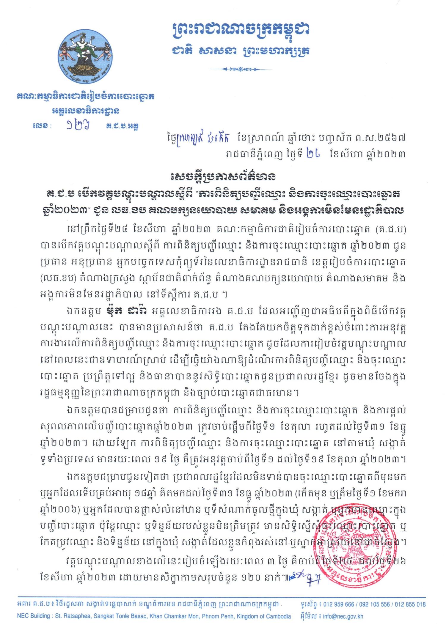 នៅព្រឹកថ្ងៃទី២៤ ខែសីហា ឆ្នាំ២០២៣ គណៈកម្មាធិការជាតិរៀបចំការបោះឆ្នោត (គ.ជ.ប) បានបើកវគ្គបណ្ដុះបណ្ដាលស្ដីពី ការពិនិត្យបញ្ជីឈ្មោះ និងការចុះឈ្មោះបោះឆ្នោត ឆ្នាំ២០២៣ ជូន ប្រធាន អនុប្រធាន អ្នកបច្ចេកទេសកុំព្យូទ័រនៃលេខាធិការដ្ឋានរាជធានី ខេត្តរៀបចំការបោះឆ្នោត (លធ.ខប) តំណាងក្រសួង ស្ថាប័នជាតិពាក់ព័ន្ធ តំណាងគណបក្សនយោបាយ តំណាងសមាគម និងអង្គការមិនមែនរដ្ឋាភិបាល នៅទីស្ដីការ គ.ជ.ប ។