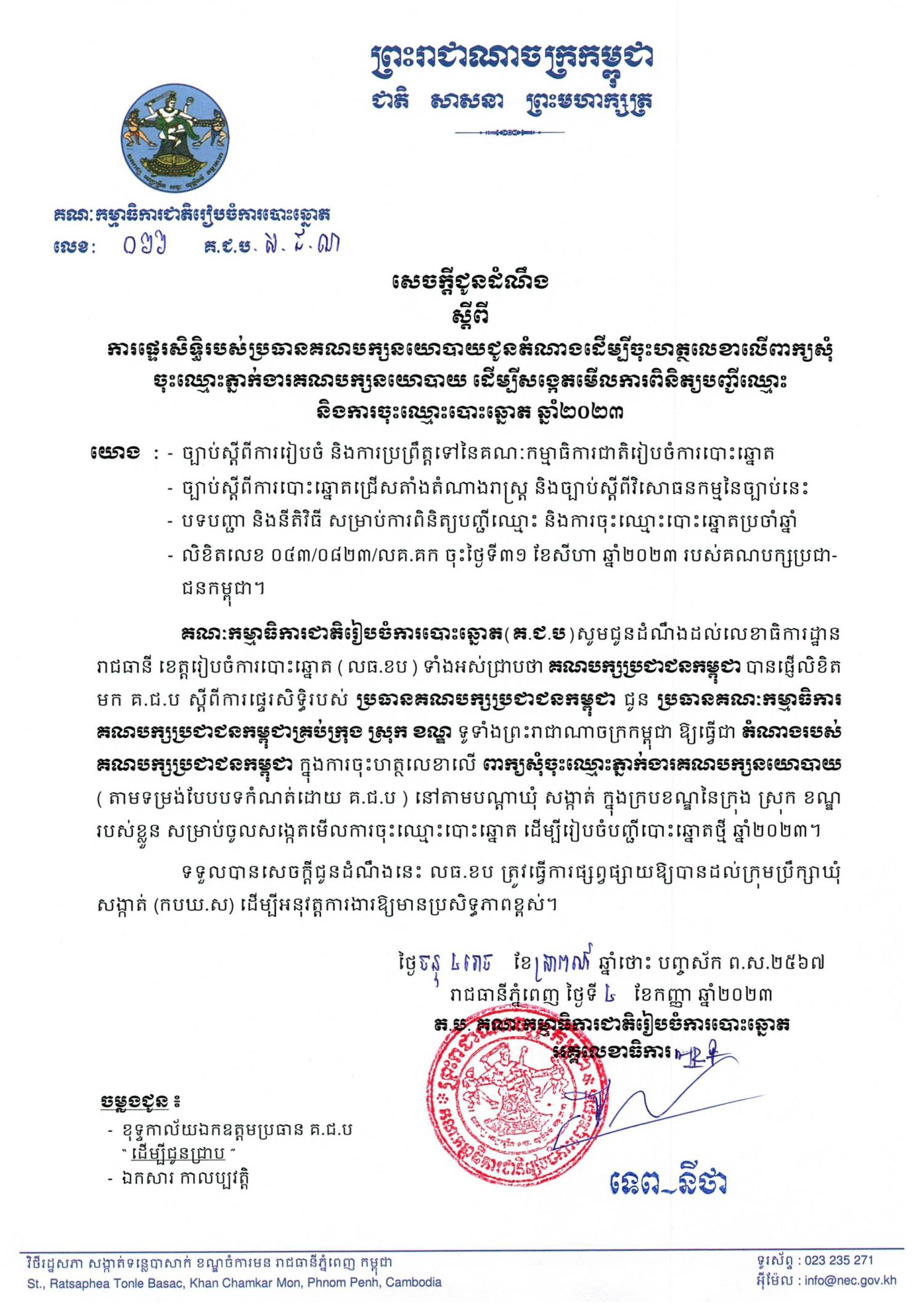 សេចក្តីជូនដំណឹងលេខ ០៦៦ គ.ជ.ប.ស.ជ.ណ ស្តីពីការផ្ទេរសិទ្ធិរបស់ប្រធានគណបក្សប្រជាជនកម្ពុជា ជូនតំណាងដើម្បីចុះហត្ថលេខាលើពាក្យសុំចុះឈ្មោះភ្នាក់ងារគណបក្សនយោបាយ ដើម្បីសង្កេតមើលការពិនិត្យបញ្ជីឈោ្មះ និងការចុះឈ្មោះបោះឆ្នោត ឆ្នាំ២០២៣