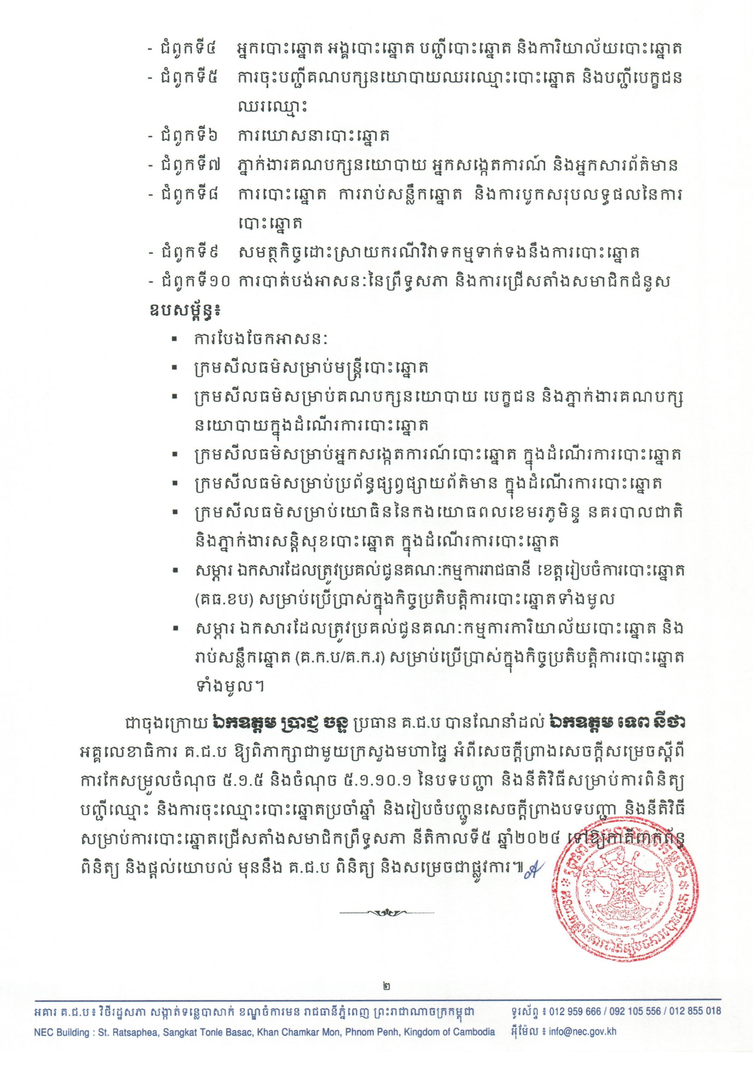 ជាចុងក្រោយ ឯកឧត្តម ប្រាជ្ញ ចន្ទ ប្រធាន គ.ជ.ប បានណែនាំដល់ ឯកឧត្តម ទេព នីថា អគ្គលេខាធិការ គ.ជ.ប ឱ្យពិភាក្សាជាមួយក្រសួងមហាផ្ទៃ អំពីសេចក្តីព្រាងសេចក្តីសម្រេចស្តីពីការកែសម្រួលចំណុច ៥.១.៥ និងចំណុច ៥.១.១០.១ នៃបទបញ្ជា និងនីតិវិធីសម្រាប់ការពិនិត្យបញ្ជីឈ្មោះ និងការចុះឈ្មោះបោះឆ្នោតប្រចាំឆ្នាំ និងរៀបចំបញ្ជូនសេចក្តីព្រាងបទបញ្ជា និងនីតិវិធី សម្រាប់ការបោះឆ្នោតជ្រើសតាំងសមាជិកព្រឹទ្ធសភា នីតិកាលទី៥ ឆ្នាំ២០២៤ ទៅឱ្យភាគីពាក់ព័ន្ធពិនិត្យ និងផ្តល់យោបល់ មុននឹង គ.ជ.ប ពិនិត្យ និងសម្រេចជាផ្លូវការ៕