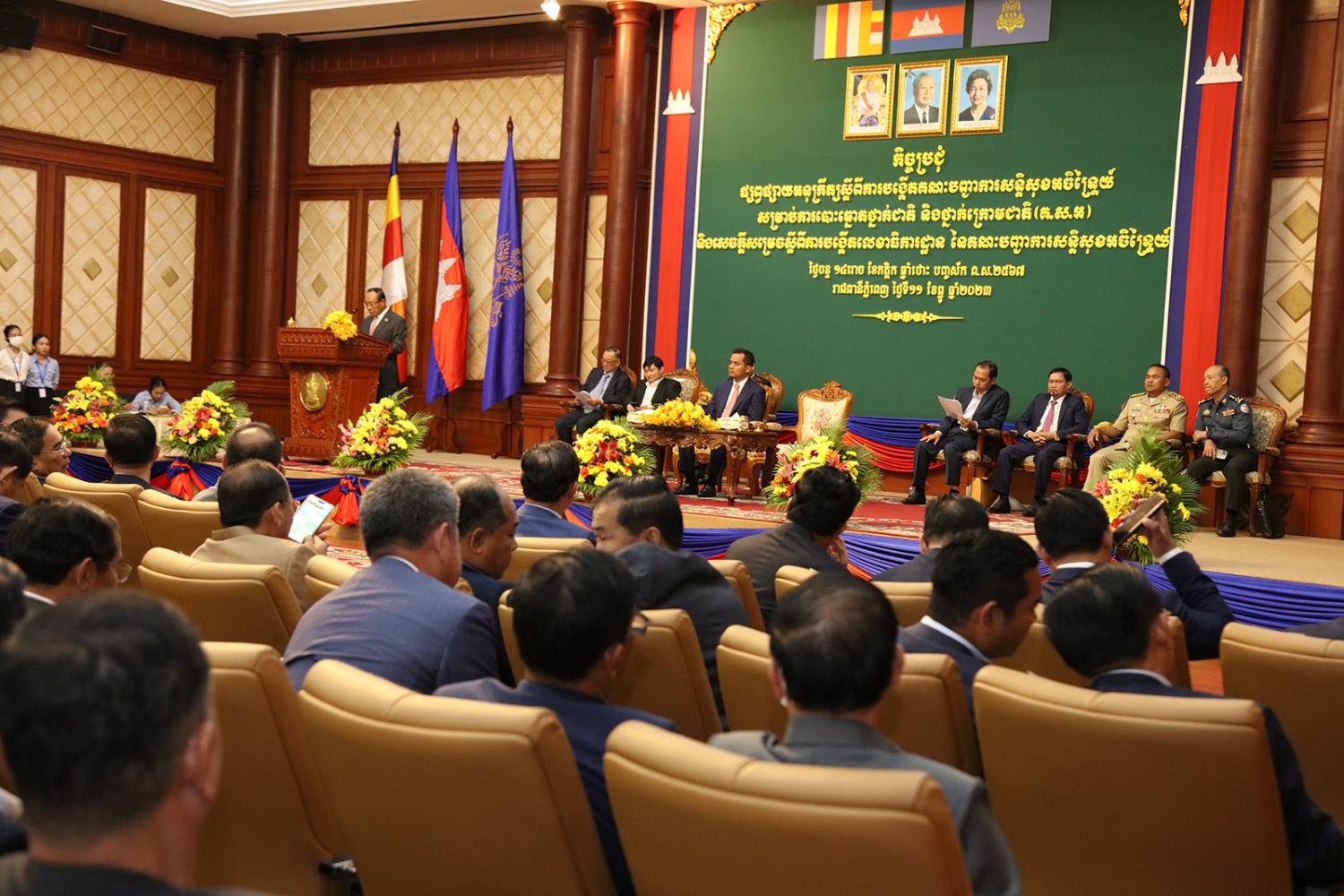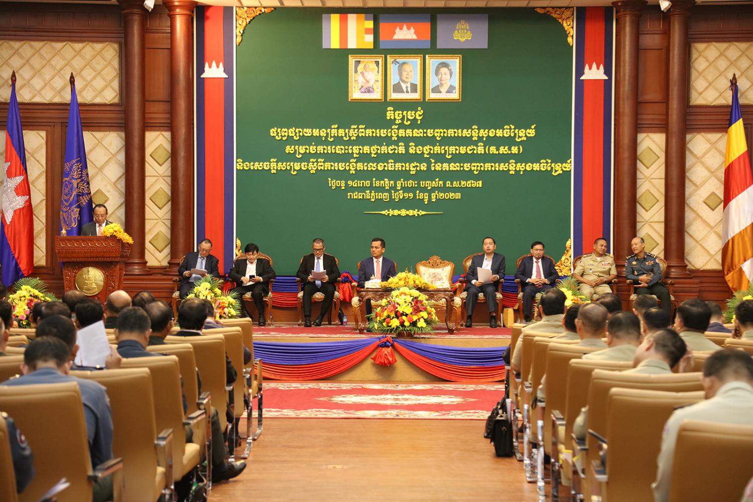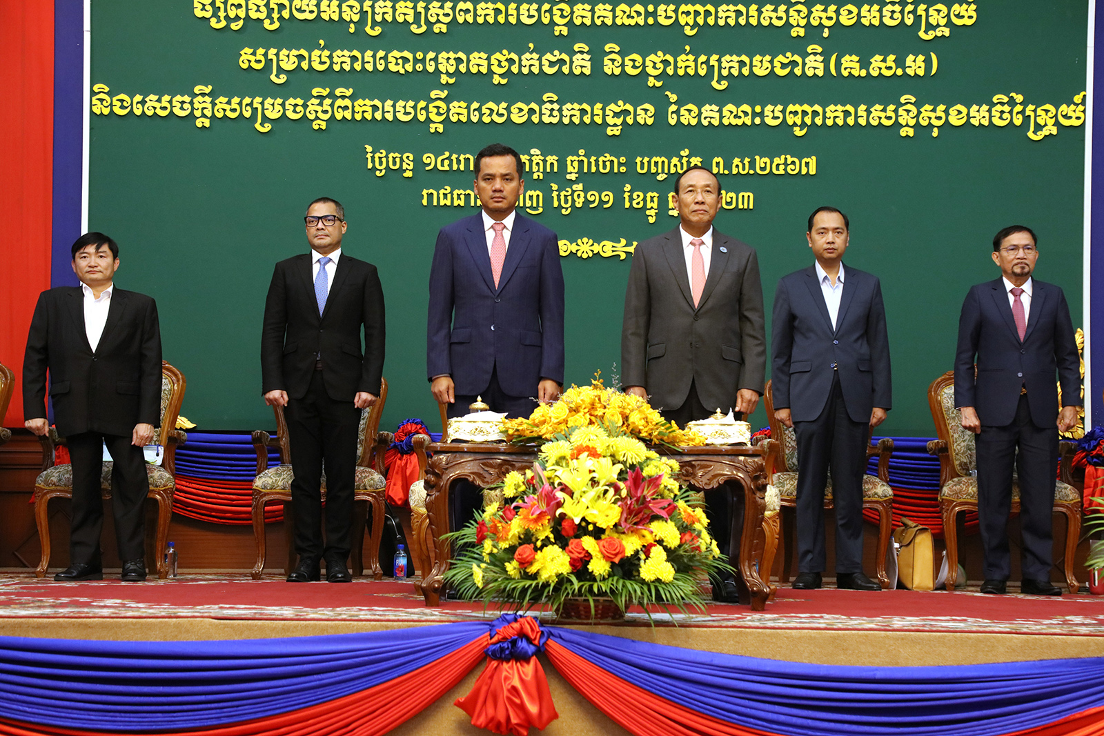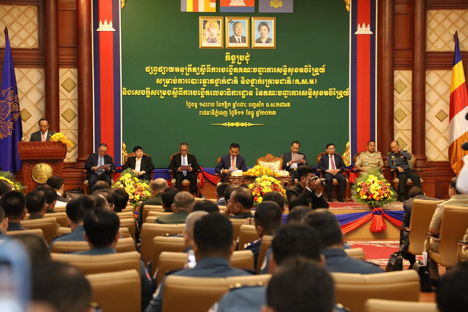 រូបភាពសកម្មភាព ឯកឧត្តម ប្រាជ្ញ ចន្ទ ប្រធានគណៈកម្មាធិការជាតិរៀបចំការបោះឆ្នោត (គ.ជ.ប) រួមទាំងថ្នាក់ដឹកនាំនៃអគ្គលេខាធិការដ្ឋាន គ.ជ.ប បានអញ្ជើញចូលរួមក្នុងកិច្ចប្រជុំផ្សព្វផ្សាយអនុក្រឹត្យ ស្តីពីការបង្កើតគណៈបញ្ជាការសន្តិសុខអចិន្រ្តៃយ៍សម្រាប់ការបោះឆ្នោតថ្នាក់ជាតិ និងថ្នាក់ក្រោមជាតិ (គ.ស.អ) និងសេចក្តីសម្រេចស្តីពីការបង្កើតលេខាធិការដ្ឋាននៃគណៈបញ្ជាការសន្តិសុខអចិន្រ្តៃយ៍សម្រាប់ការបោះឆ្នោតថ្នាក់ជាតិ និងថ្នាក់ក្រោមជាតិ នៅសាលប្រជុំអគារ S ទីស្តីការក្រសួងមហាផ្ទៃ នារសៀលថ្ងៃទី១១ ខែធ្នូ ឆ្នាំ២០២៣។