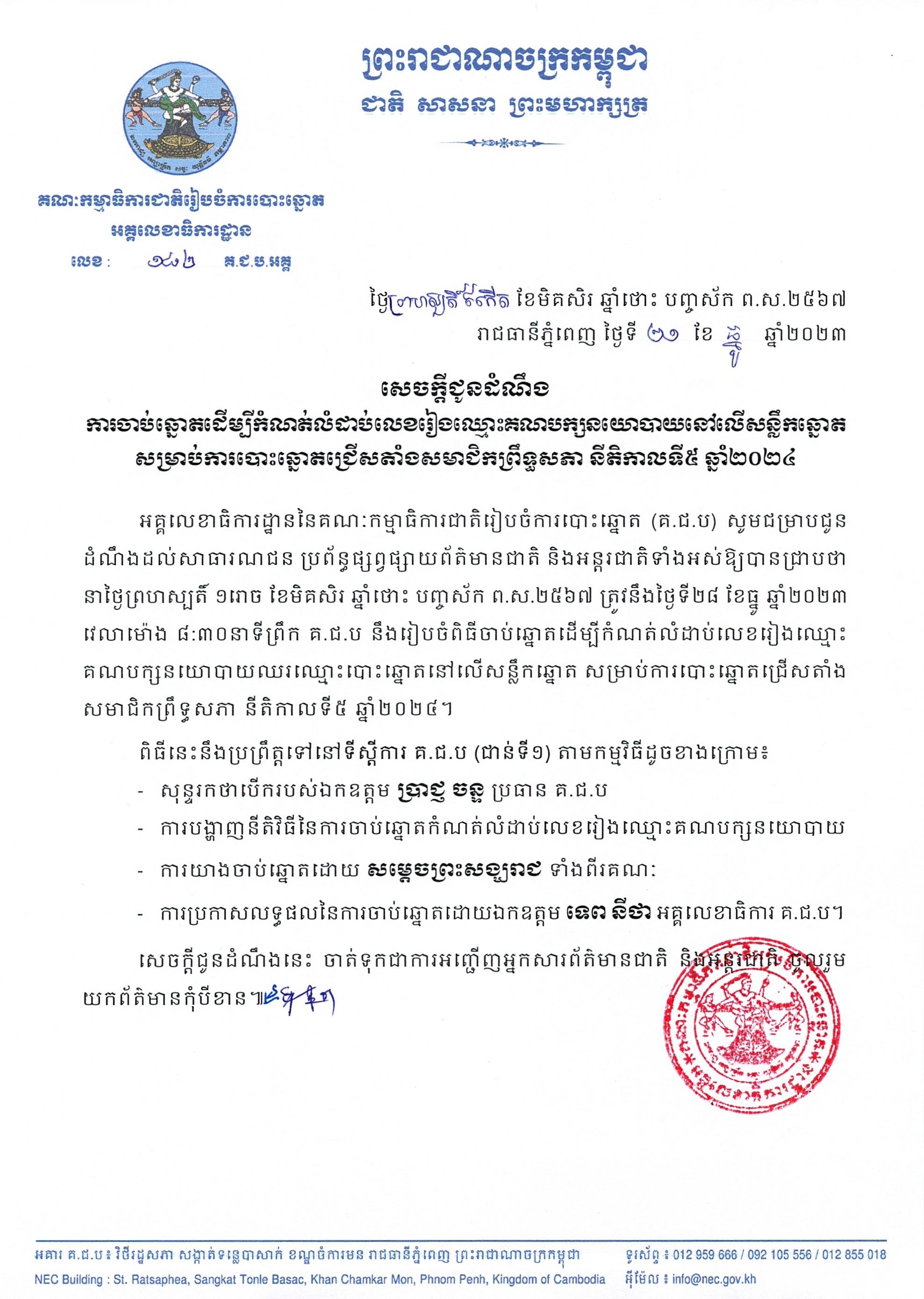 អគ្គលេខាធិការដ្ឋាននៃគណៈកម្មាធិការជាតិរៀបចំការបោះឆ្នោត (គ.ជ.ប) សូមជម្រាបជូនដំណឹងដល់សាធារណជន ប្រព័ន្ធផ្សព្វផ្សាយព័ត៌មានជាតិ និងអន្តរជាតិទាំងអស់ឱ្យបានជ្រាបថា នាថ្ងៃព្រហស្បតិ៍ ១រោច ខែមិគសិរ ឆ្នាំថោះ បញ្ចស័ក ព.ស.២៥៦៧ ត្រូវនឹងថ្ងៃទី២៨ ខែធ្នូ ឆ្នាំ២០២៣ វេលាម៉ោង ៨:៣០នាទីព្រឹក គ.ជ.ប នឹងរៀបចំពិធីចាប់ឆ្នោតដើម្បីកំណត់លំដាប់លេខរៀងឈ្មោះគណបក្សនយោបាយឈរឈ្មោះបោះឆ្នោតនៅលើសន្លឹកឆ្នោត សម្រាប់ការបោះឆ្នោតជ្រើសតាំងសមាជិកព្រឹទ្ធសភា នីតិកាលទី៥ ឆ្នាំ២០២៤។