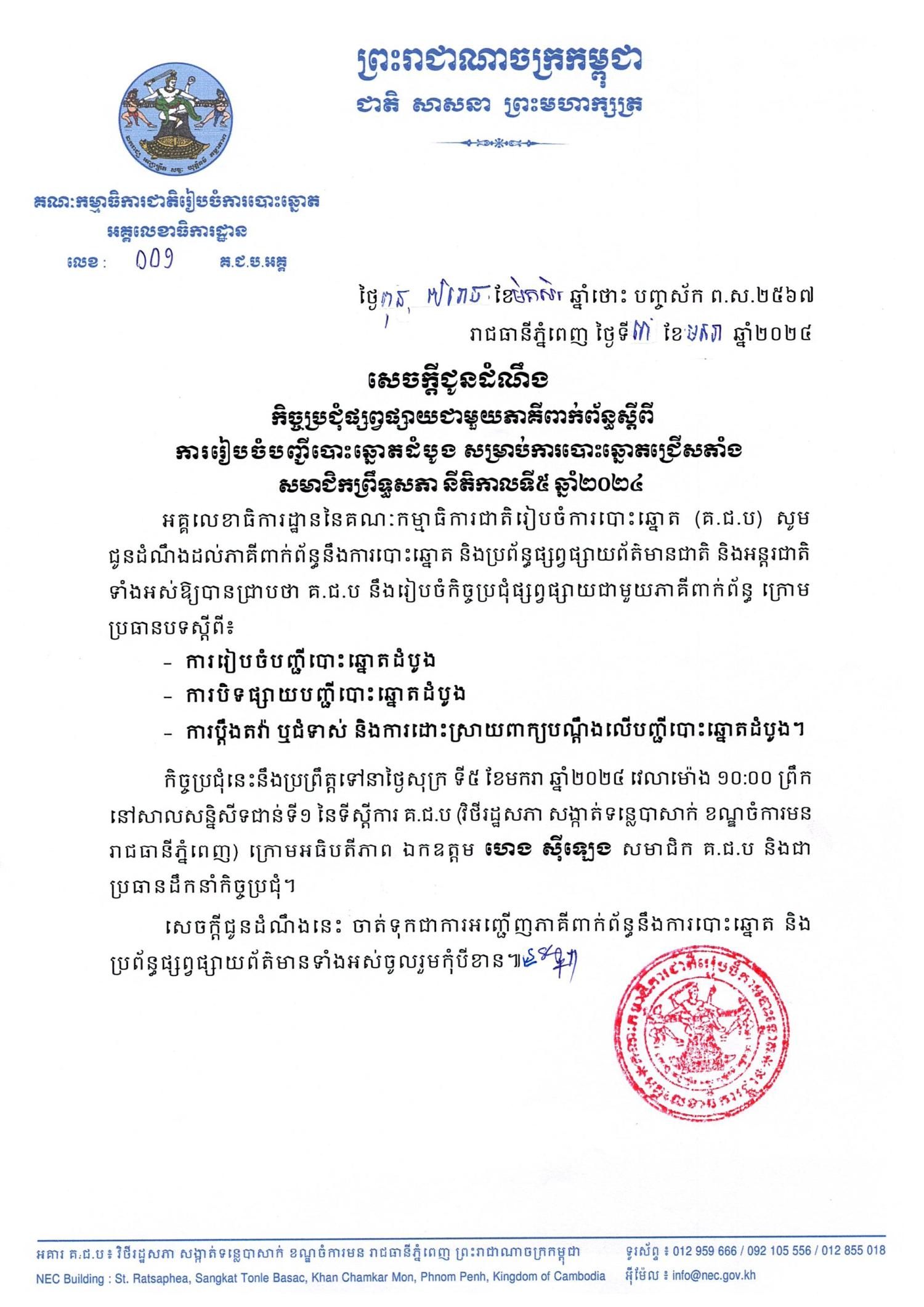 កិច្ចប្រជុំនេះនឹងប្រព្រឹត្តទៅនាថ្ងៃសុក្រ ទី៥ ខែមករា ឆ្នាំ២០២៤ វេលាម៉ោង ១០:០០ ព្រឹក នៅសាលសន្និសីទជាន់ទី១ នៃទីស្តីការ គ.ជ.ប (វិថីរដ្ឋសភា សង្កាត់ទន្លេបាសាក់ ខណ្ឌចំការមន រាជធានីភ្នំពេញ) ក្រោមអធិបតីភាព ឯកឧត្តម ហេង ស៊ីឡេង សមាជិក គ.ជ.ប និងជាប្រធានដឹកនាំកិច្ចប្រជុំ។