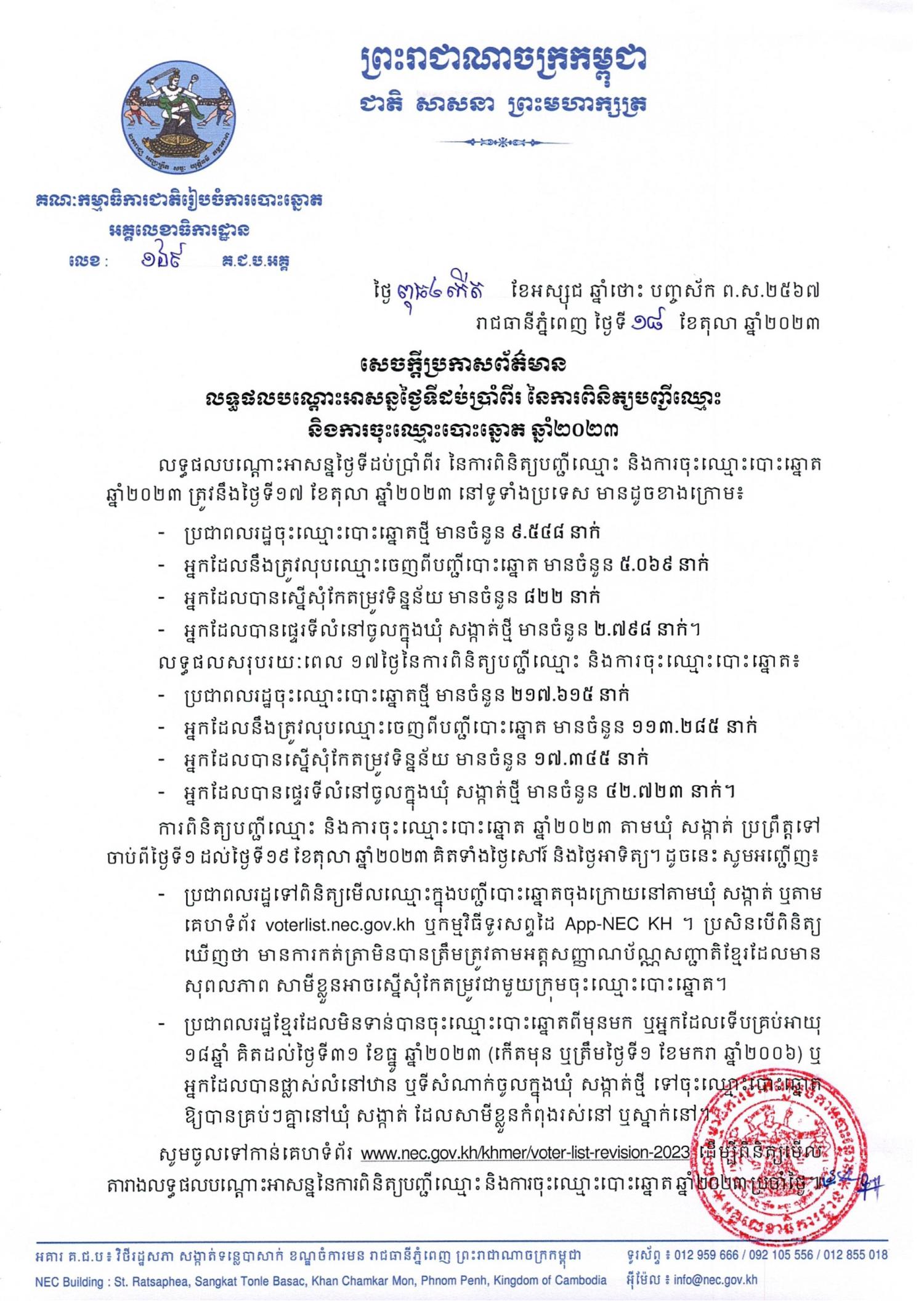 សេចក្តីប្រកាសព័ត៌មានលេខ ១៦៩ គ.ជ.ប.អគ្គ៖ លទ្ធផលបណ្ដោះអាសន្នថ្ងៃទីដប់ប្រាំពីរ នៃការពិនិត្យបញ្ជីឈ្មោះ និងការចុះឈ្មោះបោះឆ្នោត ឆ្នាំ២០២៣