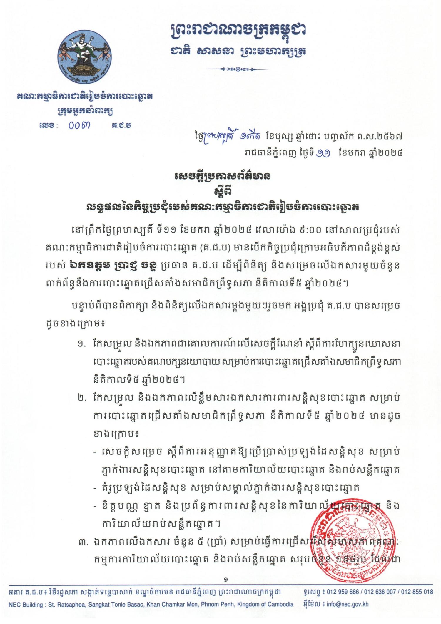 នៅព្រឹកថ្ងៃព្រហស្បតិ៍ ទី១១ ខែមករា ឆ្នាំ២០២៤ វេលាម៉ោង ៩:០០ នៅសាលប្រជុំរបស់គណៈកម្មាធិការជាតិរៀបចំការបោះឆ្នោត (គ.ជ.ប) មានបើកកិច្ចប្រជុំក្រោមអធិបតីភាពដ៏ខ្ពង់ខ្ពស់របស់ ឯកឧត្តម ប្រាជ្ញ ចន្ទ ប្រធាន គ.ជ.ប ដើម្បីពិនិត្យ និងសម្រេចលើឯកសារមួយចំនួនពាក់ព័ន្ធនឹងការបោះឆ្នោតជ្រើសតាំងសមាជិកព្រឹទ្ធសភា នីតិកាលទី៥ ឆ្នាំ២០២៤។