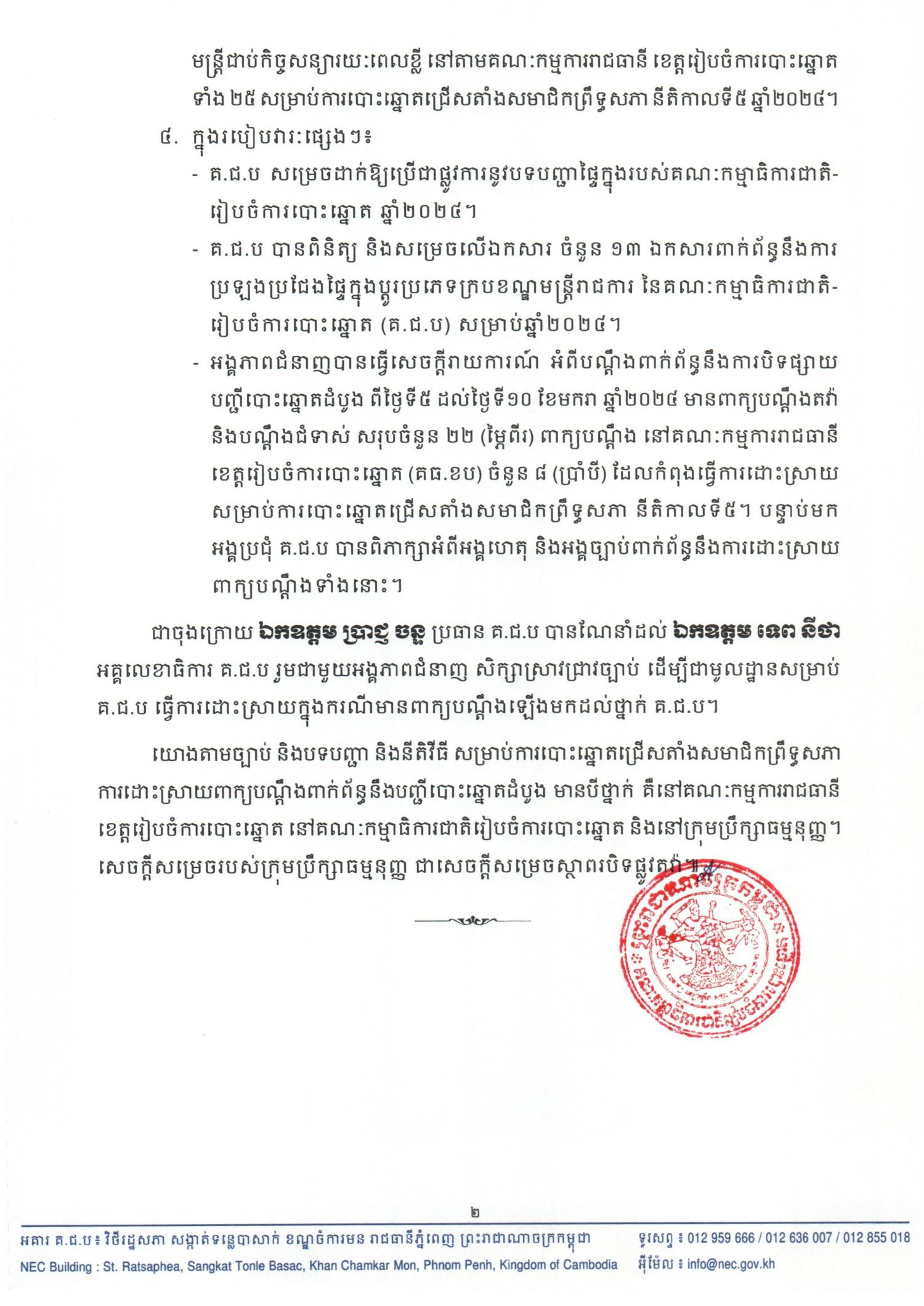 * អង្គភាពជំនាញបានធ្វើសេចក្តីរាយការណ៍ អំពីបណ្តឹងពាក់ព័ន្ធនឹងការបិទផ្សាយបញ្ជីបោះឆ្នោតដំបូង ពីថ្ងៃទី៥ ដល់ថ្ងៃទី១០ ខែមករា ឆ្នាំ២០២៤ មានពាក្យបណ្តឹងតវ៉ា និងបណ្តឹងជំទាស់ សរុបចំនួន ២២ (ម្ភៃពីរ) ពាក្យបណ្តឹង នៅគណៈកម្មការរាជធានី ខេត្តរៀបចំការបោះឆ្នោត (គធ.ខប) ចំនួន ៨ (ប្រាំបី) ដែលកំពុងធ្វើការដោះស្រាយ សម្រាប់ការបោះឆ្នោតជ្រើសតាំងសមាជិកព្រឹទ្ធសភា នីតិកាលទី៥។ បន្ទាប់មកអង្គប្រជុំ គ.ជ.ប បានពិភាក្សាអំពីអង្គហេតុ និងអង្គច្បាប់ពាក់ព័ន្ធនឹងការដោះស្រាយពាក្យបណ្តឹងទាំងនោះ។