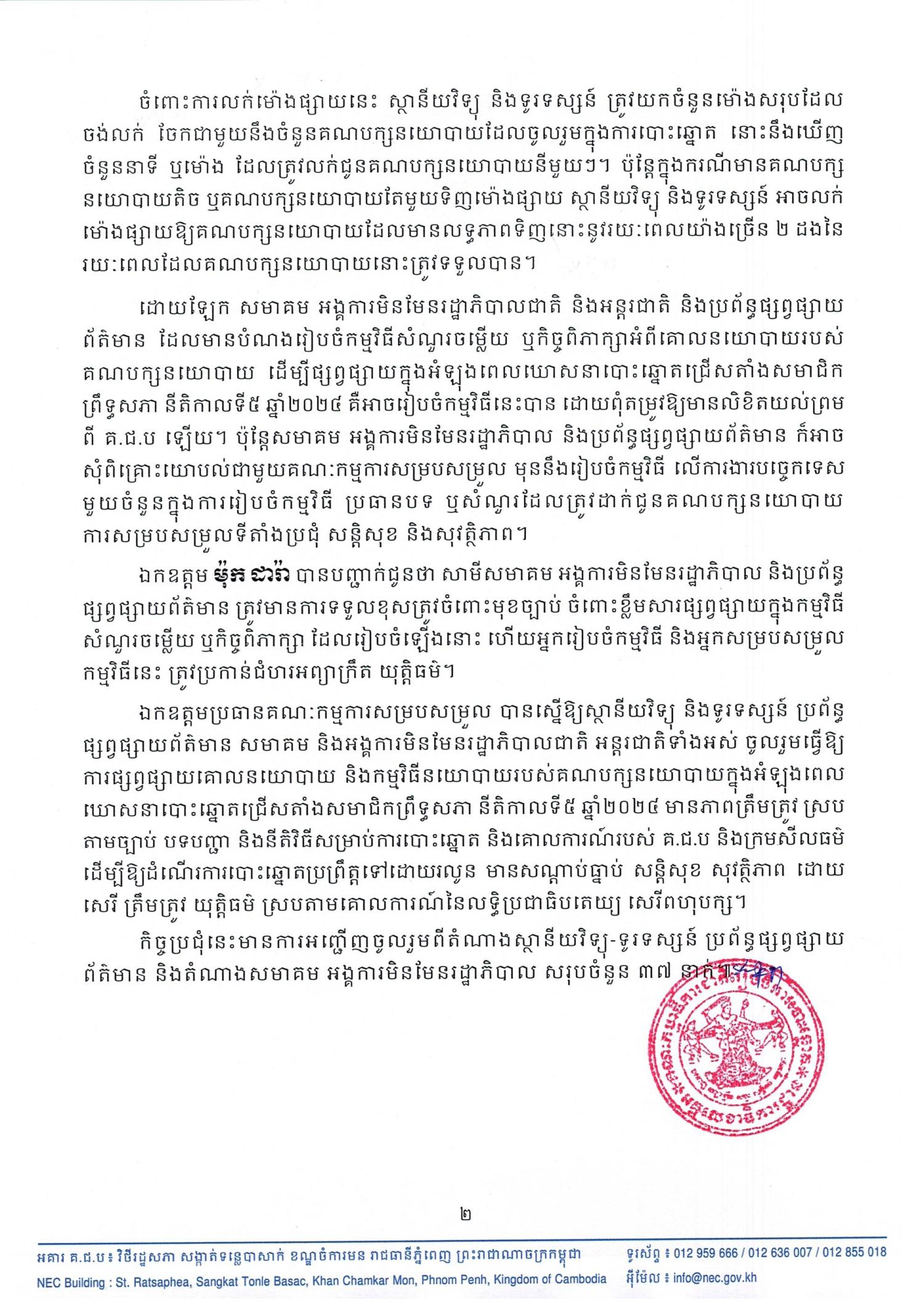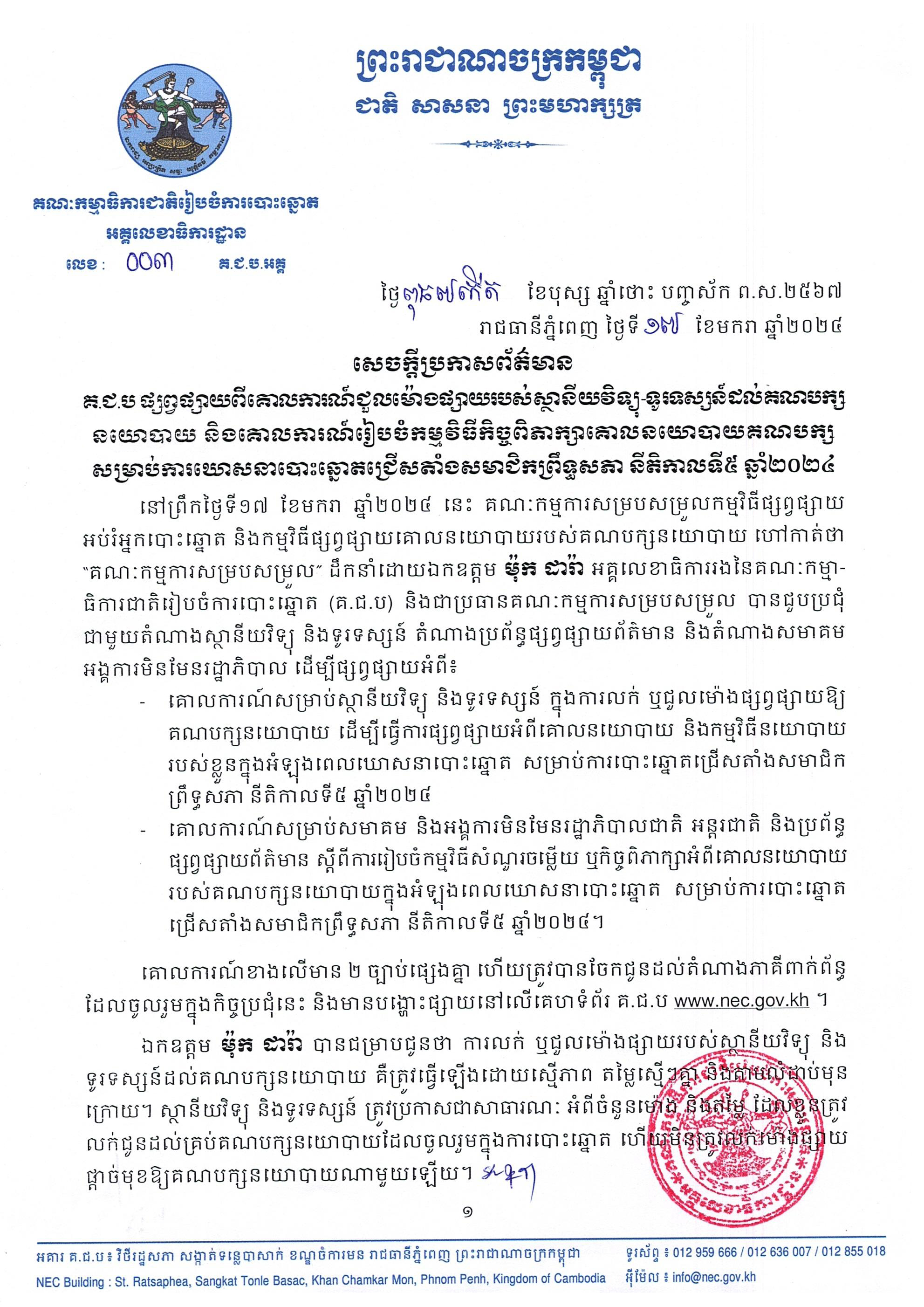 ឯកឧត្ដមប្រធានគណៈកម្មការសម្របសម្រួល បានស្នើឱ្យស្ថានីយវិទ្យុ និងទូរទស្សន៍ ប្រព័ន្ធផ្សាយផ្សាយព័ត៌មាន សមាគម និងអង្គការមិនមែនរដ្ឋាភិបាលជាតិ អន្តរជាតិទាំងអស់ ចូលរួមធ្វើឱ្យ ការផ្សព្វផ្សាយគោលនយោបាយ និងកម្មវិធីនយោបាយរបស់គណបក្សនយោបាយក្នុងអំឡុងពេលឃោសនាបោះឆ្នោតជ្រើសតាំងសមាជិកព្រឹទ្ធសភា នីតិកាលទី៥ ឆ្នាំ២០២៤ មានភាពត្រឹមត្រូវ ស្របតាមច្បាប់ បទបញ្ជា និងនីតិវិធីសម្រាប់ការបោះឆ្នោត និងគោលការណ៍របស់ គ.ជ.ប និងក្រមសីលធម៌ ដើម្បីឱ្យដំណើរការបោះឆ្នោតប្រព្រឹត្តទៅដោយរលូន មានសណ្ដាប់ធ្នាប់ សន្តិសុខ សុវត្ថិភាព ដោយសេរី ត្រឹមត្រូវ យុត្តិធម៌ ស្របតាមគោលការណ៍នៃលទិ្ធប្រជាធិបតេយ្យ សេរីពហុបក្ស។
