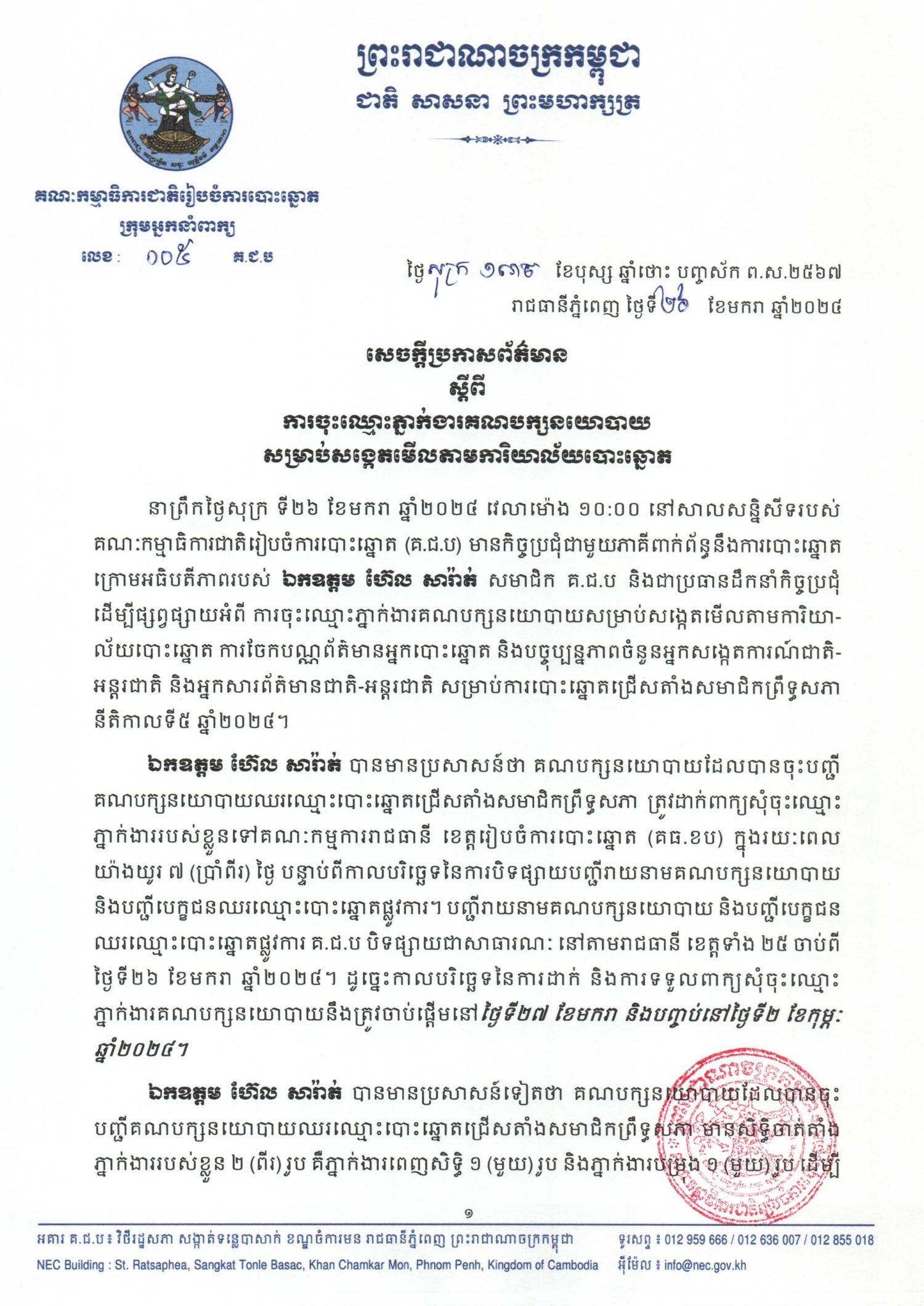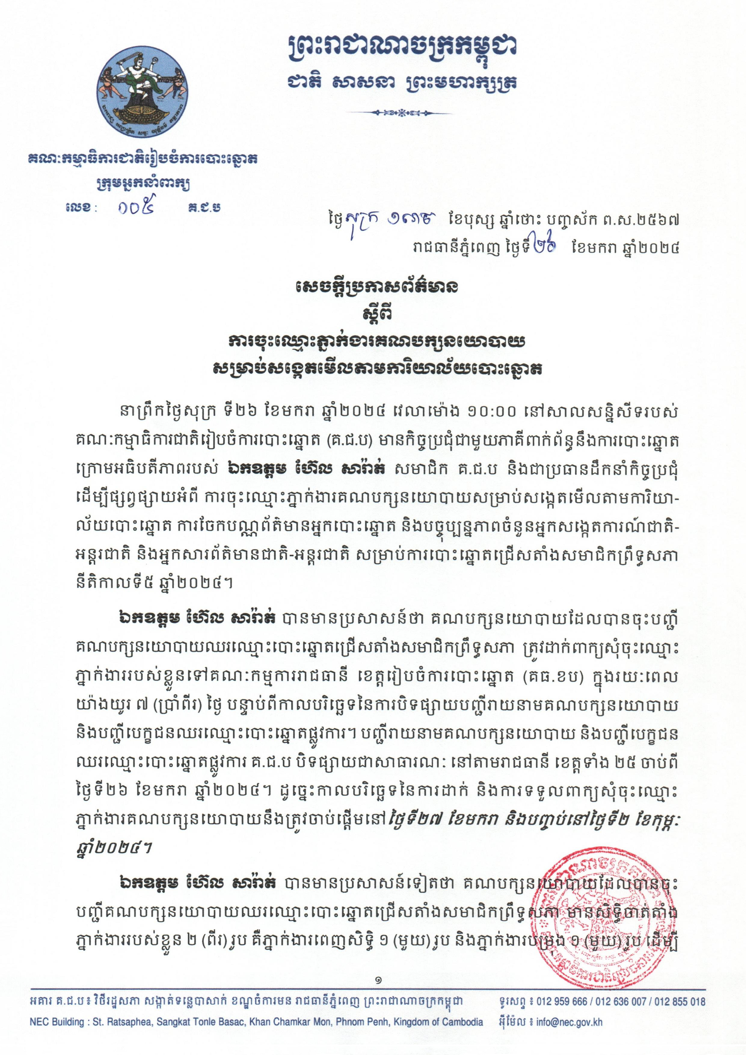 ឯកឧត្ដម ហ៊ែល សារ៉ាត់ បានមានប្រសាសន៍ថា គណបក្សនយោបាយដែលបានចុះបញ្ជីគណបក្សនយោបាយឈរឈ្មោះបោះឆ្នោតជ្រើសតាំងសមាជិកព្រឹទ្ធសភា ត្រូវដាក់ពាក្យសុំចុះឈ្មោះ ភ្នាក់ងាររបស់ខ្លួនទៅគណៈកម្មការរាជធានី ខេត្តរៀបចំការបោះឆ្នោត (គធ.ខប) ក្នុងរយៈពេលយ៉ាងយូរ ៧ (ប្រាំពីរ) ថ្ងៃ បន្ទាប់ពីកាលបរិច្ឆេទនៃការបិទផ្សាយបញ្ជីរាយនាមគណបក្សនយោបាយ និងបញ្ជីបេក្ខជនឈរឈ្មោះបោះឆ្នោតផ្លូវការ។ បញ្ជីរាយនាមគណបក្សនយោបាយ និងបញ្ជីបេក្ខជន ឈរឈ្មោះបោះឆ្នោតផ្លូវការ គ.ជ.ប បិទផ្សាយជាសាធារណៈ នៅតាមរាជធានី ខេត្តទាំង ២៥ ចាប់ពី ថ្ងៃទី២៦ ខែមករា ឆ្នាំ២០២៤។ ដូច្នេះកាលបរិច្ឆេទនៃការដាក់ និងការទទួលពាក្យសុំចុះឈ្មោះភ្នាក់ងារគណបក្សនយោបាយនឹងត្រូវចាប់ផ្តើមនៅថ្ងៃទី២៧ ខែមករា និងបញ្ចប់នៅថ្ងៃទី២ ខែកុម្ភៈ ឆ្នាំ២០២៤។