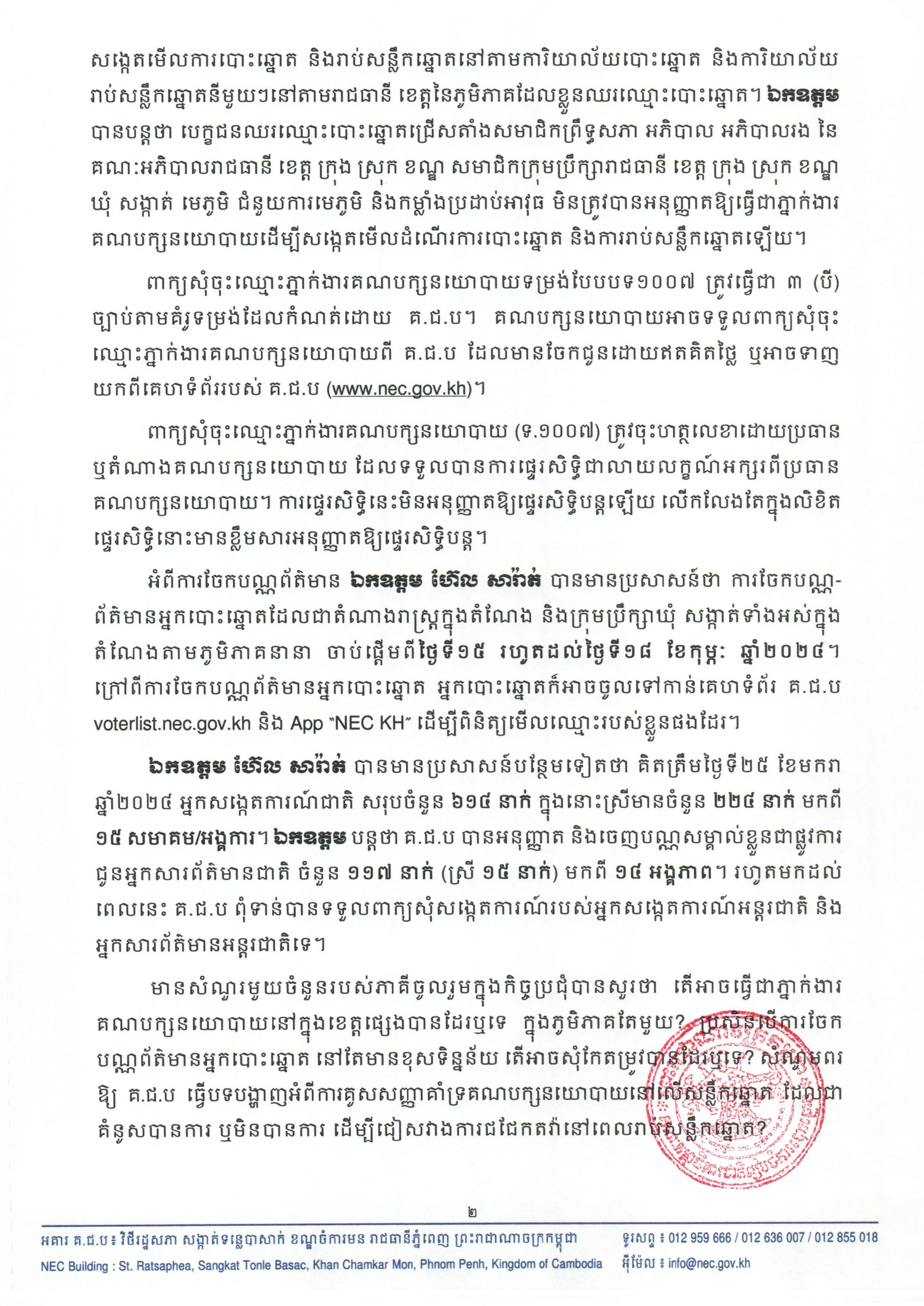 ឯកឧត្ដម ហ៊ែល សារ៉ាត់ បានមានប្រសាសន៍បន្ថែមទៀតថា គិតត្រឹមថ្ងៃទី២៥ ខែមករា ឆ្នាំ២០២៤ អ្នកសង្កេតការណ៍ជាតិ សរុបចំនួន ៦១៤ នាក់ ក្នុងនោះស្រីមានចំនួន ២២៤ នាក់ មកពី ១៥ សមាគម/អង្គការ។ ឯកឧត្ដម បន្តថា គ.ជ.ប បានអនុញ្ញាត និងចេញបណ្ណសម្គាល់ខ្លួនជាផ្លូវការជូនអ្នកសារព័ត៌មានជាតិ ចំនួន ១១៧ នាក់ (ស្រី ១៥ នាក់) មកពី ១៤ អង្គភាព។ រហូតមកដល់ពេលនេះ គ.ជ.ប ពុំទាន់បានទទួលពាក្យសុំសង្កេតការណ៍របស់អ្នកសង្កេតការណ៍អន្តរជាតិ និងអ្នកសារព័ត៌មានអន្តរជាតិទេ។