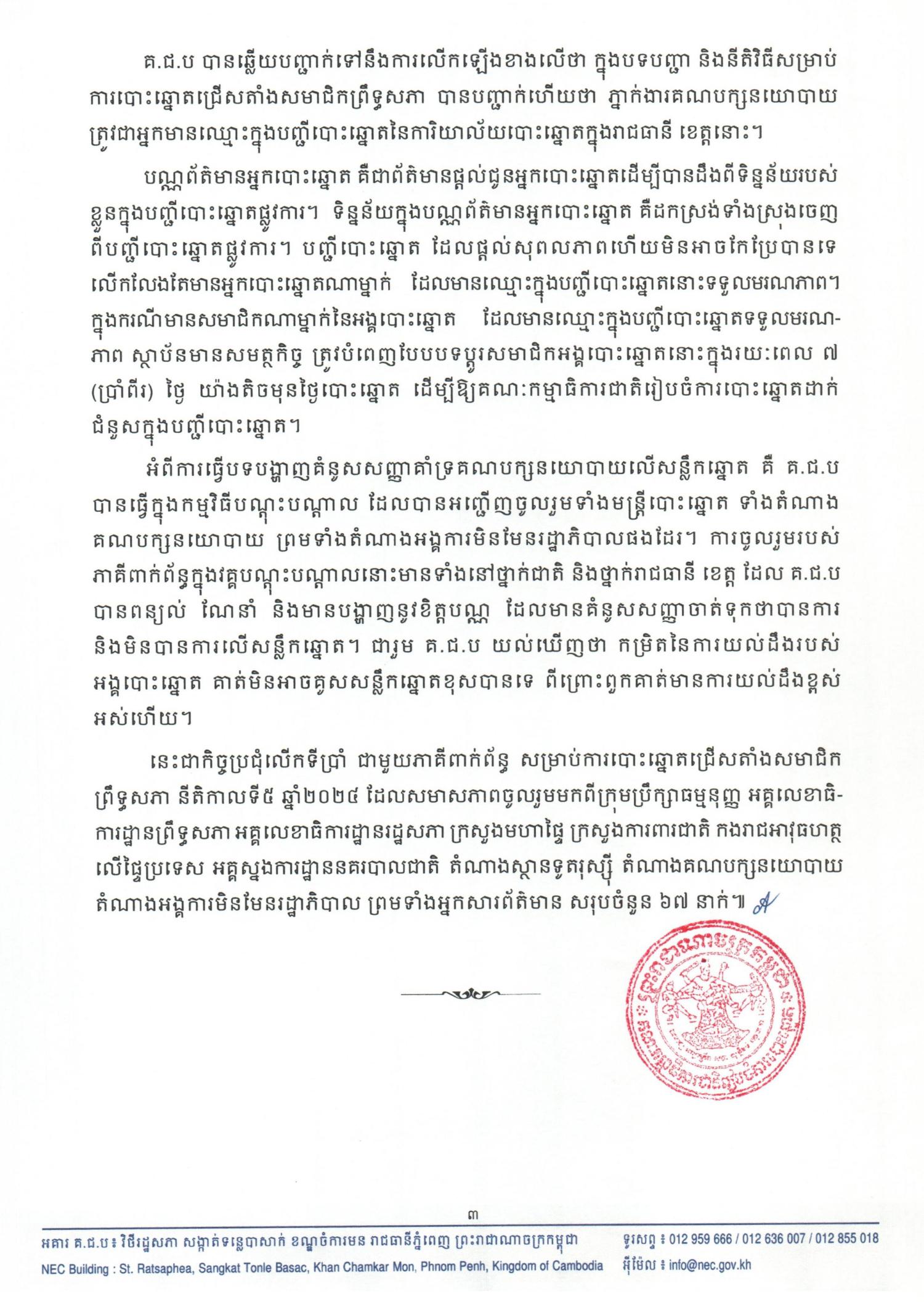 គ.ជ.ប បានឆ្លើយបញ្ជាក់ទៅនឹងការលើកឡើងខាងលើថា ក្នុងបទបញ្ជា និងនីតិវិធីសម្រាប់ ការបោះឆ្នោតជ្រើសតាំងសមាជិកព្រឹទ្ធសភា បានបញ្ជាក់ហើយថា ភ្នាក់ងារគណបក្សនយោបាយ ត្រូវជាអ្នកមានឈ្មោះក្នុងបញ្ជីបោះឆ្នោតនៃការិយាល័យបោះឆ្នោតក្នុងរាជធានី ខេត្តនោះ។