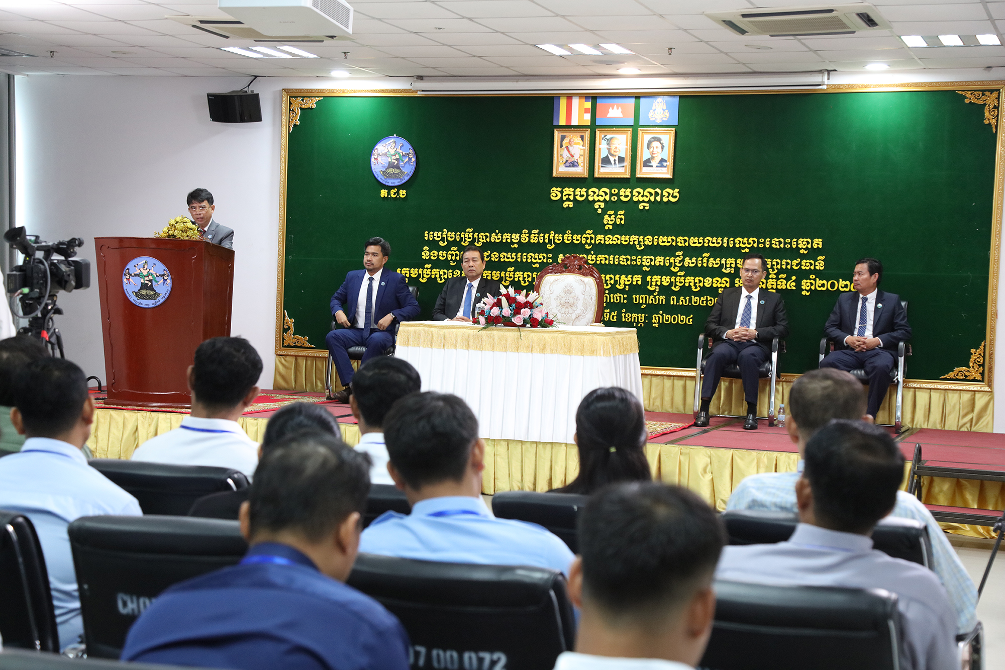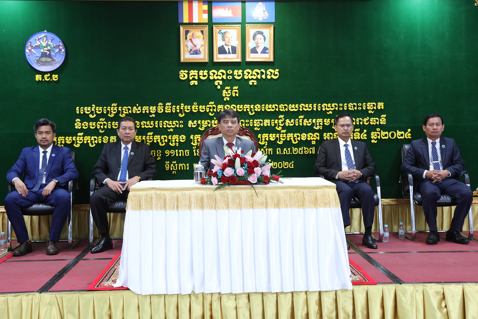 រូបភាពសកម្មភាព ឯកឧត្តម តុប ឫទ្ធី អគ្គនាយកនៃអគ្គនាយកដ្ឋានសេវាកម្មច្បាប់ និងបច្ចេកទេស អញ្ជើញជាអធិបតី ក្នុងពិធីបើកវគ្គបណ្តុះបណ្តាល ស្តីពីរបៀបប្រើប្រាស់កម្មវិធីរៀបចំបញ្ជីគណបក្សនយោបាយឈរឈ្មោះបោះឆ្នោត និងបញ្ជីបេក្ខជនឈរឈ្មោះ សម្រាប់ការបោះឆ្នោតជ្រើសរើសក្រុមប្រឹក្សារាជធានី ក្រុមប្រឹក្សាខេត្ត ក្រុមប្រឹក្សាក្រុង ក្រុមប្រឹក្សាស្រុក ក្រុមប្រឹក្សាខណ្ឌ អាណត្តិទី៤ ឆ្នាំ២០២៤ នៅទីស្ដីការ គ.ជ.ប នាព្រឹកថ្ងៃទី៥ ខែកុម្ភៈ ឆ្នាំ២០២៤