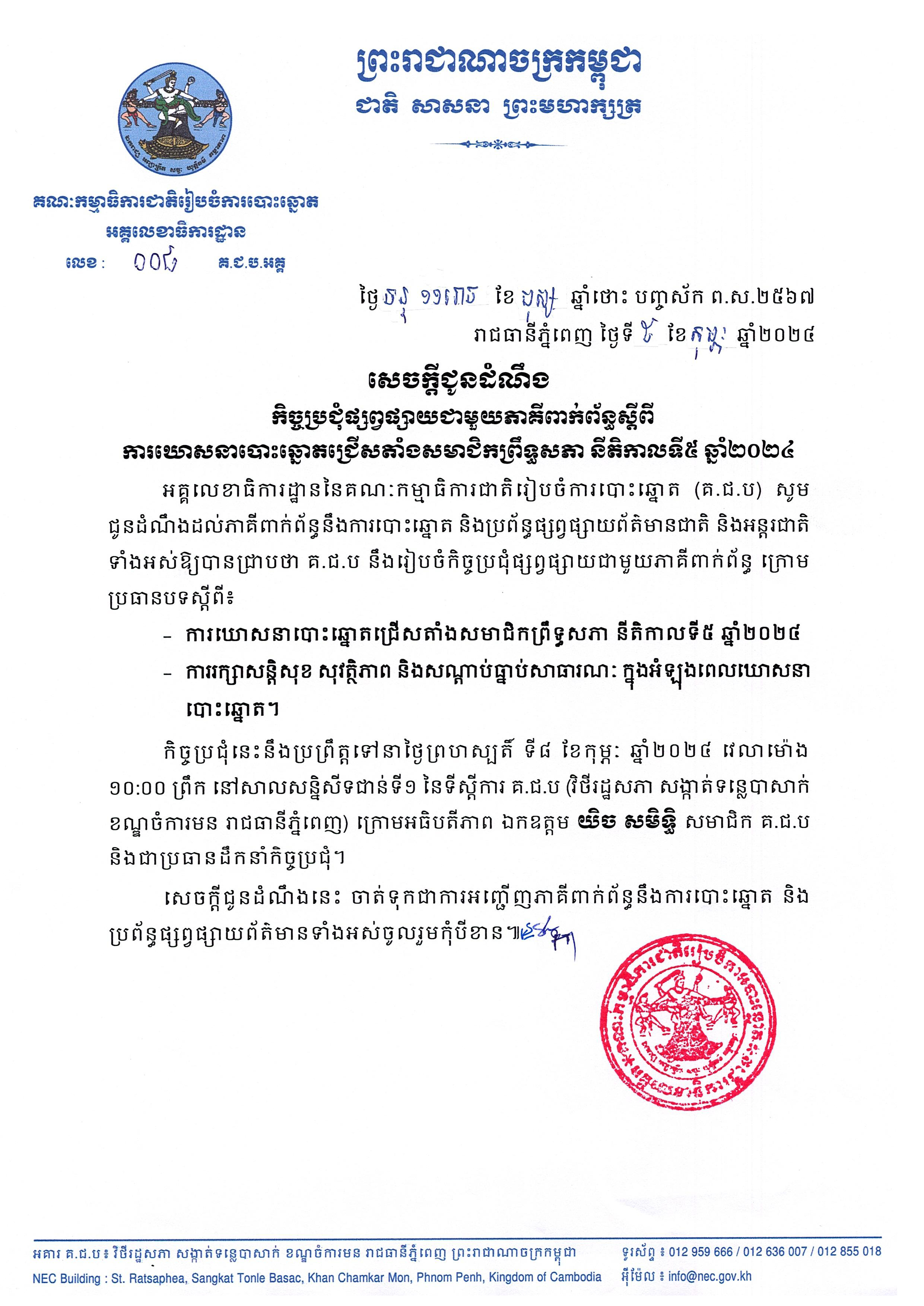 អគ្គលេខាធិការដ្ឋាននៃគណៈកម្មាធិការជាតិរៀបចំការបោះឆ្នោត (គ.ជ.ប) សូមជូនដំណឹងដល់ភាគីពាក់ព័ន្ធនឹងការបោះឆ្នោត និងប្រព័ន្ធផ្សព្វផ្សាយព័ត៌មានជាតិ និងអន្តរជាតិទាំងអស់ឱ្យបានជ្រាបថា គ.ជ.ប នឹងរៀបចំកិច្ចប្រជុំផ្សព្វផ្សាយជាមួយភាគីពាក់ព័ន្ធ ក្រោមប្រធានបទស្តីពី៖