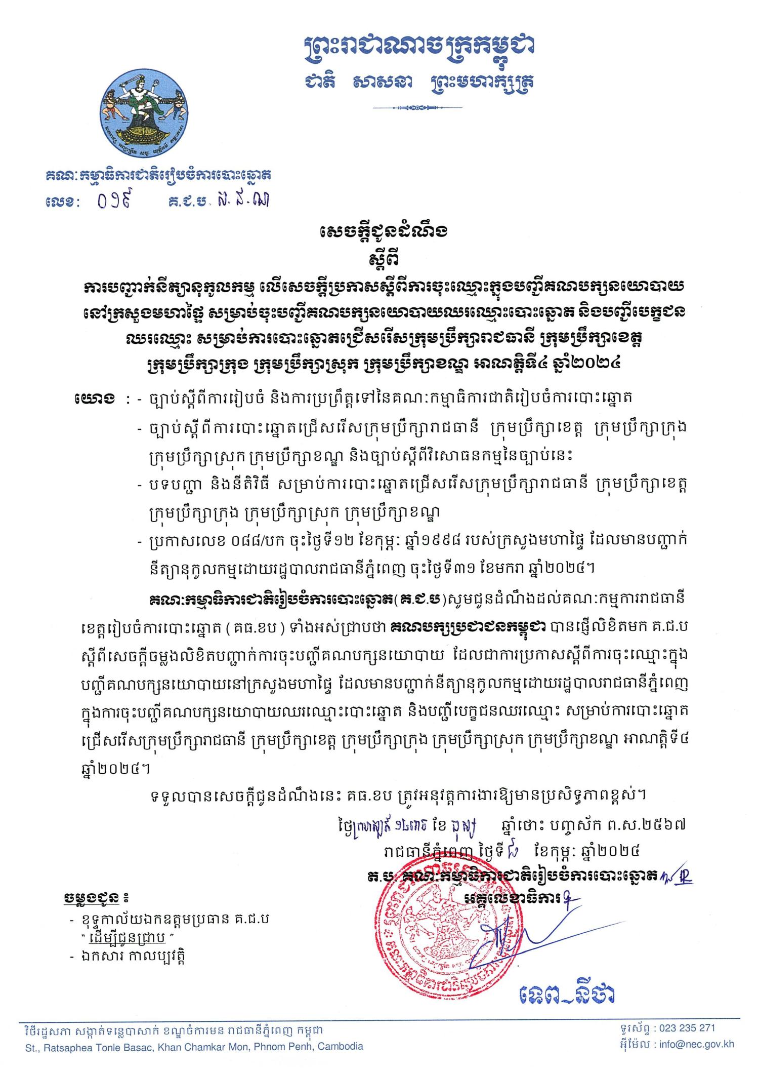 សេចក្តីជូនដំណឹងលេខ ០១៩ គ.ជ.ប.ស.ណ.ន ស្តីពីការបញ្ជាក់នីត្យានុកូលកម្មលើសេចក្ដីប្រកាសស្ដីពីការចុះឈ្មោះក្នុងបញ្ជីគណបក្សនយោបាយនៅក្រសួងមហាផ្ទៃ សម្រាប់ចុះបញ្ជីគណបក្សនយោបាយឈរឈ្មោះបោះឆ្នោត និងបញ្ជីបេក្ខជន ឈរឈ្មោះ សម្រាប់ការបោះឆ្នោតជ្រើសរើសក្រុមប្រឹក្សារាជធានី ក្រុមប្រឹក្សាខេត្ត ក្រុមប្រឹក្សាក្រុង ក្រុមប្រឹក្សាស្រុក ក្រុមប្រឹក្សាខណ្ឌ អាណត្តិទី៤ ឆ្នាំ២០២៤