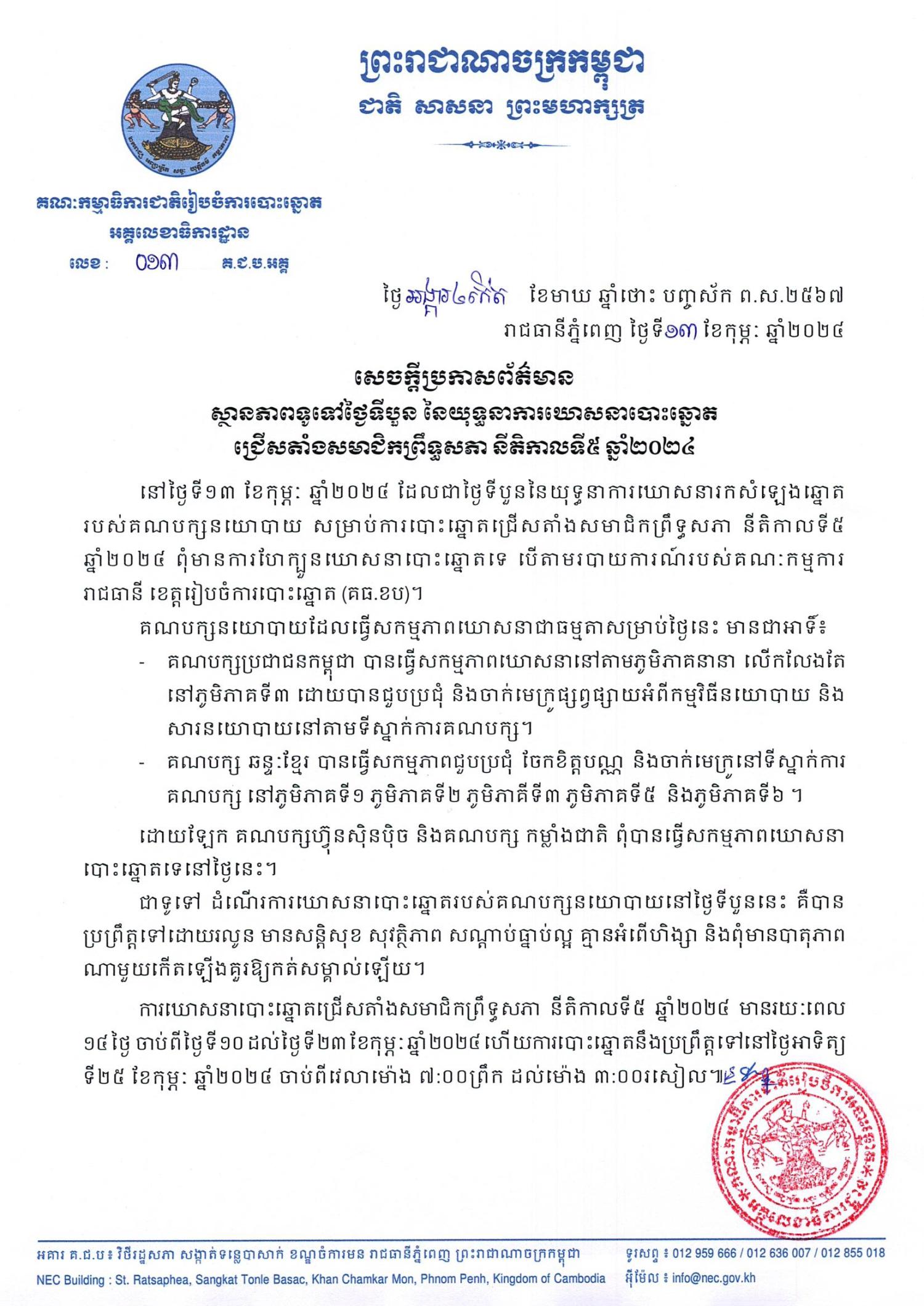 នៅថ្ងៃទី១៣ ខែកុម្ភៈ ឆ្នាំ២០២៤ ដែលជាថ្ងៃទីបួននៃយុទ្ធនាការឃោសនារកសំឡេងឆ្នោតរបស់គណបក្សនយោបាយ សម្រាប់ការបោះឆ្នោតជ្រើសតាំងសមាជិកព្រឹទ្ធសភា នីតិកាលទី៥ ឆ្នាំ២០២៤ ពុំមានការហែក្បួនឃោសនាបោះឆ្នោតទេ បើតាមរបាយការណ៍របស់គណៈកម្មការរាជធានី ខេត្តរៀបចំការបោះឆ្នោត (គធ.ខប)។