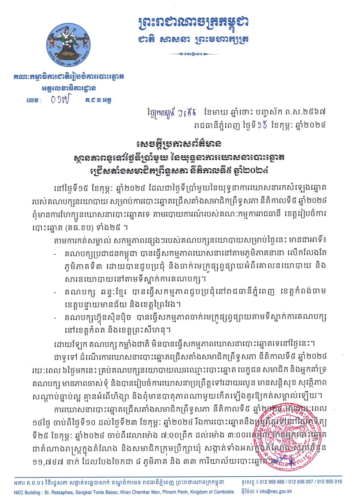 សេចក្តីប្រកាសព័ត៌មានលេខ ០១៧ គ.ជ.ប.អគ្គ៖ ស្ថានភាពទូទៅថ្ងៃទីប្រាំមួយ នៃយុទ្ធនាការឃោសនាបោះឆ្នោតជ្រើសតាំងសមាជិកព្រឹទ្ធសភា នីតិកាលទី៥ ឆ្នាំ២០២៤