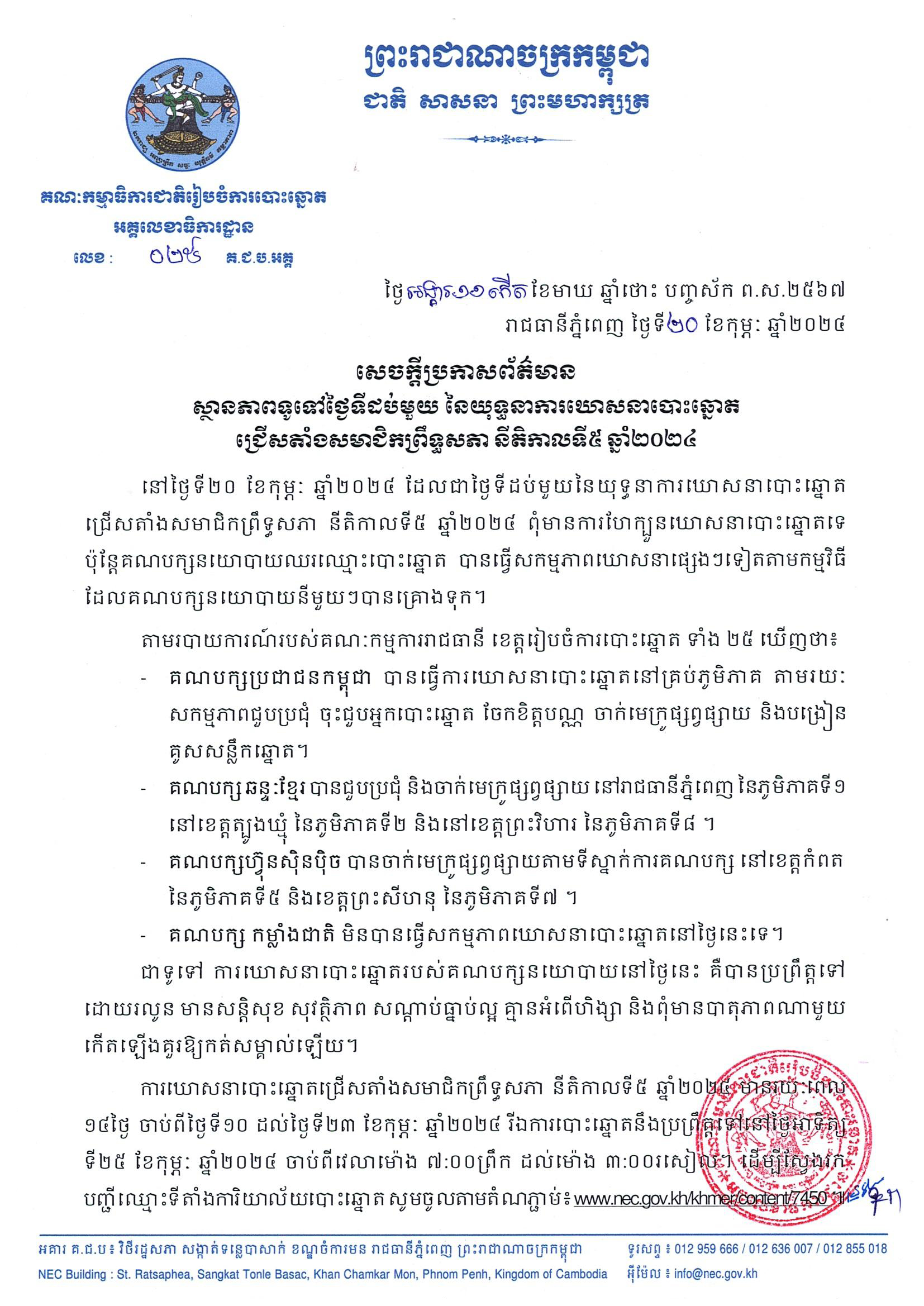 នៅថ្ងៃទី២០ ខែកុម្ភៈ ឆ្នាំ២០២៤ ដែលជាថ្ងៃទីដប់មួយនៃយុទ្ធនាការឃោសនាបោះឆ្នោតជ្រើសតាំងសមាជិកព្រឹទ្ធសភា នីតិកាលទី៥ ឆ្នាំ២០២៤ ពុំមានការហែក្បួនឃោសនាបោះឆ្នោតទេ ប៉ុន្តែគណបក្សនយោបាយឈរឈ្មោះបោះឆ្នោត បានធ្វើសកម្មភាពឃោសនាផ្សេងៗទៀតតាមកម្មវិធីដែលគណបក្សនយោបាយនីមួយៗបានគ្រោងទុក។