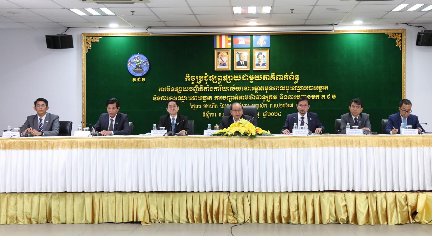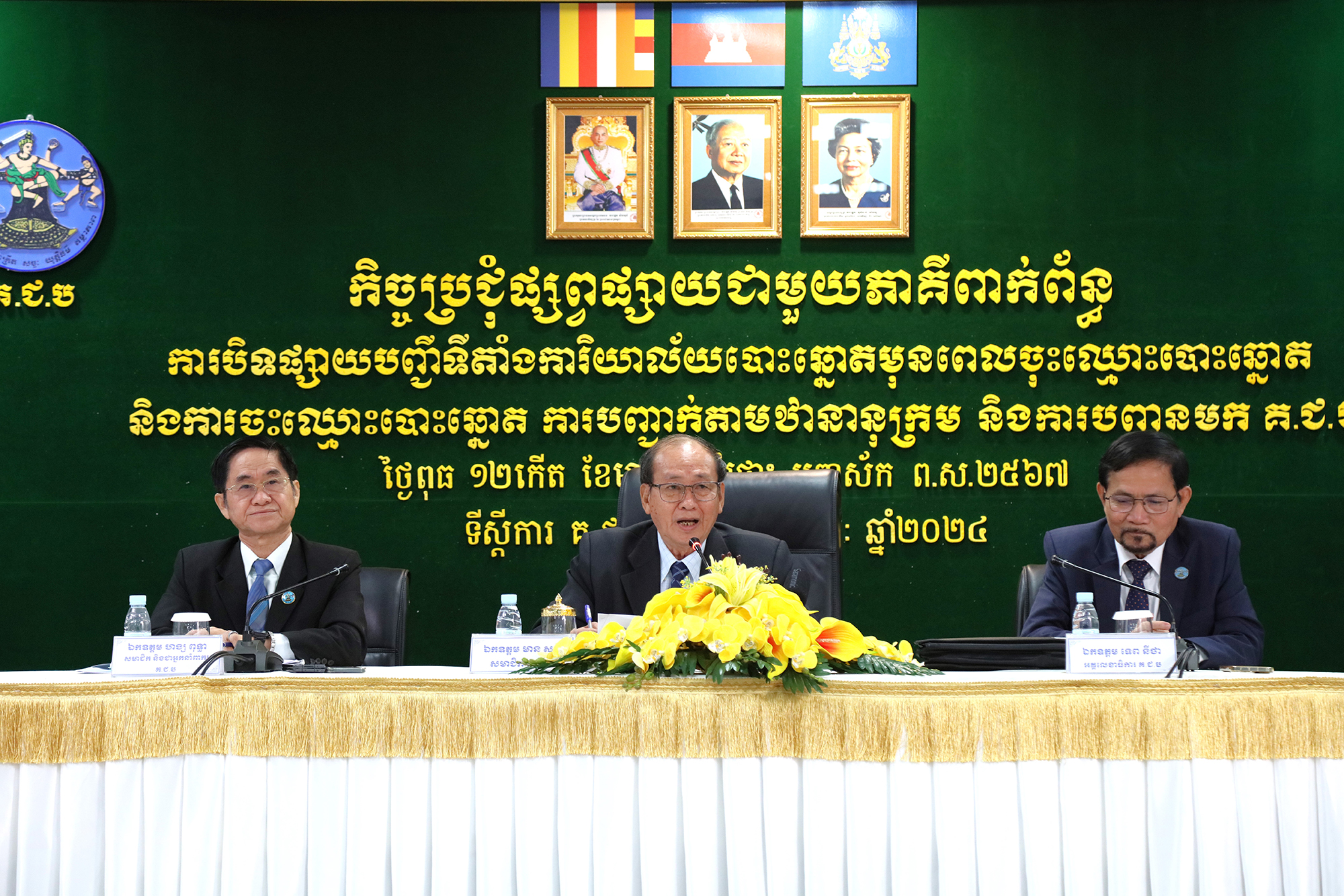 រូបភាពសកម្មភាព ឯកឧត្ដម មាន សទិ សមាជិក គ.ជ.ប បានដឹកនាំកិច្ចប្រជុំផ្សព្វផ្សាយជាមួយភាគីពាក់ព័ន្ធ ស្ដីពីការបិទផ្សាយបញ្ជីទីតាំងការិយាល័យបោះឆ្នោតមុនពេលចុះឈ្មោះបោះឆ្នោត និងការចុះឈ្មោះបោះឆ្នោត ការបញ្ជាក់តាមឋានានុក្រម និងការបញ្ជូនមក គ.ជ.ប សម្រាប់ការបោះឆ្នោតជ្រើសរើសក្រុមប្រឹក្សារាជធានី ក្រុមប្រឹក្សាខេត្ត ក្រុមប្រឹក្សាក្រុង ក្រុមប្រឹក្សាស្រុក ក្រុមប្រឹក្សាខណ្ឌ អាណត្តិទី៤ ឆ្នាំ២០២៤ នៅទីស្ដីការ គ.ជ .ប នាព្រឹកថ្ងៃទី២១ ខែកុម្ភៈ ឆ្នាំ២០២៤