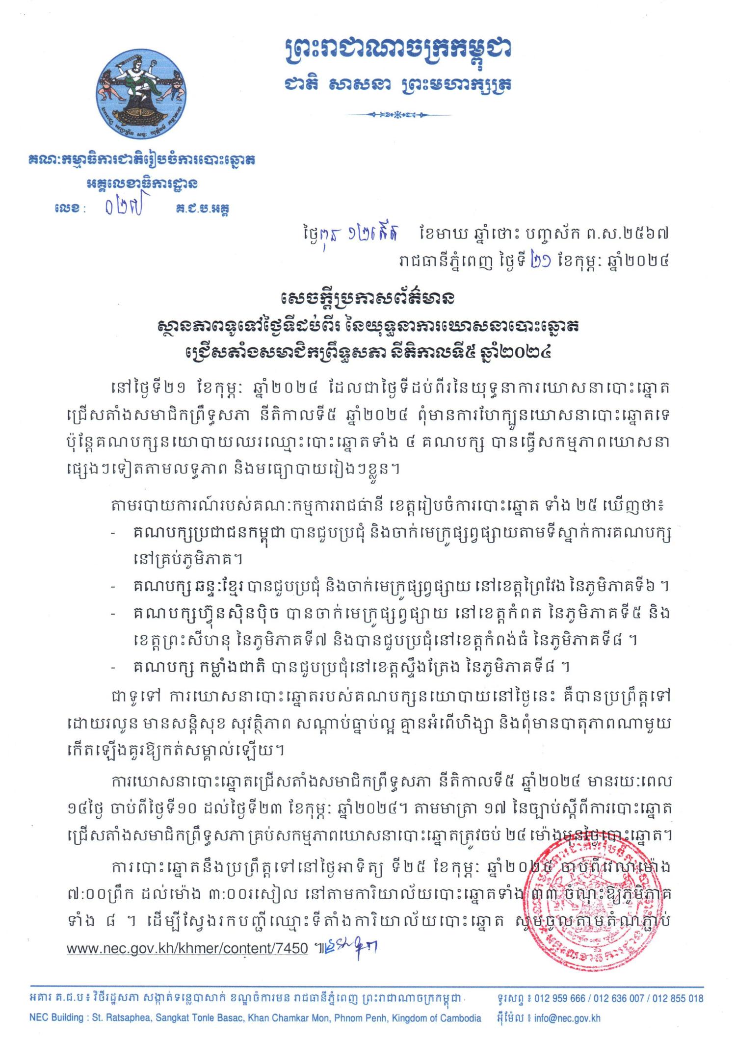 - គណបក្សប្រជាជនកម្ពុជា បានជួបប្រជុំ និងចាក់មេក្រូផ្សព្វផ្សាយតាមទីស្នាក់ការគណបក្ស នៅគ្រប់ភូមិភាគ។