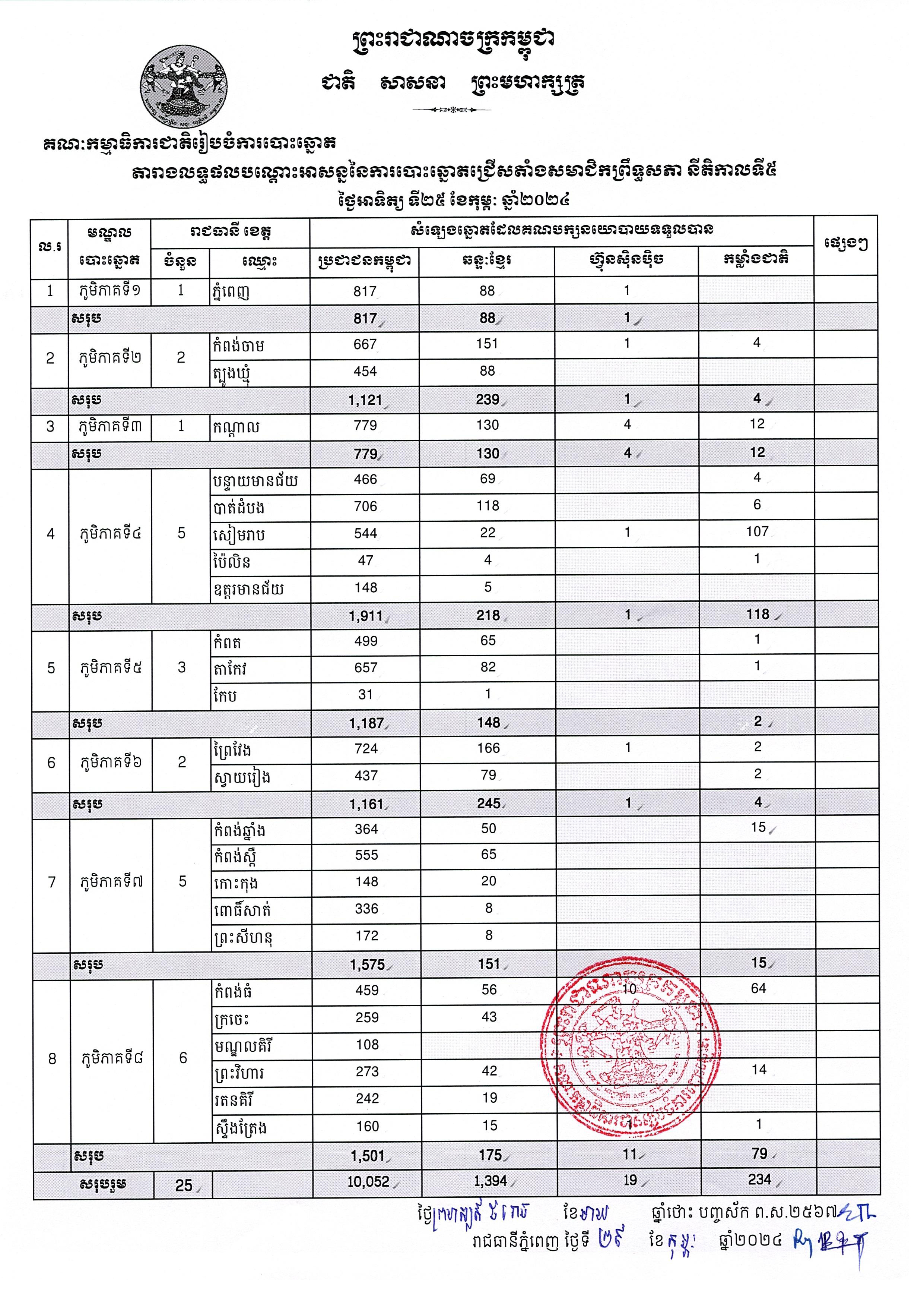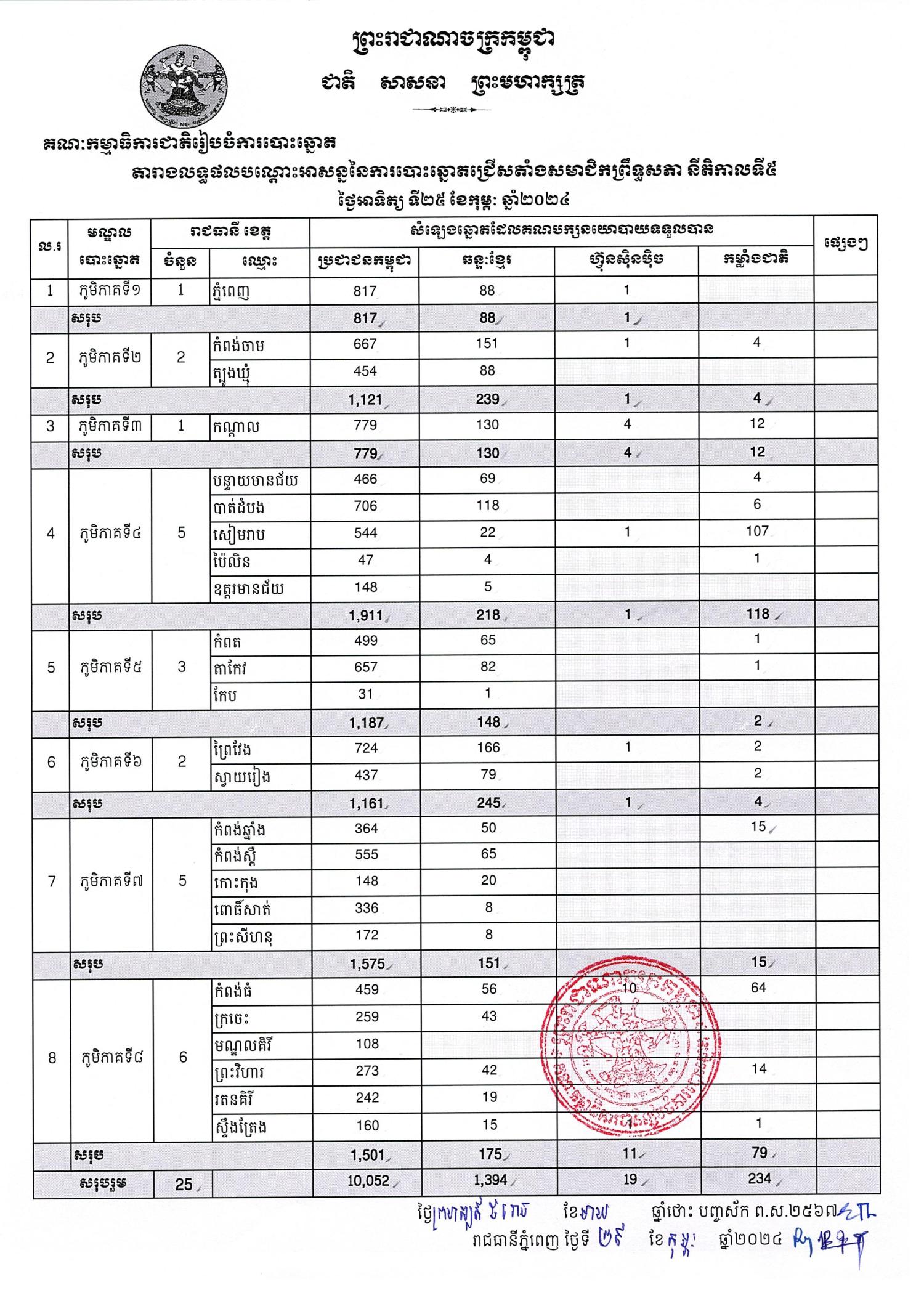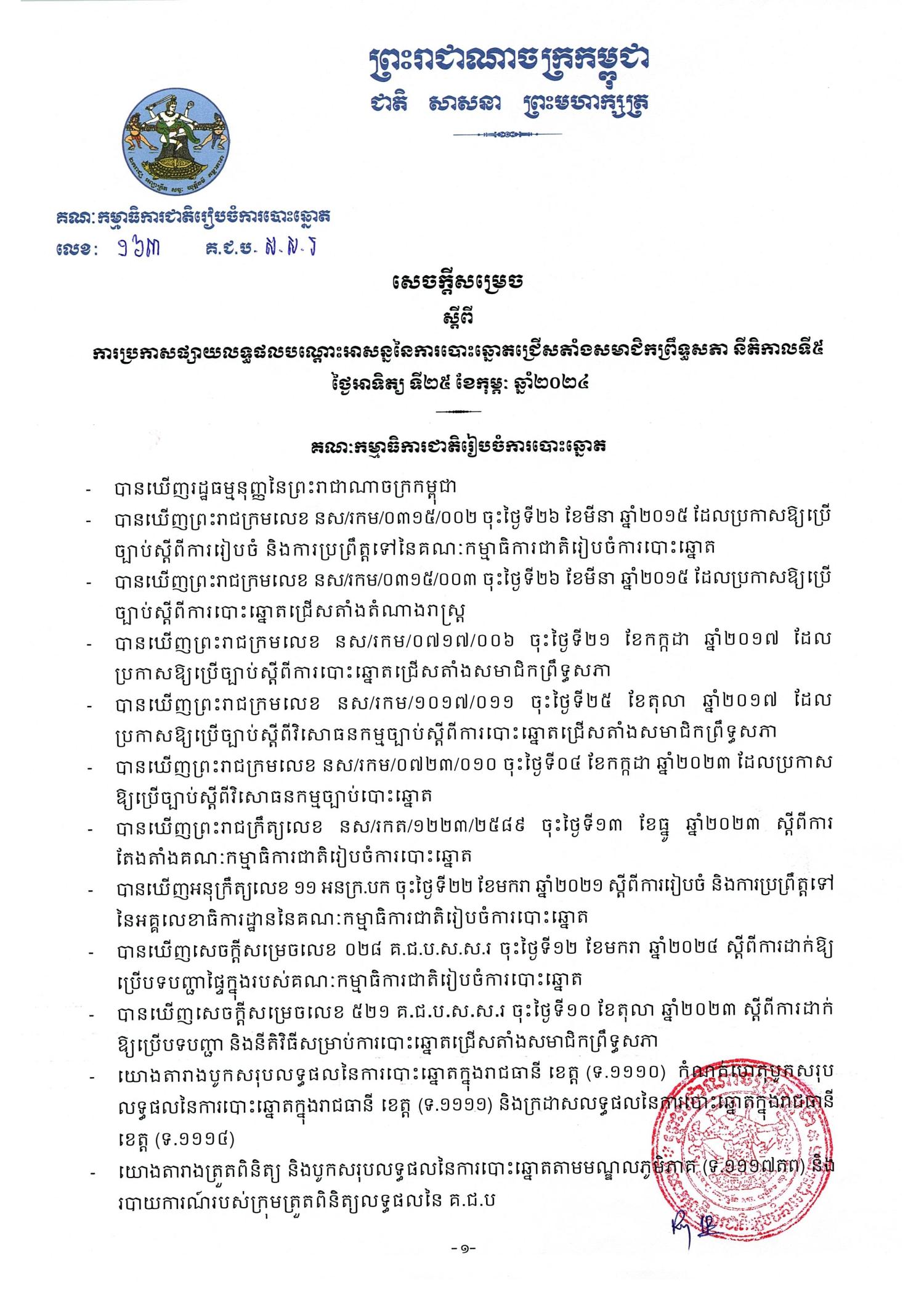 សេចក្ដីសម្រេចលេខ ១៦៣ គ.ជ.ប.ស.ស.រ ស្ដីពីការប្រកាសផ្សាយលទ្ធផលបណ្ដោះអាសន្ននៃការបោះឆ្នោតជ្រើសតាំងសមាជិកព្រឹទ្ធសភា នីតិកាលទី៥ ថ្ងៃអាទិត្យ ទី២៥ ខែកុម្ភៈ ឆ្នាំ២០២៤