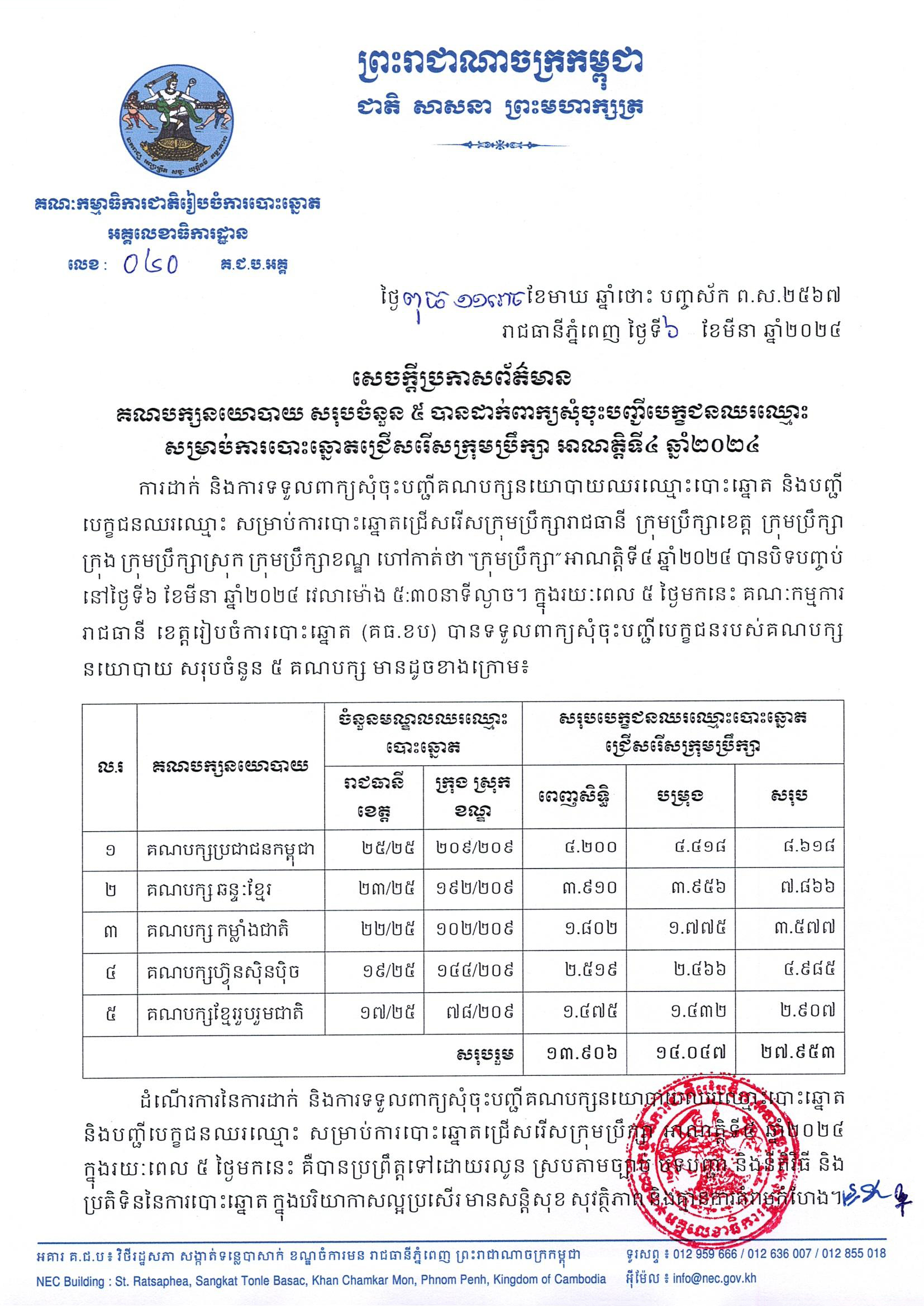សេចក្តីប្រកាសព័ត៌មានលេខ ០៤០ គ.ជ.ប.អគ្គ៖ គណបក្សនយោបាយ សរុបចំនួន ៥ បានដាក់ពាក្យសុំចុះបញ្ជីបេក្ខជនឈរឈ្មោះ សម្រាប់ការបោះឆ្នោតជ្រើសរើសក្រុមប្រឹក្សា អាណត្តិទី៤ ឆ្នាំ២០២៤