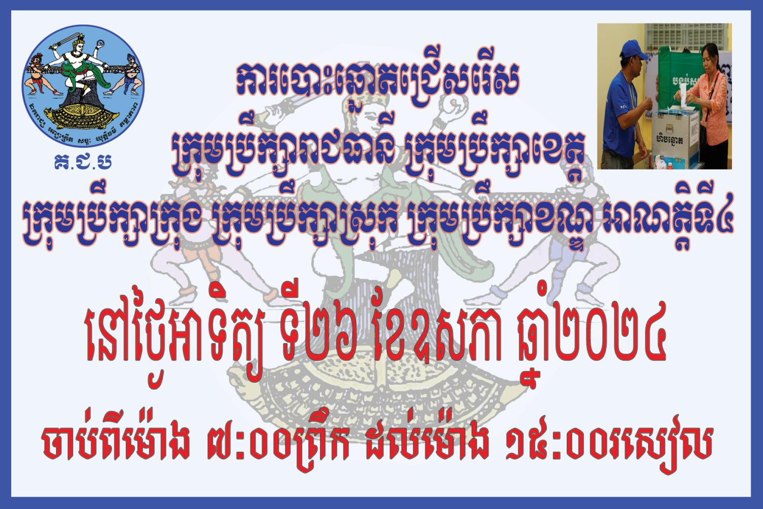 ការបោះឆ្នោតជ្រើសរើសក្រុមប្រឹក្សារាជធានី ក្រុមប្រឹក្សាខេត្ត ក្រុមប្រឹក្សាក្រុង ក្រុមប្រឹក្សាស្រុក ក្រុមប្រឹក្សាខណ្ឌ អាណត្តិទី៤ ប្រព្រឹត្តទៅនៅថ្ងៃអាទិត្យ ទី២៦ ខែឧសភា ឆ្នាំ២០២៤ ចាប់ពីម៉ោង ៧:០០ព្រឹក ដល់ម៉ោង ១៥:០០រសៀល