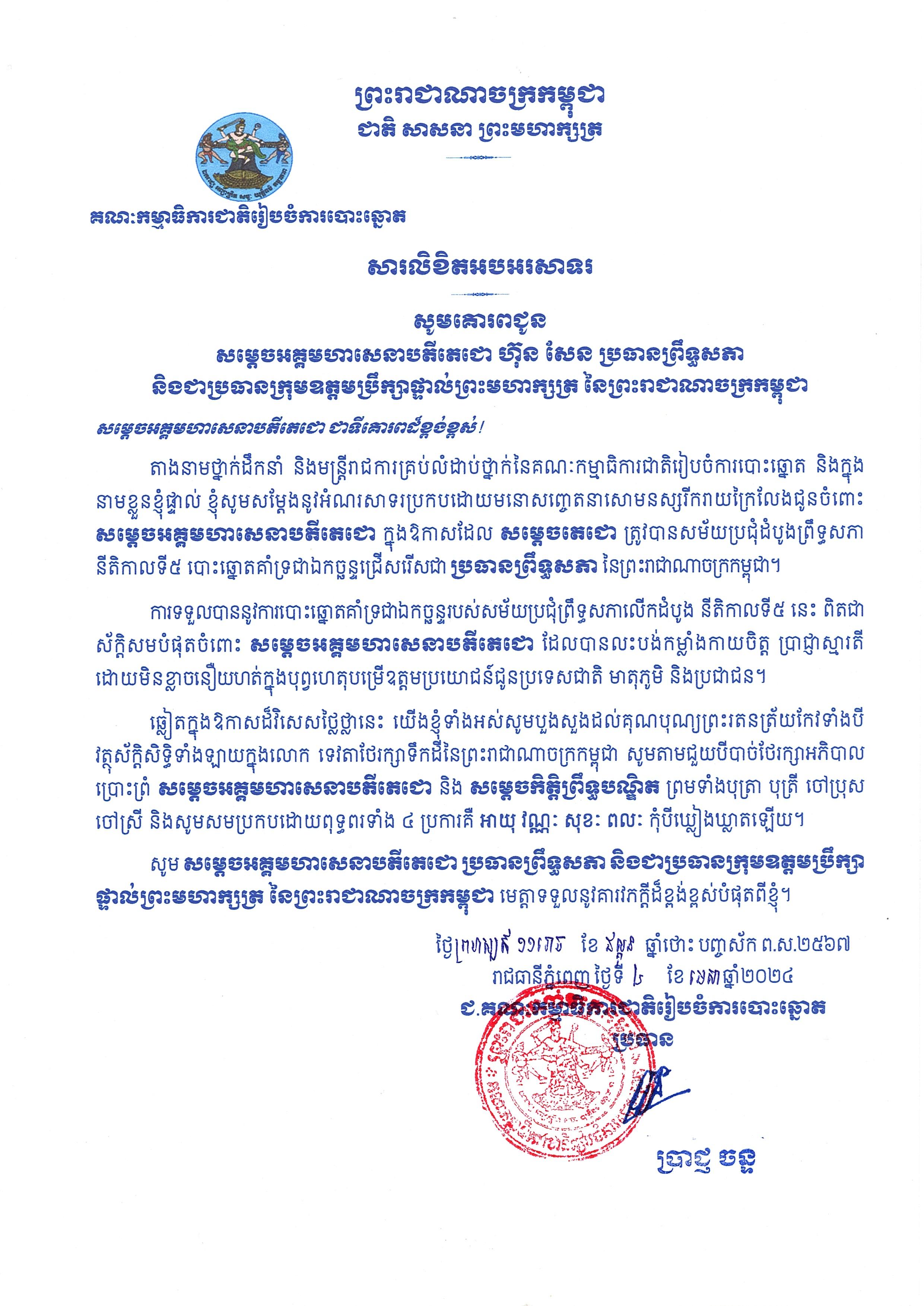 សារលិខិតអបអរសាទរ សម្តេចអគ្គមហាសេនាបតីតេជោ ហ៊ុន សែន ប្រធានព្រឹទ្ធសភា និងជាប្រធានឧត្តមប្រឹក្សាផ្ទាល់ព្រះមហាក្សត្រនៃព្រះរាជាណាចក្រកម្ពុជា
