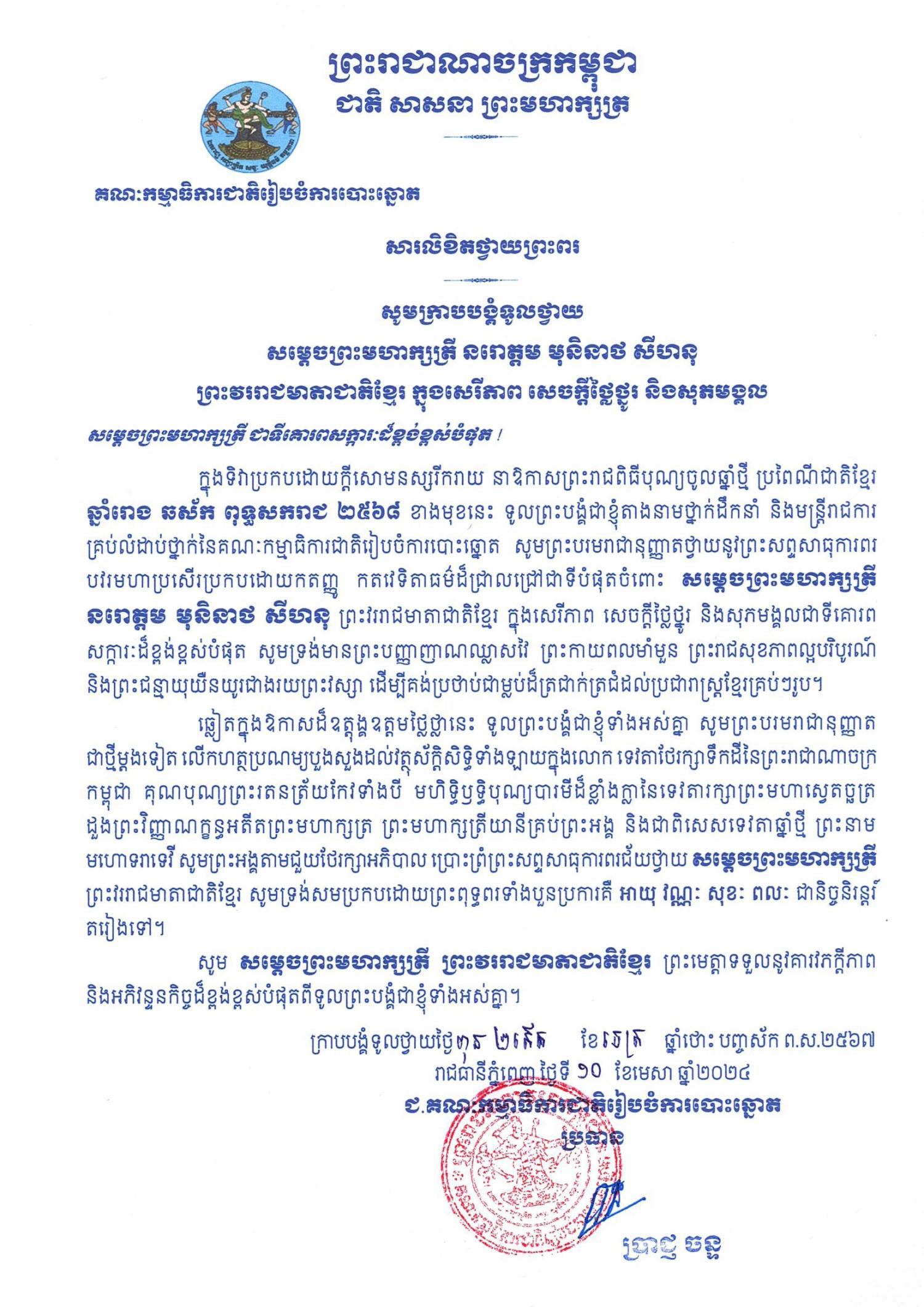 សារលិខិតថ្វាយព្រះពរ សម្តេចព្រះមហាក្សត្រី នរោត្តម មុនិនាថ សីហនុ ព្រះវររាជមាតាជាតិខ្មែរ ក្នុងសេរីភាព សេចក្តីថ្លៃថ្នូរ និងសុភមង្គល ក្នុងទិវាប្រកបដោយក្តីសោមនស្សរីករាយ នាឱកាសព្រះរាជពិធីបុណ្យចូលឆ្នាំថ្មី ប្រពៃណីជាតិខ្មែរ ឆ្នាំរោង ឆស័ក ពុទ្ធសករាជ ២៥៦៨ ខាងមុខនេះ