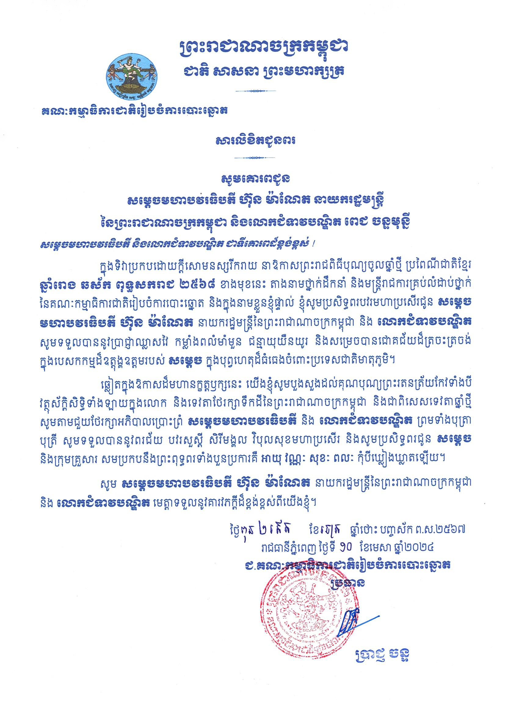 សារលិខិតជូនពរ សម្តេចមហាបវរធិបតី ហ៊ុន ម៉ាណែត នាយករដ្ឋមន្ត្រី នៃព្រះរាជាណាចក្រកម្ពុជា និងលោកជំទាវបណ្ឌិត ពេជ ចន្ទមុន្នី ក្នុងទិវាប្រកបដោយក្តីសោមនស្សរីករាយ នាឱកាសព្រះរាជពិធីបុណ្យចូលឆ្នាំថ្មី ប្រពៃណីជាតិខ្មែរ ឆ្នាំរោង ឆស័ក ពុទ្ធសករាជ ២៥៦៨ ខាងមុខនេះ
