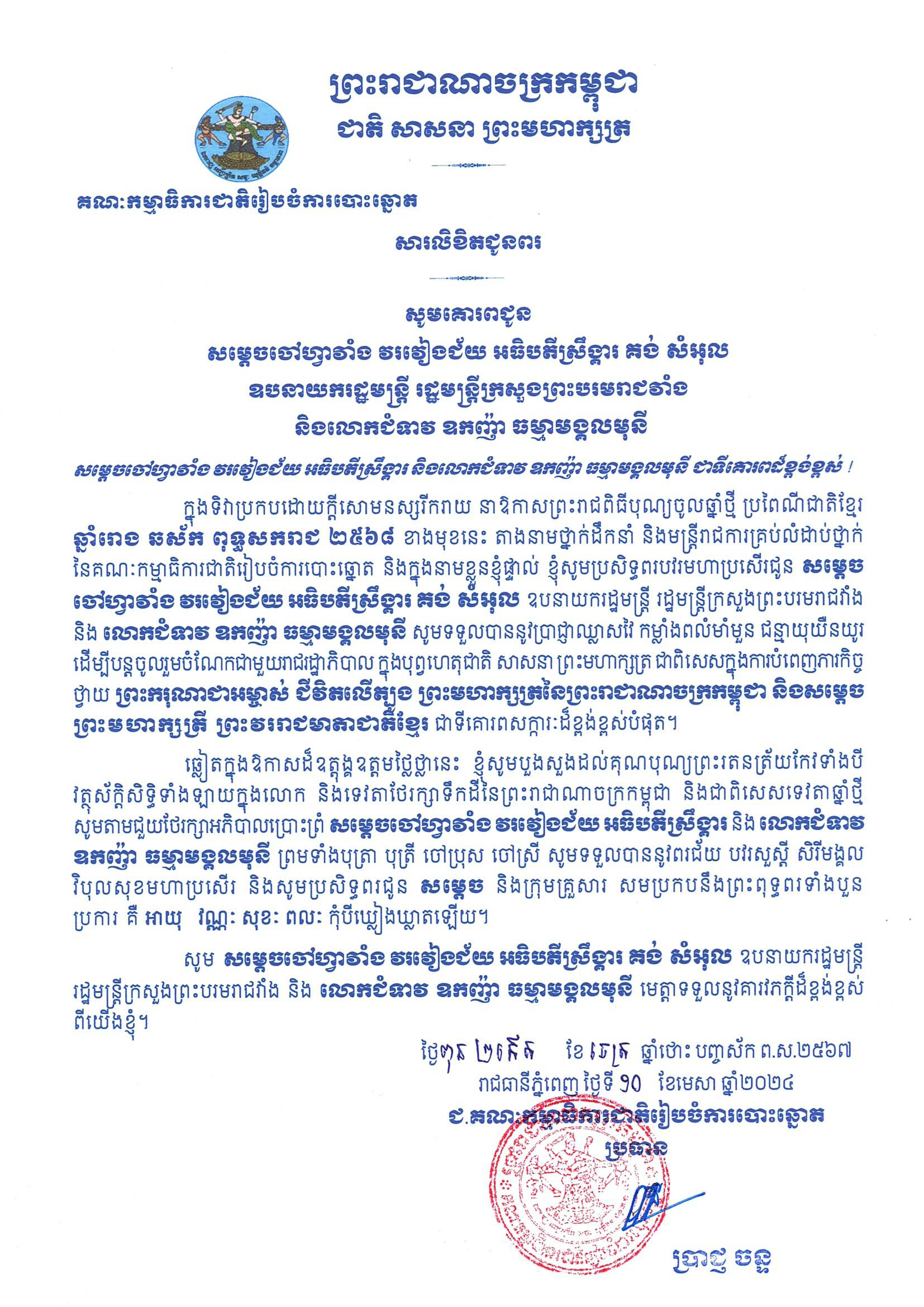 សារលិខិតជូនពរ សម្តេចចៅហ្វាវាំង វរវៀងជ័យ អធិបតីស្រឹង្គារ គង់ សំអុល ឧបនាយករដ្ឋមន្ត្រី រដ្ឋមន្ត្រីក្រសួងព្រះបរមរាជវាំង និងលោកជំទាវ ឧកញ៉ា ធម្មាមង្គលមុនី ក្នុងទិវាប្រកបដោយក្តីសោមនស្សរីករាយ នាឱកាសព្រះរាជពិធីបុណ្យចូលឆ្នាំថ្មី ប្រពៃណីជាតិខ្មែរ ឆ្នាំរោង ឆស័ក ពុទ្ធសករាជ ២៥៦៨ ខាងមុខនេះ