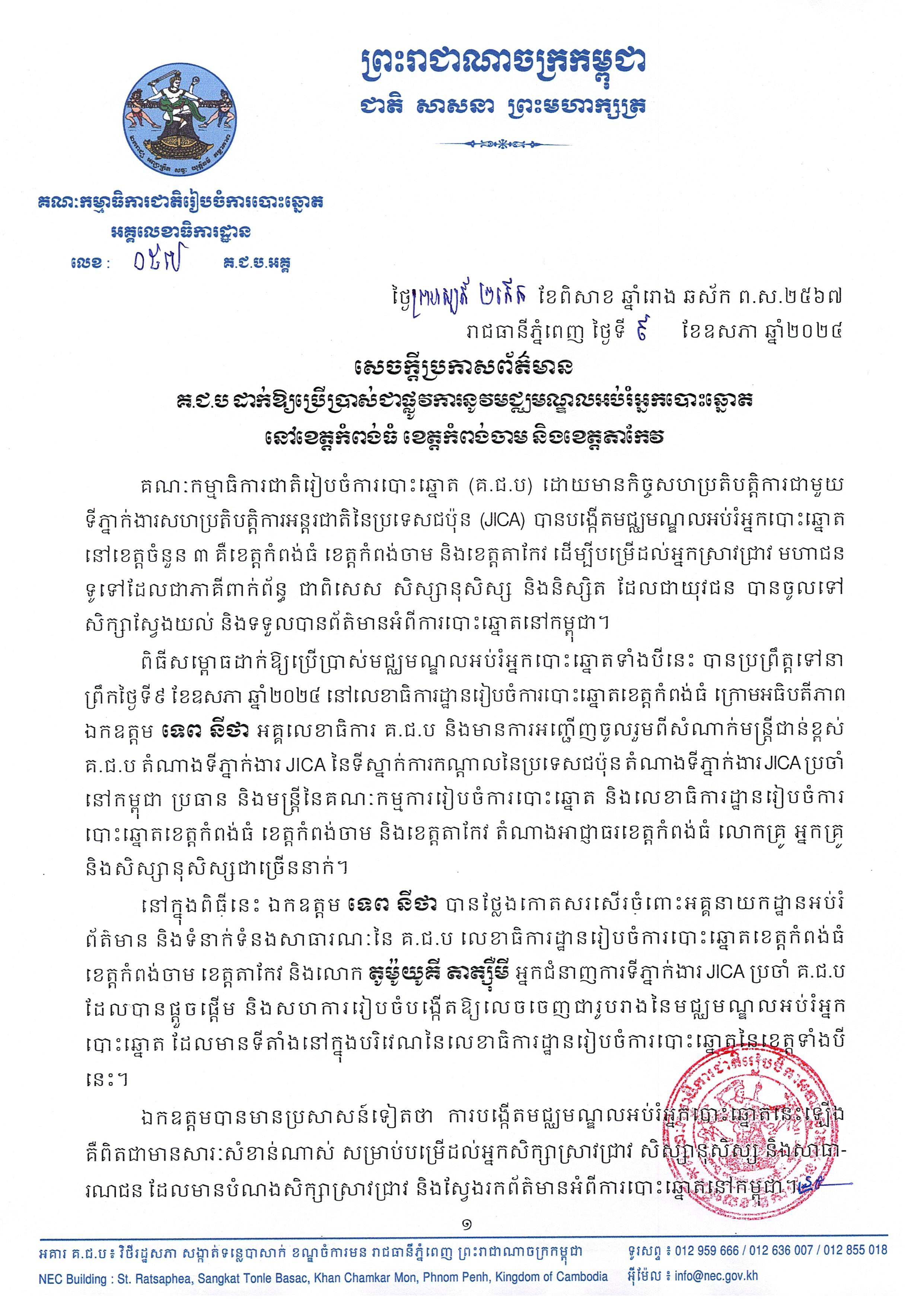 ពិធីសម្ពោធដាក់ឱ្យប្រើប្រាស់មជ្ឈមណ្ឌលអប់រំអ្នកបោះឆ្នោតទាំងបីនេះ បានប្រព្រឹត្តទៅនាព្រឹកថ្ងៃទី៩ ខែឧសភា ឆ្នាំ២០២៤ នៅលេខាធិការដ្ឋានរៀបចំការបោះឆ្នោតខេត្តកំពង់ធំ ក្រោមអធិបតីភាពឯកឧត្ដម ទេព នីថា អគ្គលេខាធិការ គ.ជ.ប និងមានការអញ្ជើញចូលរួមពីសំណាក់មន្រ្តីជាន់ខ្ពស់ គ.ជ.ប តំណាងទីភ្នាក់ងារ JICA នៃទីស្នាក់ការកណ្ដាលនៃប្រទេសជប៉ុន តំណាងទីភ្នាក់ងារ JICA ប្រចាំនៅកម្ពុជា ប្រធាន និងមន្រ្តីនៃគណៈកម្មការរៀបចំការបោះឆ្នោត និងលេខាធិការដ្ឋានរៀបចំការបោះឆ្នោតខេត្តកំពង់ធំ ខេត្តកំពង់ចាម និងខេត្តតាកែវ តំណាងអាជ្ញាធរខេត្តកំពង់ធំ លោកគ្រូ អ្នកគ្រូ និងសិស្សានុសិស្សជាច្រើននាក់។