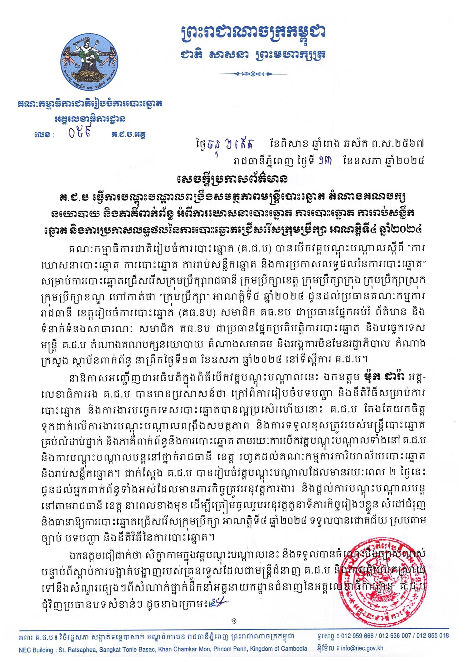 គណៈកម្មាធិការជាតិរៀបចំការបោះឆ្នោត (គ.ជ.ប) បានបើកវគ្គបណ្ដុះបណ្ដាលស្ដីពី “ការឃោសនាបោះឆ្នោត ការបោះឆ្នោត ការរាប់សន្លឹកឆ្នោត និងការប្រកាសលទ្ធផលនៃការបោះឆ្នោត” សម្រាប់ការបោះឆ្នោតជ្រើសរើសក្រុមប្រឹក្សារាជធានី ក្រុមប្រឹក្សាខេត្ត ក្រុមប្រឹក្សាក្រុង ក្រុមប្រឹក្សាស្រុក ក្រុមប្រឹក្សាខណ្ឌ ហៅកាត់ថា “ក្រុមប្រឹក្សា” អាណត្តិទី៤ ឆ្នាំ២០២៤ ជូនដល់ប្រធានគណៈកម្មការរាជធានី ខេត្តរៀបចំការបោះឆ្នោត (គធ.ខប) សមាជិក គធ.ខប ជាប្រធានផ្នែកអប់រំ ព័ត៌មាន និងទំនាក់ទំនងសាធារណៈ សមាជិក គធ.ខប ជាប្រធានផ្នែកប្រតិបត្តិការបោះឆ្នោត និងបច្ចេកទេស មន្រ្តី គ.ជ.ប តំណាងគណបក្សនយោបាយ តំណាងសមាគម និងអង្គការមិនមែនរដ្ឋាភិបាល តំណាងក្រសួង ស្ថាប័នពាក់ព័ន្ធ នាព្រឹកថ្ងៃទី១៣ ខែឧសភា ឆ្នាំ២០២៤ នៅទីស្ដីការ គ.ជ.ប។