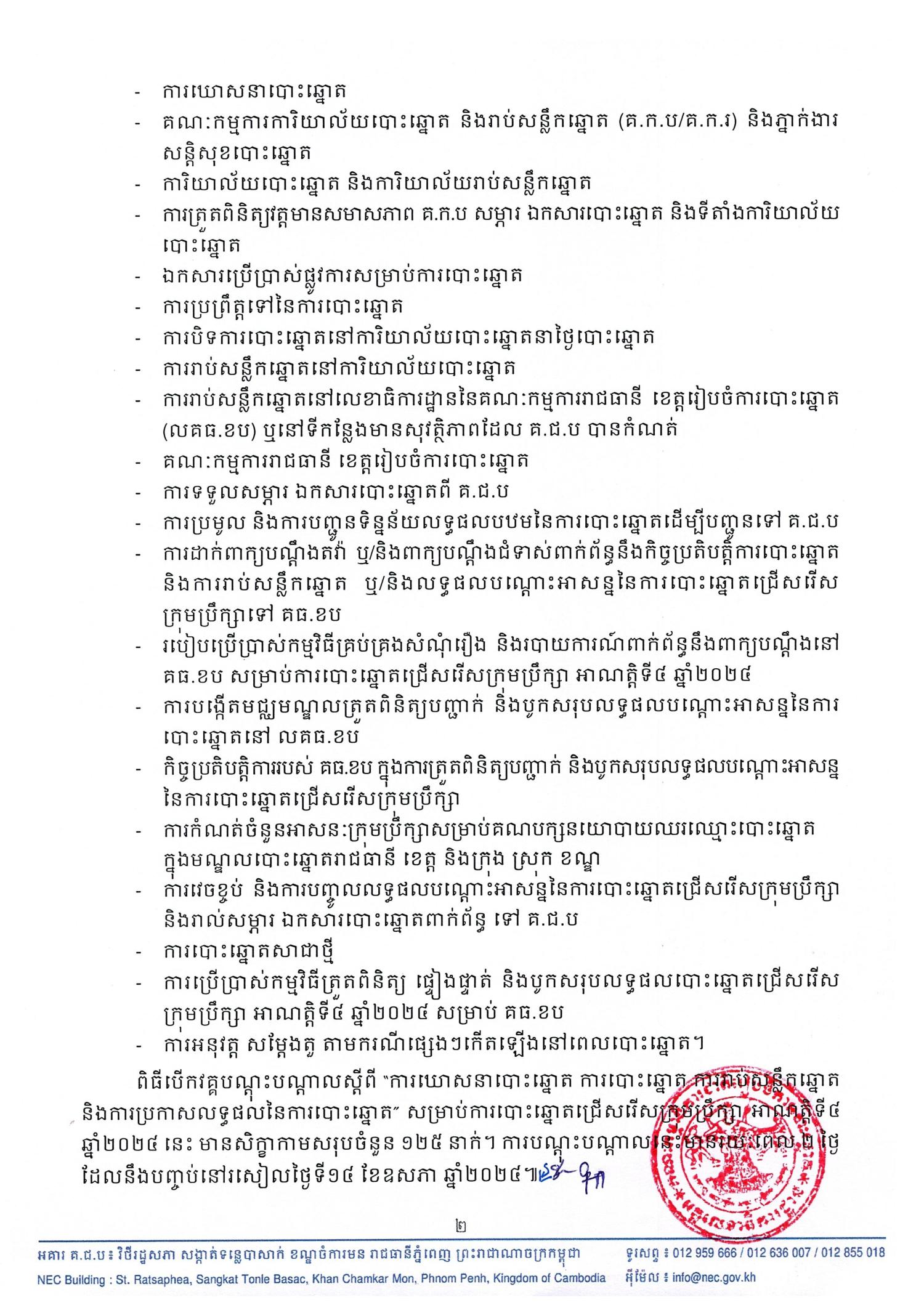 - កិច្ចប្រតិបត្តិការរបស់ គធ.ខប ក្នុងការត្រួតពិនិត្យបញ្ជាក់ និងបូកសរុបលទ្ធផលបណ្ដោះអាសន្ននៃការបោះឆ្នោតជ្រើសរើសក្រុមប្រឹក្សា