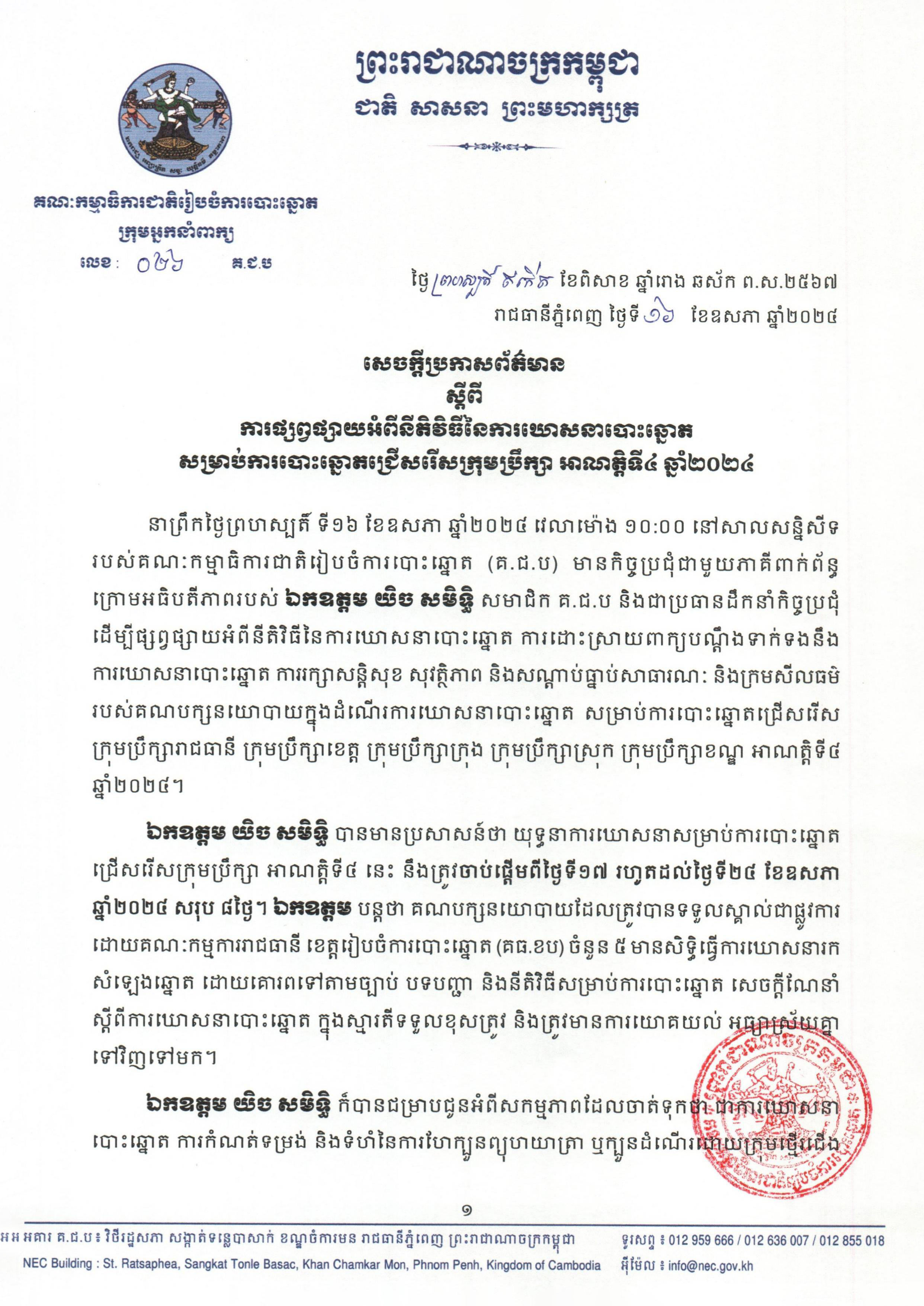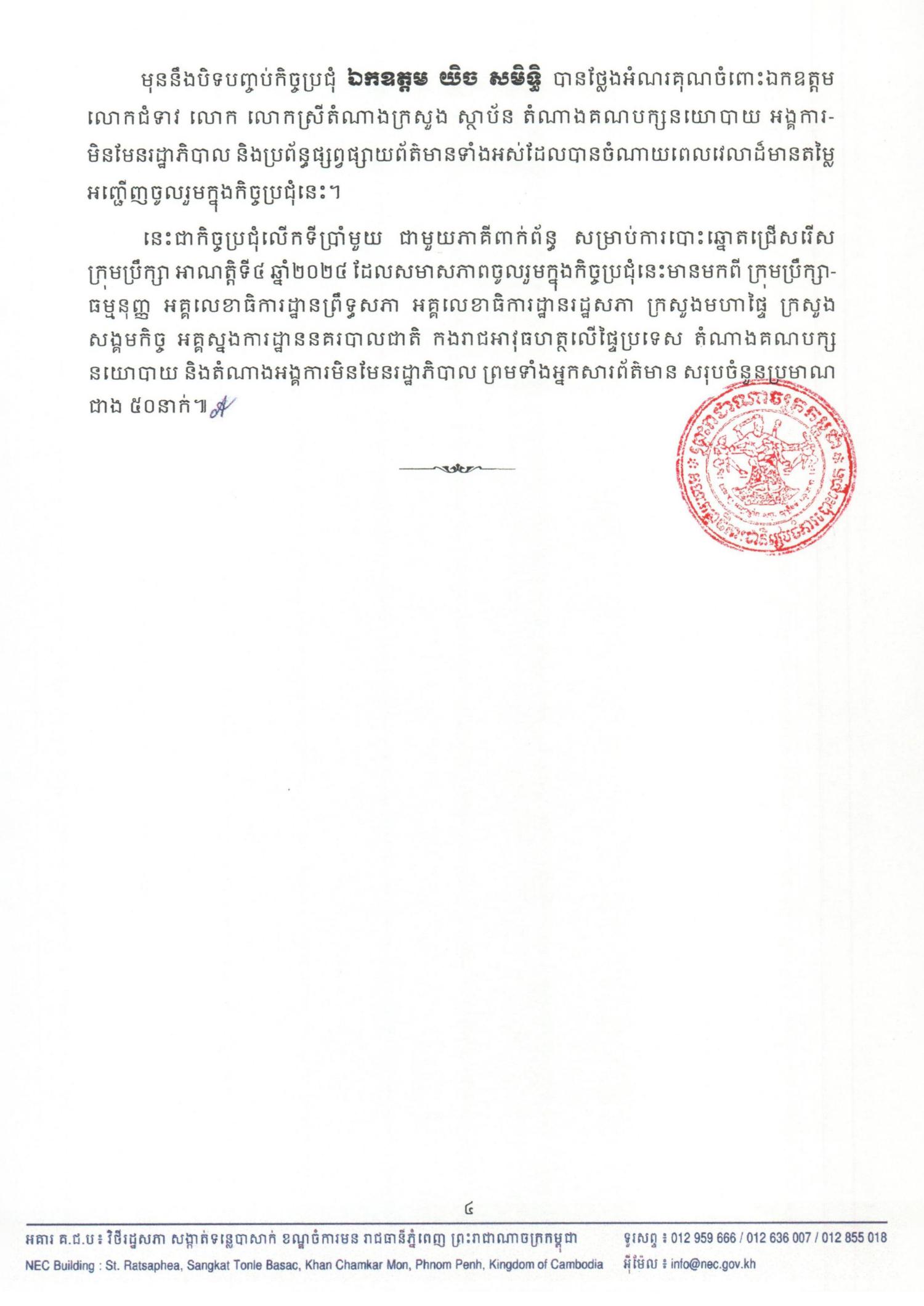 នាព្រឹកថ្ងៃព្រហស្បតិ៍ ទី១៦ ខែឧសភា ឆ្នាំ២០២៤ វេលាម៉ោង ១០:០០ នៅសាលសន្និសីទរបស់គណៈកម្មាធិការជាតិរៀបចំការបោះឆ្នោត (គ.ជ.ប) មានកិច្ចប្រជុំជាមួយភាគីពាក់ព័ន្ធ ក្រោមអធិបតីភាពរបស់ ឯកឧត្ដម យិច សមិទ្ធិ សមាជិក គ.ជ.ប និងជាប្រធានដឹកនាំកិច្ចប្រជុំ ដើម្បីផ្សព្វផ្សាយអំពីនីតិវិធីនៃការឃោសនាបោះឆ្នោត ការដោះស្រាយពាក្យបណ្តឹងទាក់ទងនឹងការឃោសនាបោះឆ្នោត ការរក្សាសន្តិសុខ សុវត្ថិភាព និងសណ្តាប់ធ្នាប់សាធារណៈ និងក្រមសីលធម៌របស់គណបក្សនយោបាយក្នុងដំណើរការឃោសនាបោះឆ្នោត សម្រាប់ការបោះឆ្នោតជ្រើសរើស ក្រុមប្រឹក្សារាជធានី ក្រុមប្រឹក្សាខេត្ត ក្រុមប្រឹក្សាក្រុង ក្រុមប្រឹក្សាស្រុក ក្រុមប្រឹក្សាខណ្ឌ អាណត្តិទី៤ ឆ្នាំ២០២៤។