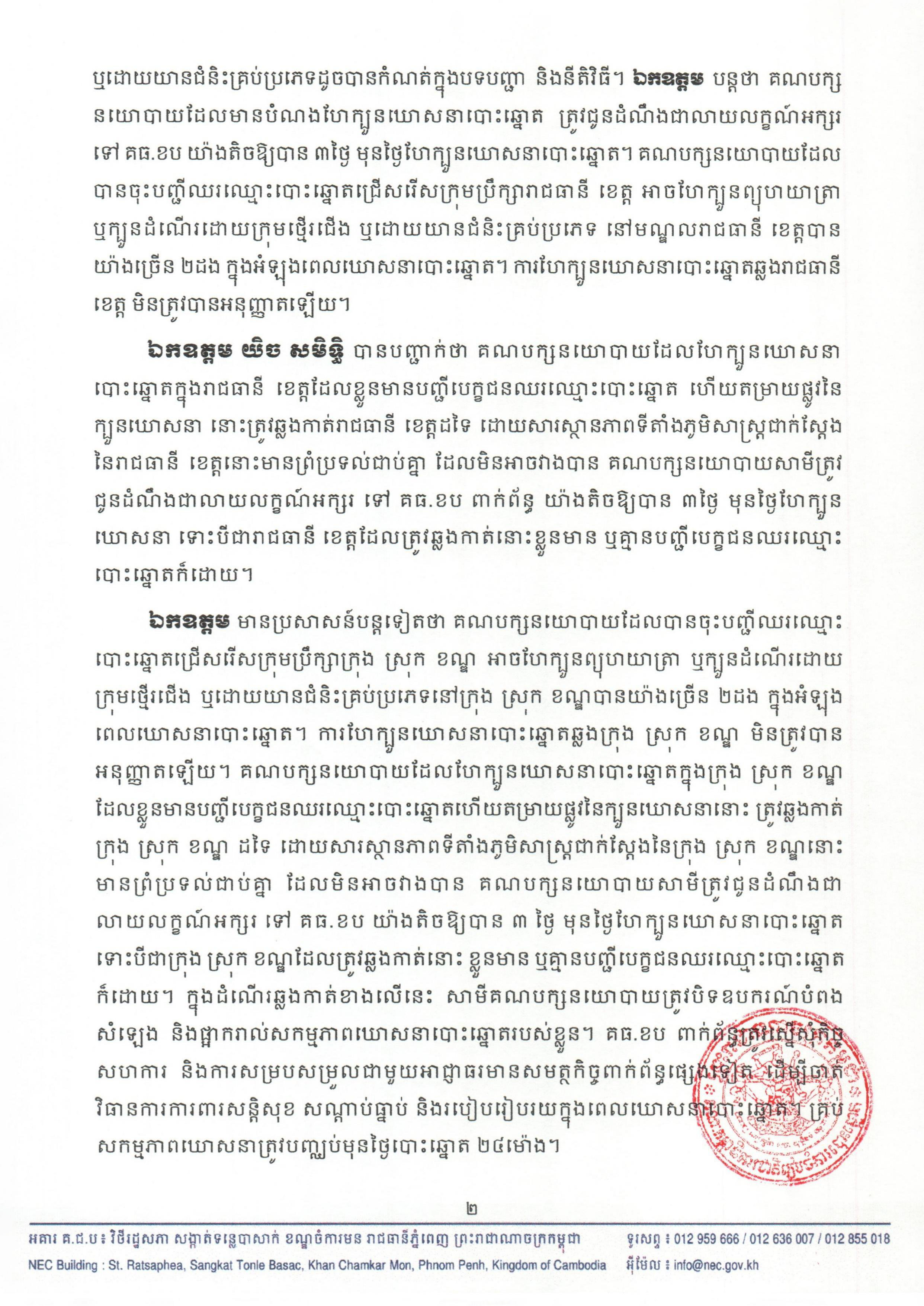 ឯកឧត្តម យិច សមិទ្ធិ បានបញ្ជាក់ថា គណបក្សនយោបាយដែលហែក្បួនឃោសនាបោះឆ្នោតក្នុងរាជធានី ខេត្តដែលខ្លួនមានបញ្ជីបេក្ខជនឈរឈ្មោះបោះឆ្នោត ហើយតម្រាយផ្លូវនៃក្បួនឃោសនា នោះត្រូវឆ្លងកាត់រាជធានី ខេត្តដទៃ ដោយសារស្ថានភាពទីតាំងភូមិសាស្រ្តជាក់ស្តែងនៃរាជធានី ខេត្តនោះមានព្រំប្រទល់ជាប់គ្នា ដែលមិនអាចវាងបាន គណបក្សនយោបាយសាមីត្រូវជូនដំណឹងជាលាយលក្ខណ៍អក្សរ ទៅ គធ.ខប ពាក់ព័ន្ធ យ៉ាងតិចឱ្យបាន ៣ថ្ងៃ មុនថ្ងៃហែក្បួនឃោសនា ទោះបីជារាជធានី ខេត្តដែលត្រូវឆ្លងកាត់នោះខ្លួនមាន ឬគ្មានបញ្ជីបេក្ខជនឈរឈ្មោះបោះឆ្នោតក៏ដោយ។
