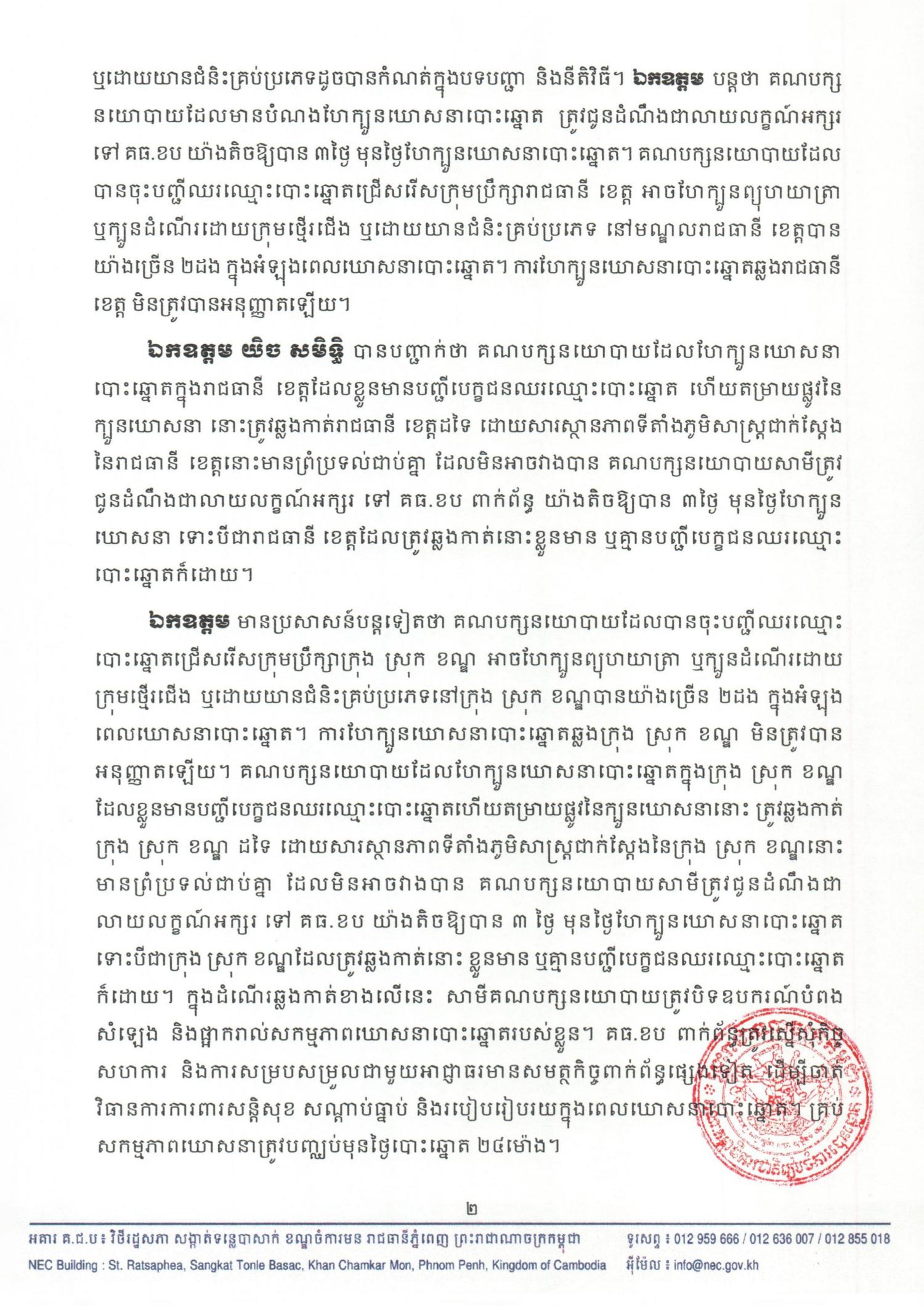 ឯកឧត្តម មានប្រសាសន៍បន្តទៀតថា គណបក្សនយោបាយដែលបានចុះបញ្ជីឈរឈ្មោះបោះឆ្នោតជ្រើសរើសក្រុមប្រឹក្សាក្រុង ស្រុក ខណ្ឌ អាចហែក្បួនព្យុហយាត្រា ឬក្បួនដំណើរដោយក្រុមថ្មើរជើង ឬដោយយានជំនិះគ្រប់ប្រភេទនៅក្រុង ស្រុក ខណ្ឌបានយ៉ាងច្រើន ២ដង ក្នុងអំឡុងពេលឃោសនាបោះឆ្នោត។ ការហែក្បួនឃោសនាបោះឆ្នោតឆ្លងក្រុង ស្រុក ខណ្ឌ មិនត្រូវបានអនុញ្ញាតឡើយ។ គណបក្សនយោបាយដែលហែក្បួនឃោសនាបោះឆ្នោតក្នុងក្រុង ស្រុក ខណ្ឌ ដែលខ្លួនមានបញ្ជីបេក្ខជនឈរឈ្មោះបោះឆ្នោតហើយតម្រាយផ្លូវនៃក្បួនឃោសនានោះ ត្រូវឆ្លងកាត់ ក្រុង ស្រុក ខណ្ឌ ដទៃ ដោយសារស្ថានភាពទីតាំងភូមិសាស្រ្តជាក់ស្តែងនៃក្រុង ស្រុក ខណ្ឌនោះ មានព្រំប្រទល់ជាប់គ្នា ដែលមិនអាចវាងបាន គណបក្សនយោបាយសាមីត្រូវជូនដំណឹងជា លាយលក្ខណ៍អក្សរ ទៅ គធ.ខប យ៉ាងតិចឱ្យបាន ៣ ថ្ងៃ មុនថ្ងៃហែក្បួនឃោសនាបោះឆ្នោត ទោះបីជាក្រុង ស្រុក ខណ្ឌដែលត្រូវឆ្លងកាត់នោះ ខ្លួនមាន ឬគ្មានបញ្ជីបេក្ខជនឈរឈ្មោះបោះឆ្នោត ក៏ដោយ។ ក្នុងដំណើរឆ្លងកាត់ខាងលើនេះ សាមីគណបក្សនយោបាយត្រូវបិទឧបករណ៍បំពង សំឡេង និងផ្អាករាល់សកម្មភាពឃោសនាបោះឆ្នោតរបស់ខ្លួន។ គធ.ខប ពាក់ព័ន្ធត្រូវស្នើសុំកិច្ចសហការ និងការសម្របសម្រួលជាមួយអាជ្ញាធរមានសមត្ថកិច្ចពាក់ព័ន្ធផ្សេងទៀត ដើម្បីចាត់វិធានការការពារសន្តិសុខ សណ្តាប់ធ្នាប់ និងរបៀបរៀបរយក្នុងពេលឃោសនាបោះឆ្នោត។ គ្រប់សកម្មភាពឃោសនាត្រូវបញ្ឈប់មុនថ្ងៃបោះឆ្នោត ២៤ម៉ោង។