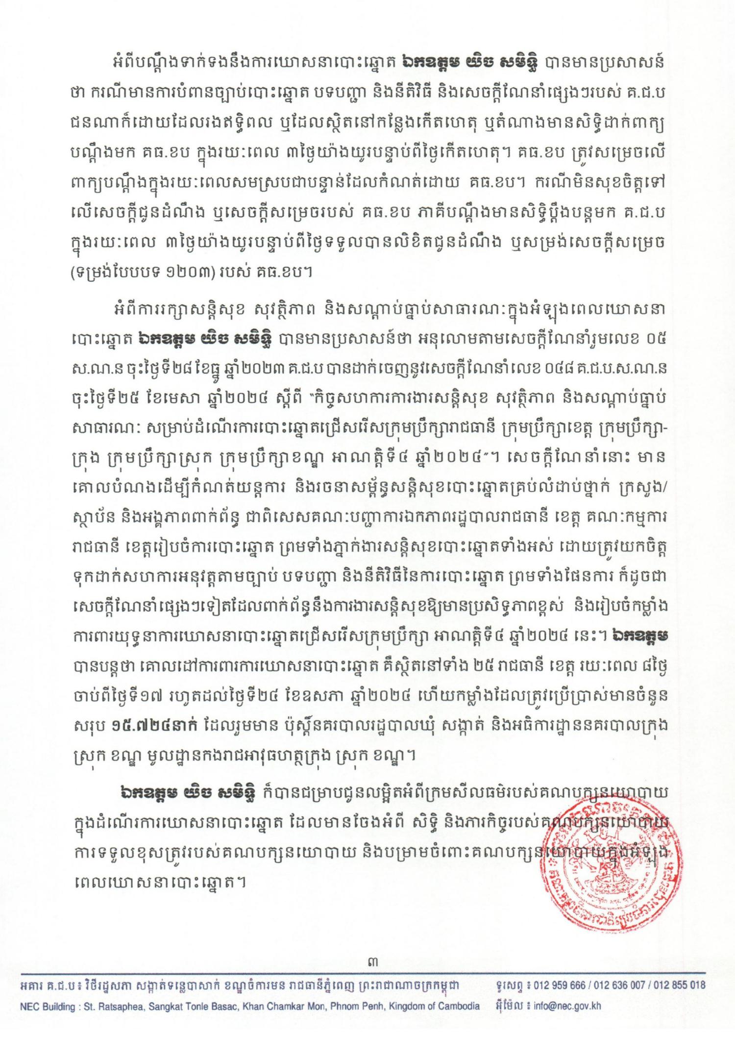 អំពីការរក្សាសន្តិសុខ សុវត្ថិភាព និងសណ្តាប់ធ្នាប់សាធារណៈក្នុងអំឡុងពេលឃោសនាបោះឆ្នោត ឯកឧត្ដម យិច សមិទ្ធិ បានមានប្រសាសន៍ថា អនុលោមតាមសេចក្តីណែនាំរួមលេខ ០៥ ស.ណ.ន ចុះថ្ងៃទី២៨ ខែធ្នូ ឆ្នាំ២០២៣ គ.ជ.ប បានដាក់ចេញនូវសេចក្តីណែនាំលេខ ០៤៨ គ.ជ.ប.ស.ណ.ន ចុះថ្ងៃទី២៥ ខែមេសា ឆ្នាំ២០២៤ ស្តីពី “កិច្ចសហការការងារសន្តិសុខ សុវត្ថិភាព និងសណ្តាប់ធ្នាប់សាធារណៈ សម្រាប់ដំណើរការបោះឆ្នោតជ្រើសរើសក្រុមប្រឹក្សារាជធានី ក្រុមប្រឹក្សាខេត្ត ក្រុមប្រឹក្សាក្រុង ក្រុមប្រឹក្សាស្រុក ក្រុមប្រឹក្សាខណ្ឌ អាណត្តិទី៤ ឆ្នាំ២០២៤”។ សេចក្តីណែនាំនោះ មានគោលបំណងដើម្បីកំណត់យន្តការ និងរចនាសម្ព័ន្ធសន្តិសុខបោះឆ្នោតគ្រប់លំដាប់ថ្នាក់ ក្រសួង/ ស្ថាប័ន និងអង្គភាពពាក់ព័ន្ធ ជាពិសេសគណៈបញ្ជាការឯកភាពរដ្ឋបាលរាជធានី ខេត្ត គណៈកម្មការរាជធានី ខេត្តរៀបចំការបោះឆ្នោត ព្រមទំាងភ្នាក់ងារសន្តិសុខបោះឆ្នោតទំាងអស់ ដោយត្រូវយកចិត្តទុកដាក់សហការអនុវត្តតាមច្បាប់ បទបញ្ជា និងនីតិវិធីនៃការបោះឆ្នោត ព្រមទាំងផែនការ ក៏ដូចជាសេចក្តីណែនាំផ្សេងៗទៀតដែលពាក់ព័ន្ធនឹងការងារសន្តិសុខឱ្យមានប្រសិទ្ធភាពខ្ពស់ និងរៀបចំកម្លាំងការពារយុទ្ធនាការឃោសនាបោះឆ្នោតជ្រើសរើសក្រុមប្រឹក្សា អាណត្តិទី៤ ឆ្នាំ២០២៤ នេះ។ ឯកឧត្ដម បានបន្តថា គោលដៅការពារការឃោសនាបោះឆ្នោត គឺស្ថិតនៅទំាង ២៥ រាជធានី ខេត្ត រយៈពេល ៨ថ្ងៃ ចាប់ពីថ្ងៃទី១៧ រហូតដល់ថ្ងៃទី២៤ ខែឧសភា ឆ្នាំ២០២៤ ហើយកម្លាំងដែលត្រូវប្រើប្រាស់មានចំនួនសរុប ១៥.៧២៤នាក់ ដែលរួមមាន ប៉ុស្តិ៍នគរបាលរដ្ឋបាលឃុំ សង្កាត់ និងអធិការដ្ឋាននគរបាលក្រុង ស្រុក ខណ្ឌ មូលដ្ឋានកងរាជអាវុធហត្ថក្រុង ស្រុក ខណ្ឌ។