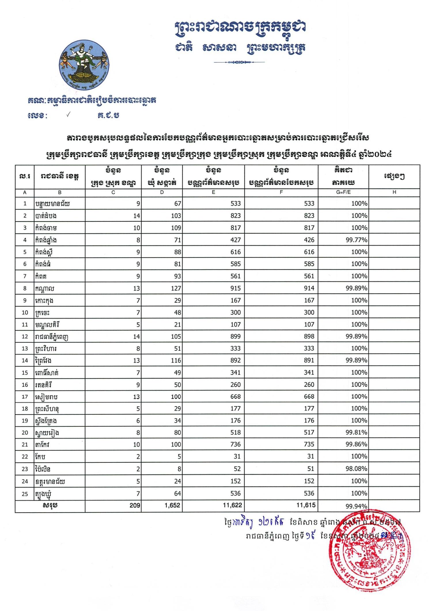 តារាងបូកសរុបលទ្ធផលនៃការចែកបណ្ណព័ត៌មានអ្នកបោះឆ្នោតសម្រាប់ការបោះឆ្នោតជ្រើសរើសក្រុមប្រឹក្សារាជធានី ក្រុមប្រឹក្សាខេត្ត ក្រុមប្រឹក្សាក្រុង ក្រុមប្រឹក្សាស្រុក ក្រុមប្រឹក្សាខណ្ឌ អាណត្តិទី៤ ឆ្នាំ២០២៤