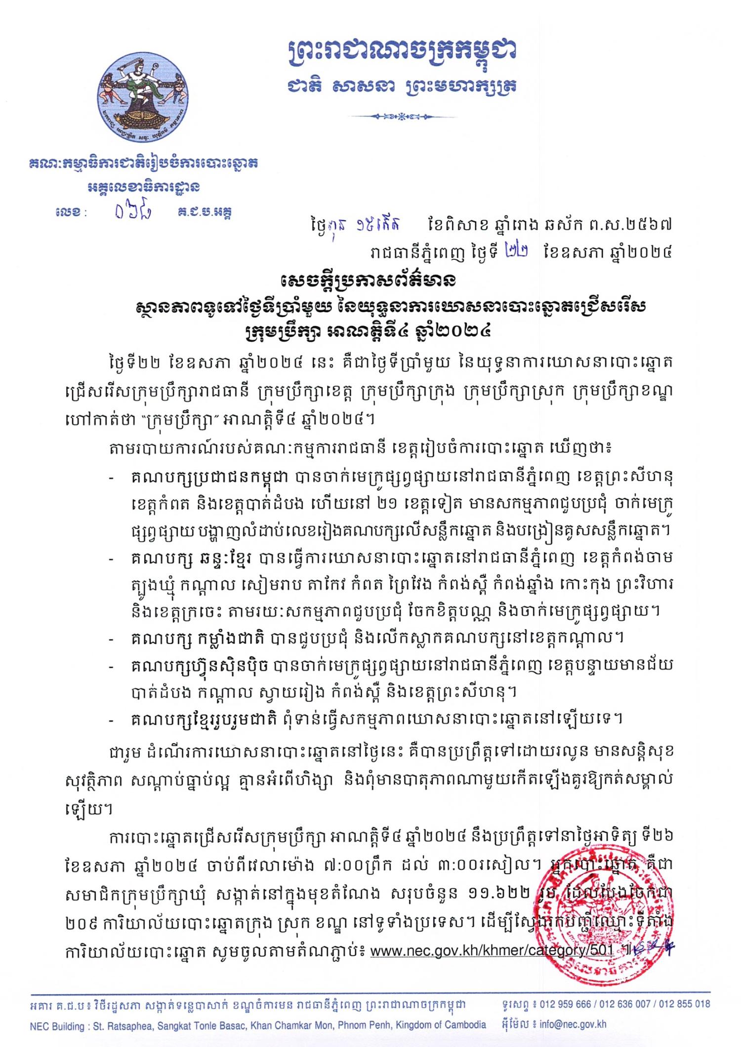 ថ្ងៃទី២២ ខែឧសភា ឆ្នាំ២០២៤ នេះ គឺជាថ្ងៃទីប្រាំមួយ នៃយុទ្ធនាការឃោសនាបោះឆ្នោតជ្រើសរើសក្រុមប្រឹក្សារាជធានី ក្រុមប្រឹក្សាខេត្ត ក្រុមប្រឹក្សាក្រុង ក្រុមប្រឹក្សាស្រុក ក្រុមប្រឹក្សាខណ្ឌ ហៅកាត់ថា “ក្រុមប្រឹក្សា” អាណត្តិទី៤ ឆ្នាំ២០២៤។