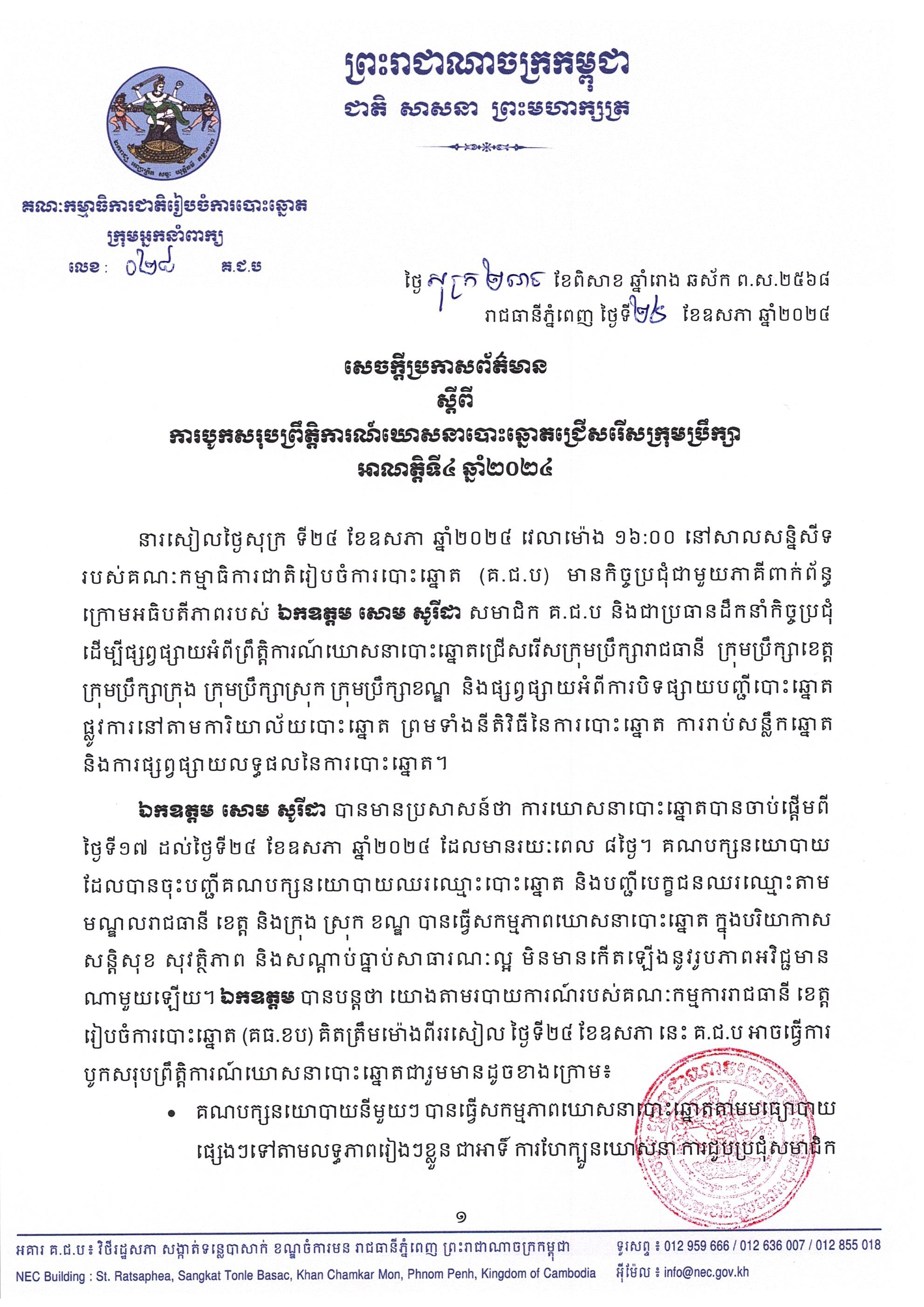 ឯកឧត្ដម សោម សូរីដា បានមានប្រសាសន៍ថា ការឃោសនាបោះឆ្នោតបានចាប់ផ្តើមពីថ្ងៃទី១៧ ដល់ថ្ងៃទី២៤ ខែឧសភា ឆ្នាំ២០២៤ ដែលមានរយៈពេល ៨ថ្ងៃ។ គណបក្សនយោបាយដែលបានចុះបញ្ជីគណបក្សនយោបាយឈរឈ្មោះបោះឆ្នោត និងបញ្ជីបេក្ខជនឈរឈ្មោះតាមមណ្ឌលរាជធានី ខេត្ត និងក្រុង ស្រុក ខណ្ឌ បានធ្វើសកម្មភាពឃោសនាបោះឆ្នោត ក្នុងបរិយាកាសសន្តិសុខ សុវត្ថិភាព និងសណ្ដាប់ធ្នាប់សាធារណៈល្អ មិនមានកើតឡើងនូវរូបភាពអវិជ្ជមានណាមួយឡើយ។ ឯកឧត្តម បានបន្តថា យោងតាមរបាយការណ៍របស់គណៈកម្មការរាជធានី ខេត្តរៀបចំការបោះឆ្នោត (គធ.ខប) គិតត្រឹមម៉ោងពីររសៀល ថ្ងៃទី២៤ ខែឧសភា នេះ គ.ជ.ប អាចធ្វើការបូកសរុបព្រឹត្តិការណ៍ឃោសនាបោះឆ្នោតជារួមមានដូចខាងក្រោម៖