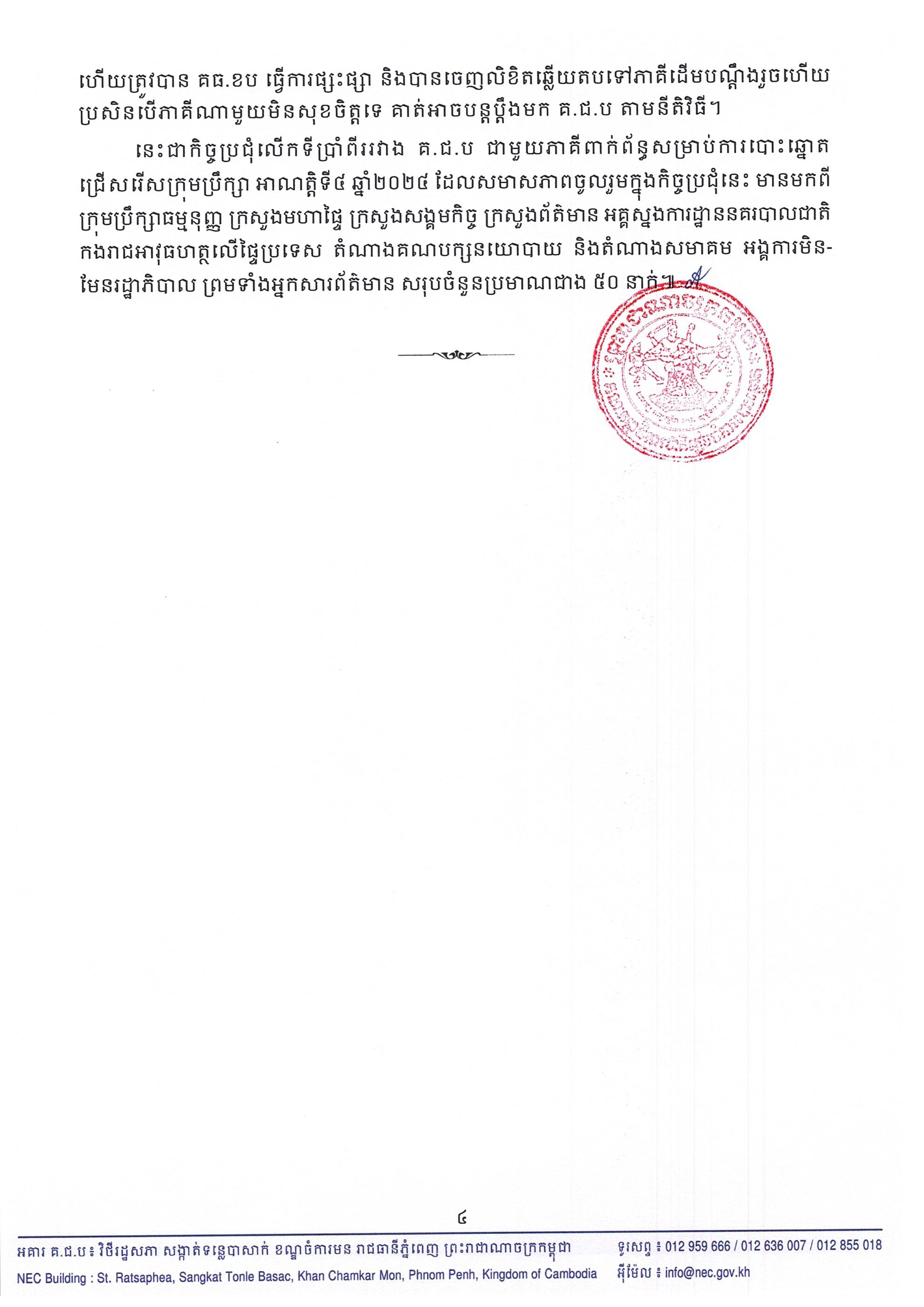 នេះជាកិច្ចប្រជុំលើកទីប្រាំពីររវាង គ.ជ.ប ជាមួយភាគីពាក់ព័ន្ធសម្រាប់ការបោះឆ្នោតជ្រើសរើសក្រុមប្រឹក្សា អាណត្តិទី៤ ឆ្នាំ២០២៤ ដែលសមាសភាពចូលរួមក្នុងកិច្ចប្រជុំនេះ មានមកពី ក្រុមប្រឹក្សាធម្មនុញ្ញ ក្រសួងមហាផ្ទៃ ក្រសួងសង្គមកិច្ច ក្រសួងព័ត៌មាន អគ្គស្នងការដ្ឋាននគរបាលជាតិ កងរាជអាវុធហត្ថលើផ្ទៃប្រទេស តំណាងគណបក្សនយោបាយ និងតំណាងសមាគម អង្គការមិនមែនរដ្ឋាភិបាល ព្រមទាំងអ្នកសារព័ត៌មាន សរុបចំនួនប្រមាណជាង ៥០ នាក់៕