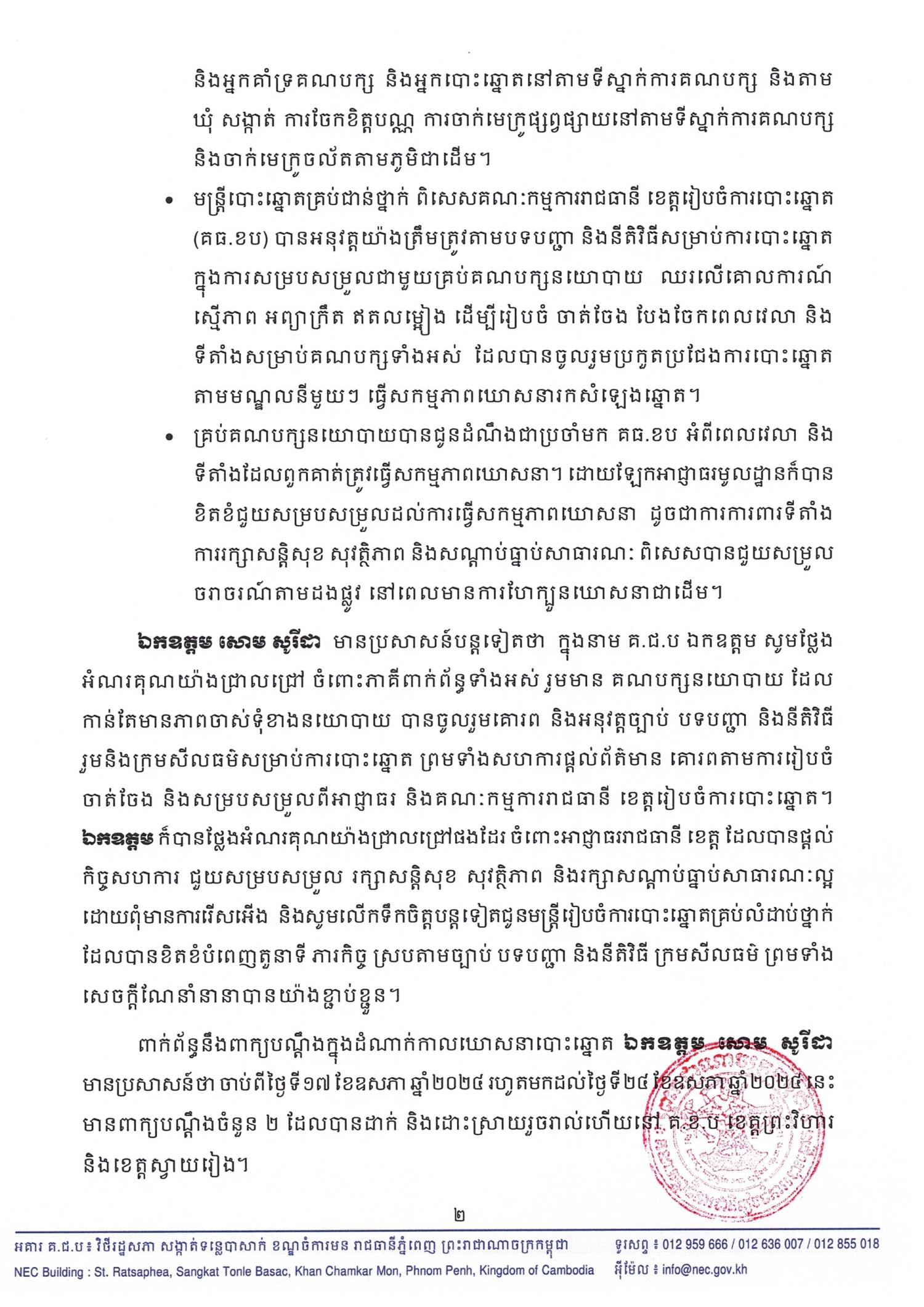 ពាក់ព័ន្ធនឹងពាក្យបណ្តឹងក្នុងដំណាក់កាលឃោសនាបោះឆ្នោត ឯកឧត្ដម សោម សូរីដា មានប្រសាសន៍ថា ចាប់ពីថ្ងៃទី១៧ ខែឧសភា ឆ្នាំ២០២៤ រហូតមកដល់ថ្ងៃទី២៤ ខែឧសភា ឆ្នាំ២០២៤ នេះ មានពាក្យបណ្ដឹងចំនួន ២ ដែលបានដាក់ និងដោះស្រាយរួចរាល់ហើយនៅ គ.ខ.ប ខេត្តព្រះវិហារ និងខេត្តស្វាយរៀង។