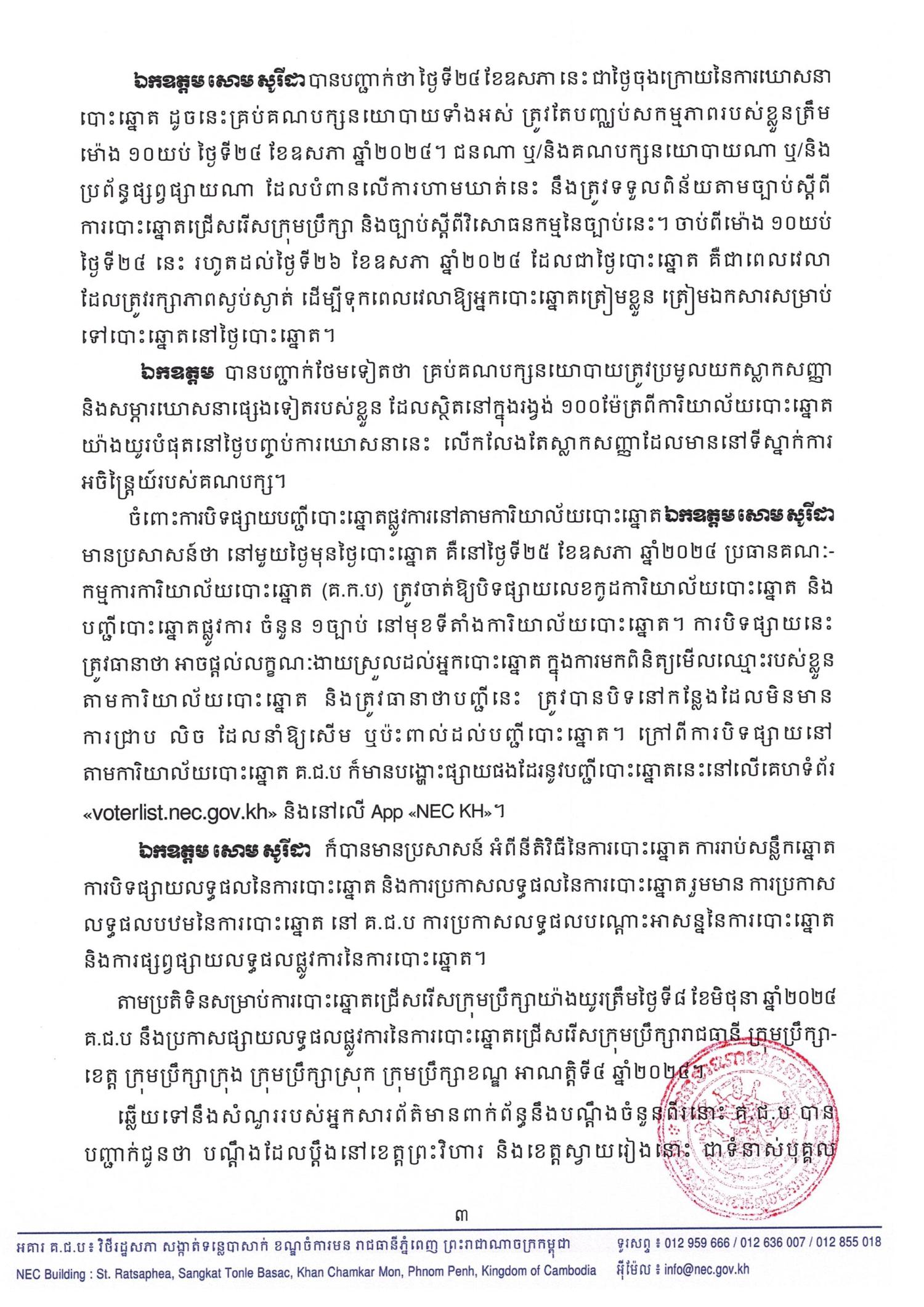 ឯកឧត្ដម សោម សូរីដា បានបញ្ជាក់ថា ថ្ងៃទី២៤ ខែឧសភា នេះ ជាថ្ងៃចុងក្រោយនៃការឃោសនាបោះឆ្នោត ដូចនេះគ្រប់គណបក្សនយោបាយទាំងអស់ ត្រូវតែបញ្ឈប់សកម្មភាពរបស់ខ្លួនត្រឹមម៉ោង ១០យប់ ថ្ងៃទី២៤ ខែឧសភា ឆ្នាំ២០២៤។ ជនណា ឬ/និងគណបក្សនយោបាយណា ឬ/និងប្រព័ន្ធផ្សព្វផ្សាយណា ដែលបំពានលើការហាមឃាត់នេះ នឹងត្រូវទទួលពិន័យតាមច្បាប់ស្តីពីការបោះឆ្នោតជ្រើសរើសក្រុមប្រឹក្សា និងច្បាប់ស្ដីពីវិសោធនកម្មនៃច្បាប់នេះ។ ចាប់ពីម៉ោង ១០យប់ថ្ងៃទី២៤ នេះ រហូតដល់ថ្ងៃទី២៦ ខែឧសភា ឆ្នាំ២០២៤ ដែលជាថ្ងៃបោះឆ្នោត គឺជាពេលវេលាដែលត្រូវរក្សាភាពស្ងប់ស្ងាត់ ដើម្បីទុកពេលវេលាឱ្យអ្នកបោះឆ្នោតត្រៀមខ្លួន ត្រៀមឯកសារសម្រាប់ទៅបោះឆ្នោតនៅថ្ងៃបោះឆ្នោត។