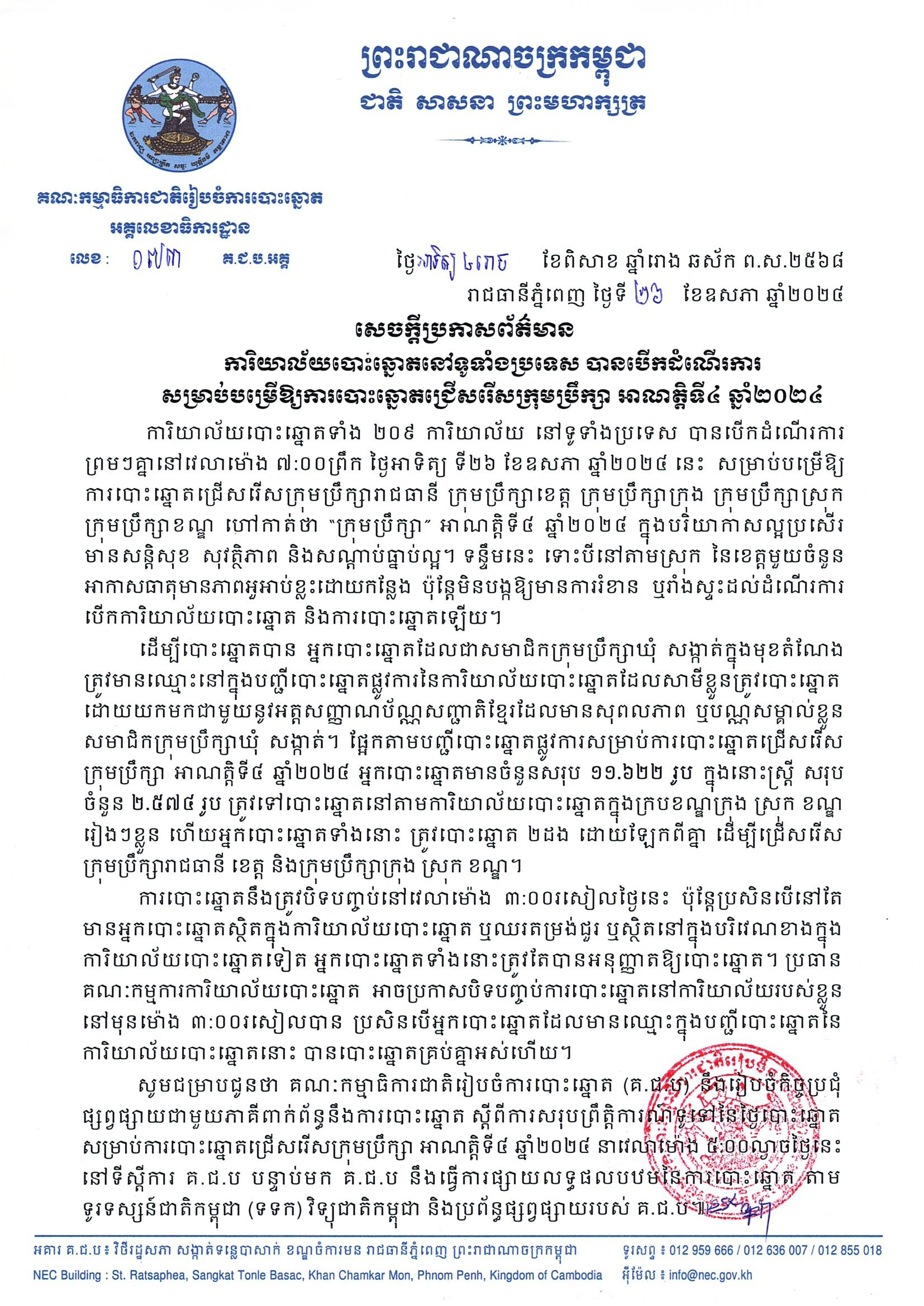 ការិយាល័យបោះឆ្នោតទាំង ២០៩ ការិយាល័យ នៅទូទាំងប្រទេស បានបើកដំណើរការព្រមៗគ្នានៅវេលាម៉ោង ៧:០០ព្រឹក ថ្ងៃអាទិត្យ ទី២៦ ខែឧសភា ឆ្នាំ២០២៤ នេះ សម្រាប់បម្រើឱ្យការបោះឆ្នោតជ្រើសរើសក្រុមប្រឹក្សារាជធានី ក្រុមប្រឹក្សាខេត្ត ក្រុមប្រឹក្សាក្រុង ក្រុមប្រឹក្សាស្រុក ក្រុមប្រឹក្សាខណ្ឌ ហៅកាត់ថា “ក្រុមប្រឹក្សា” អាណត្តិទី៤ ឆ្នាំ២០២៤ ក្នុងបរិយាកាសល្អប្រសើរ មានសន្តិសុខ សុវត្ថិភាព និងសណ្ដាប់ធ្នាប់ល្អ។ ទន្ទឹមនេះ ទោះបី នៅតាមស្រុក នៃខេត្តមួយចំនួន អាកាសធាតុមានភាពអួអាប់ខ្លះដោយកន្លែង ប៉ុន្តែមិនបង្កឱ្យមានការរំខាន ឬរាំងស្ទះដល់ដំណើរការបើកការិយាល័យបោះឆ្នោត និងការបោះឆ្នោតឡើយ។