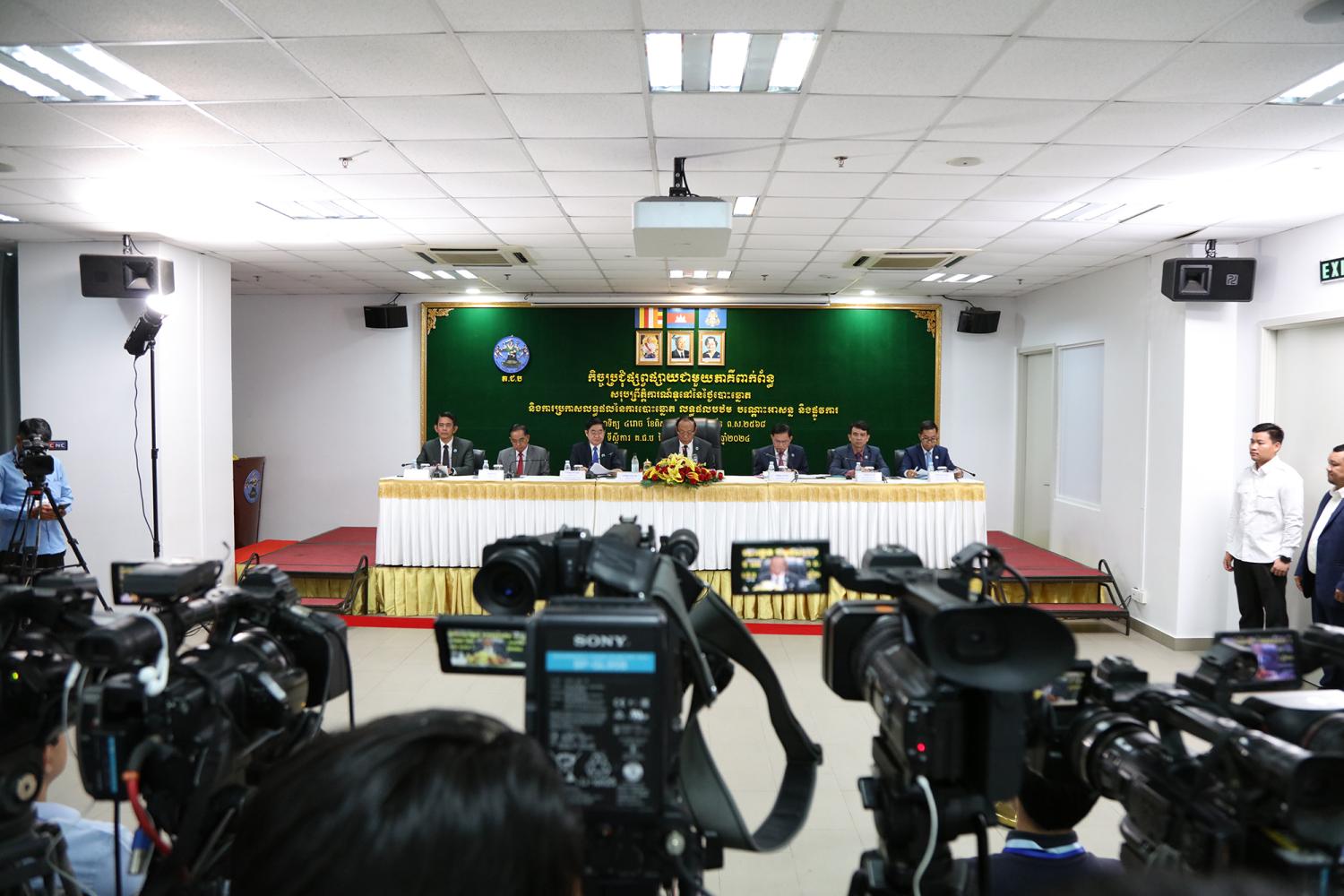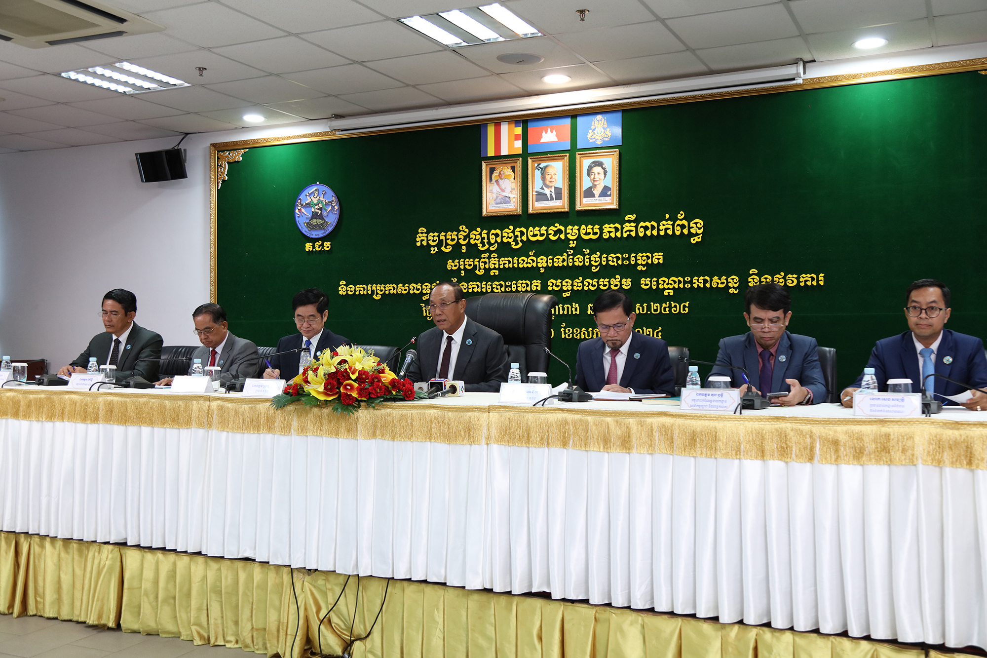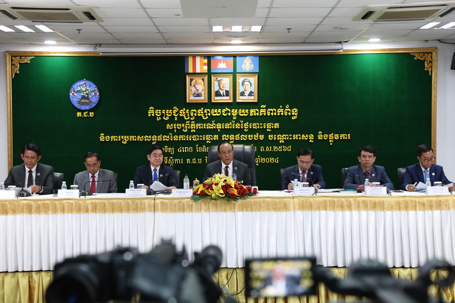 រូបភាពសកម្មភាព ឯកឧត្តម ប្រាជ្ញ ចន្ទ ប្រធានគណៈកម្មាធិការជាតិរៀបចំការបោះឆ្នោត (គ.ជ.ប) បានដឹកនាំកិច្ចប្រជុំផ្សព្វផ្សាយជាមួយភាគីពាក់ព័ន្ធ ស្ដីពីសរុបព្រឹត្តិការណ៍ទូទៅនៃថ្ងៃបោះឆ្នោត និងការប្រកាសលទ្ធផលនៃការបោះឆ្នោត លទ្ធផលបឋម បណ្តោះអាសន្ន និងផ្លូវការ សម្រាប់ការបោះឆ្នោតជ្រើសរើសក្រុមប្រឹក្សារាជធានី ក្រុមប្រឹក្សាខេត្ត ក្រុមប្រឹក្សាក្រុង ក្រុមប្រឹក្សាស្រុក ក្រុមប្រឹក្សាខណ្ឌ អាណត្តិទី៤ ឆ្នាំ២០២៤