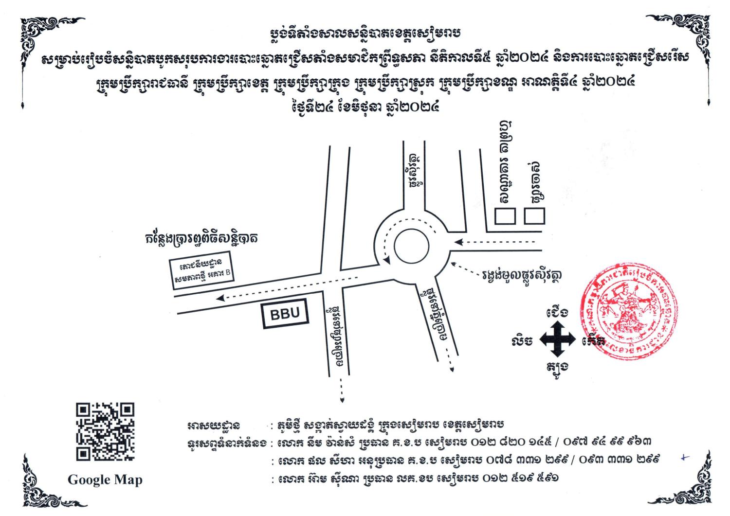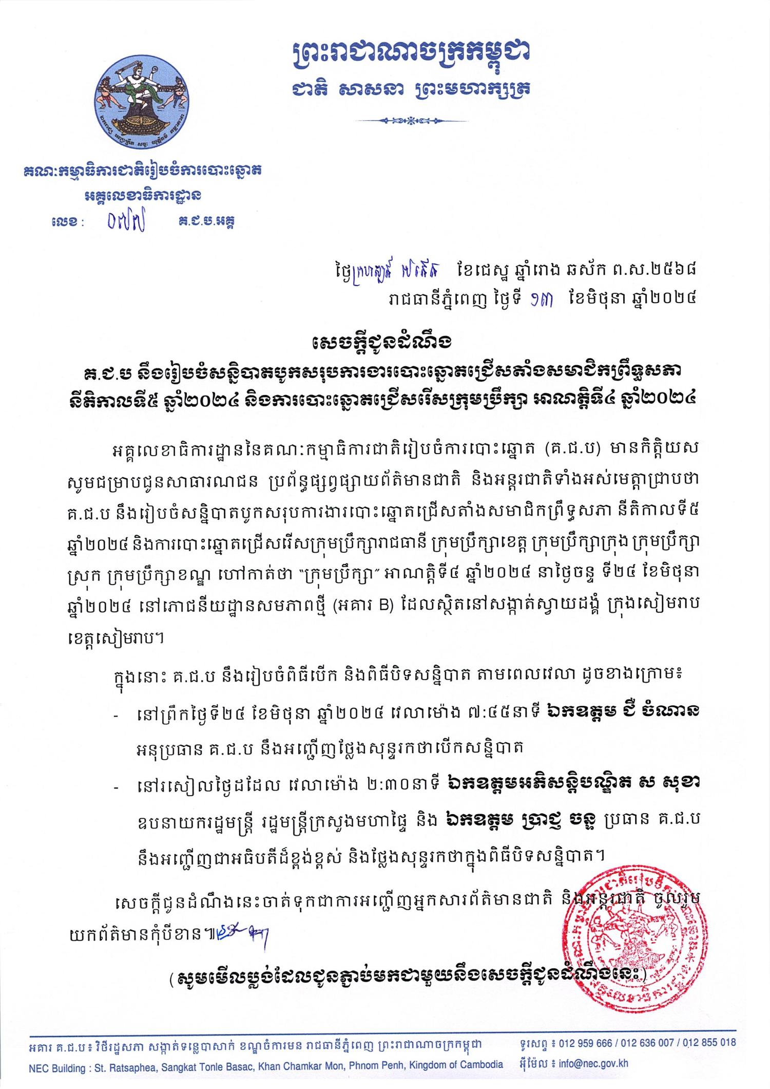 អគ្គលេខាធិការដ្ឋាននៃគណៈកម្មាធិការជាតិរៀបចំការបោះឆ្នោត (គ.ជ.ប) មានកិត្តិយស សូមជម្រាបជូនសាធារណជន ប្រព័ន្ធផ្សព្វផ្សាយព័ត៌មានជាតិ និងអន្តរជាតិទាំងអស់មេត្តាជ្រាបថា គ.ជ.ប នឹងរៀបចំសន្និបាតបូកសរុបការងារបោះឆ្នោតជ្រើសតាំងសមាជិកព្រឹទ្ធសភា នីតិកាលទី៥ ឆ្នាំ២០២៤ និងការបោះឆ្នោតជ្រើសរើសក្រុមប្រឹក្សារាជធានី ក្រុមប្រឹក្សាខេត្ត ក្រុមប្រឹក្សាក្រុង ក្រុមប្រឹក្សាស្រុក ក្រុមប្រឹក្សាខណ្ឌ ហៅកាត់ថា “ក្រុមប្រឹក្សា” អាណត្តិទី៤ ឆ្នាំ២០២៤ នាថ្ងៃចន្ទ ទី២៤ ខែមិថុនា ឆ្នាំ២០២៤ នៅភោជនីយដ្ឋានសមភាពថ្មី (អគារ B) ដែលស្ថិតនៅសង្កាត់ស្វាយដង្គំ ក្រុងសៀមរាប ខេត្តសៀមរាប។