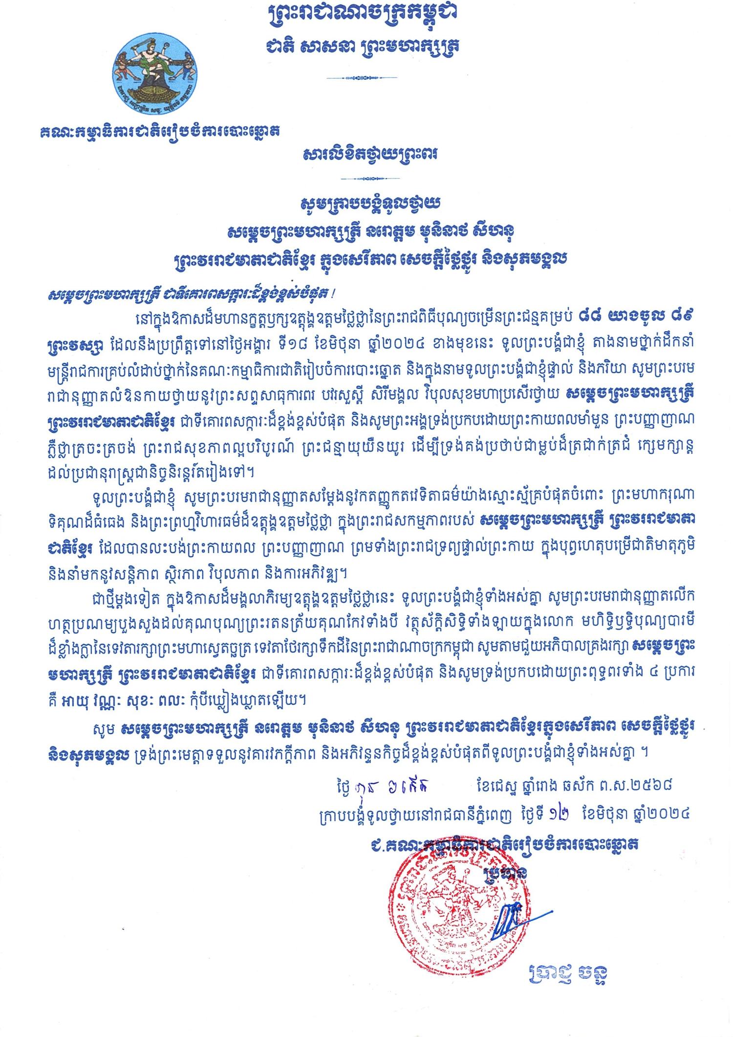 សារលិខិតថ្វាយព្រះពរ សម្ដេចព្រះមហាក្សត្រី នរោត្ដម មុនិនាថ សីហនុ ព្រះវររាជមាតាជាតិខ្មែរ ក្នុងសេរីភាព សេចក្ដីថ្លៃថ្នូរ និងសុភមង្គល នៅក្នុងឱកាសដ៏មហានក្ខត្តឫក្សឧត្ដុង្គឧត្ដមថ្លៃថ្លានៃព្រះរាជពិធីចម្រើនព្រះជន្មគម្រប់ ៨៨ យាងចូល ៨៩ ព្រះវស្សា