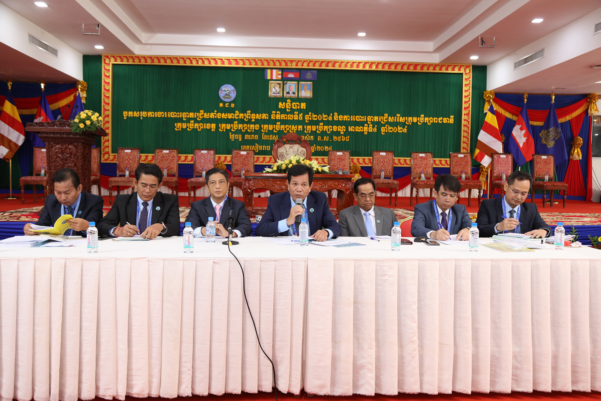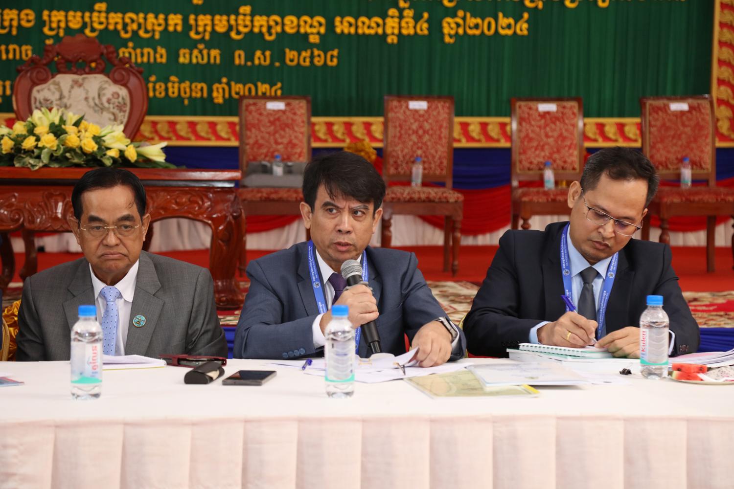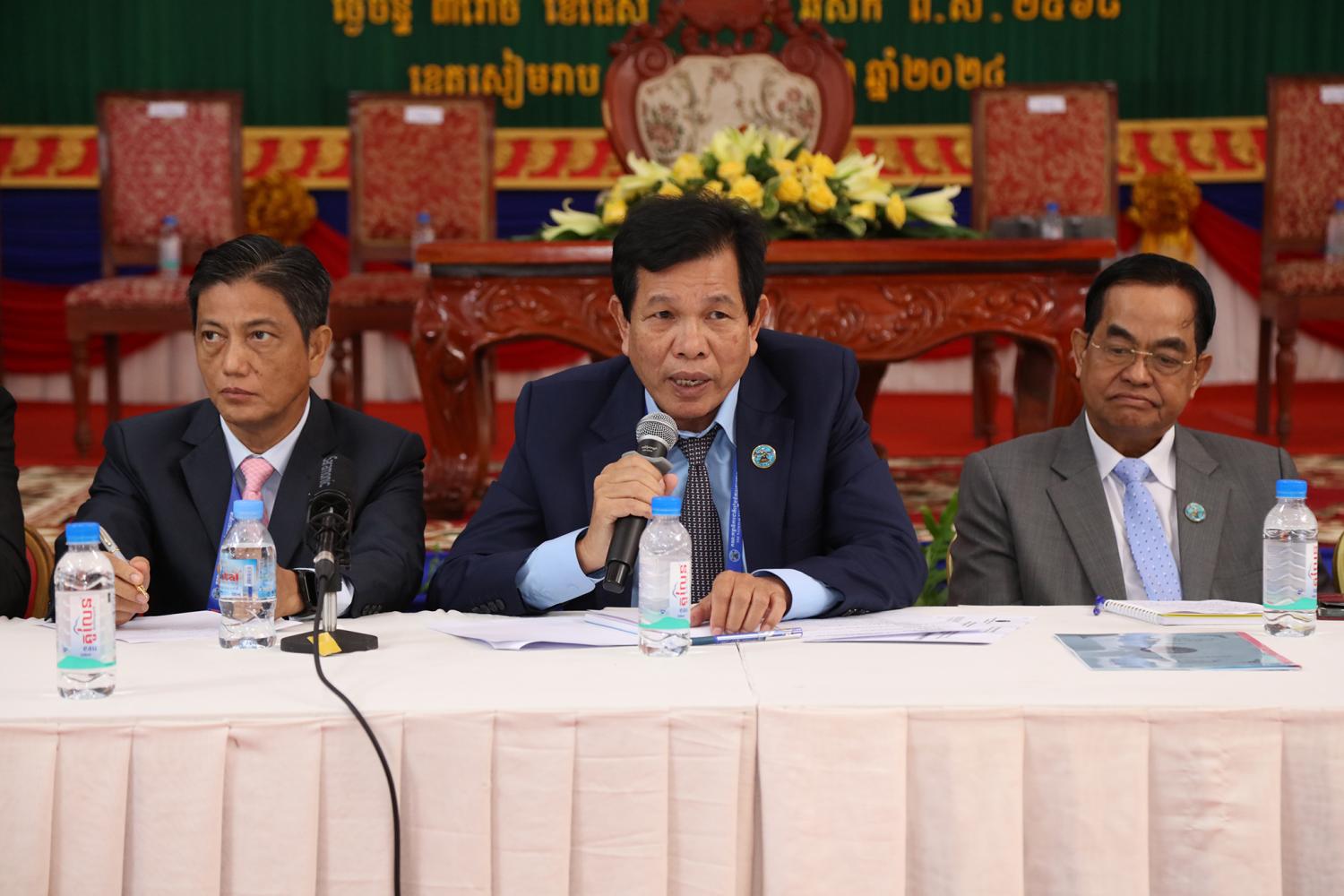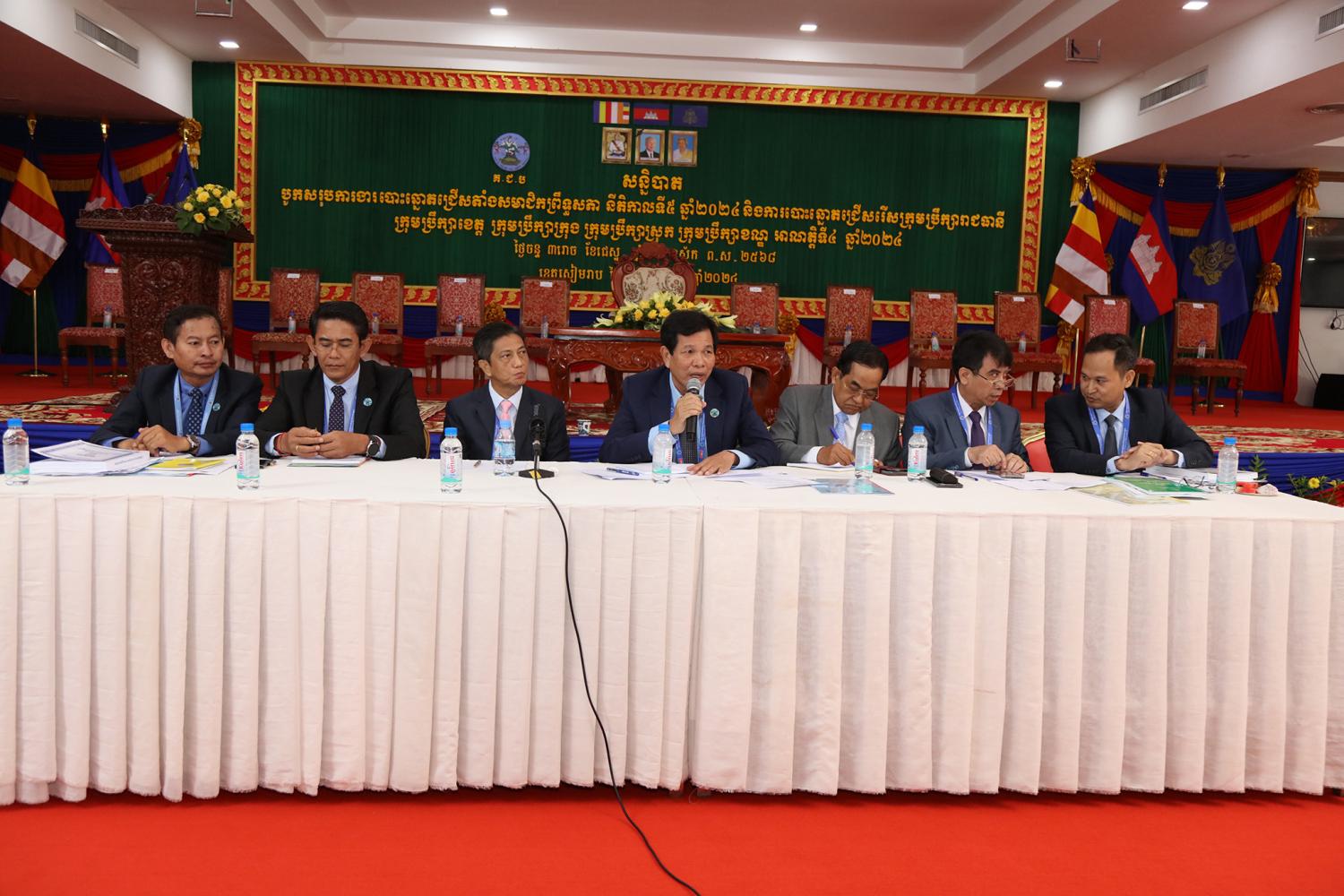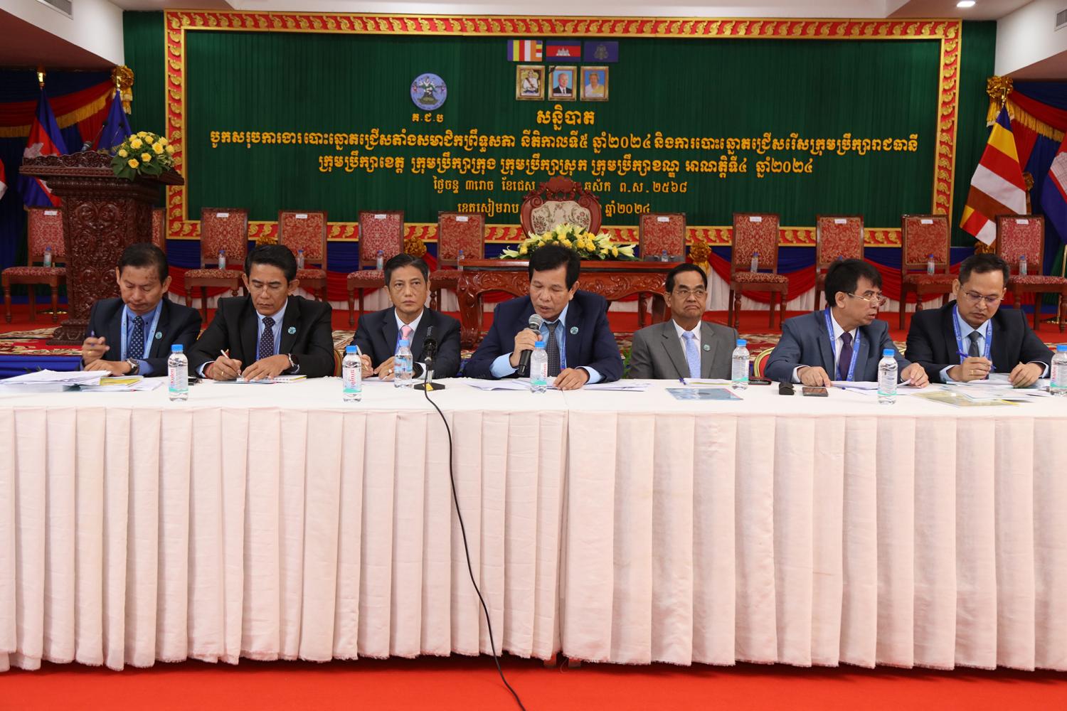 រូបភាពសកម្មភាពកិច្ចពិភាក្សានៃអង្គសន្និបាតបូកសរុបការងាររៀបចំការបោះឆ្នោតជ្រើសតាំងសមាជិកព្រឹទ្ធសភា នីតិកាលទី៥ ឆ្នាំ២០២៤ និងការបោះឆ្នោតជ្រើសរើសក្រុមប្រឹក្សារាជធានី ក្រុមប្រឹក្សាខេត្ត ក្រុមប្រឹក្សាក្រុង ក្រុមប្រឹក្សាស្រុក ក្រុមប្រឹក្សាខណ្ឌ អាណត្តិទី៤ ឆ្នាំ២០២៤ នាព្រឹកថ្ងៃទី២៤ ខែមិថុនា ឆ្នាំ២០២៤ នៅភោជនីយដ្ឋានសមភាពថ្មី ដែលស្ថិតនៅសង្កាត់ស្វាយដង្គំ ក្រុងសៀមរាប ខេត្តសៀមរាប