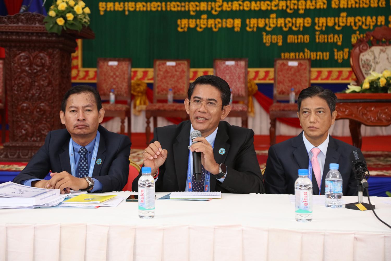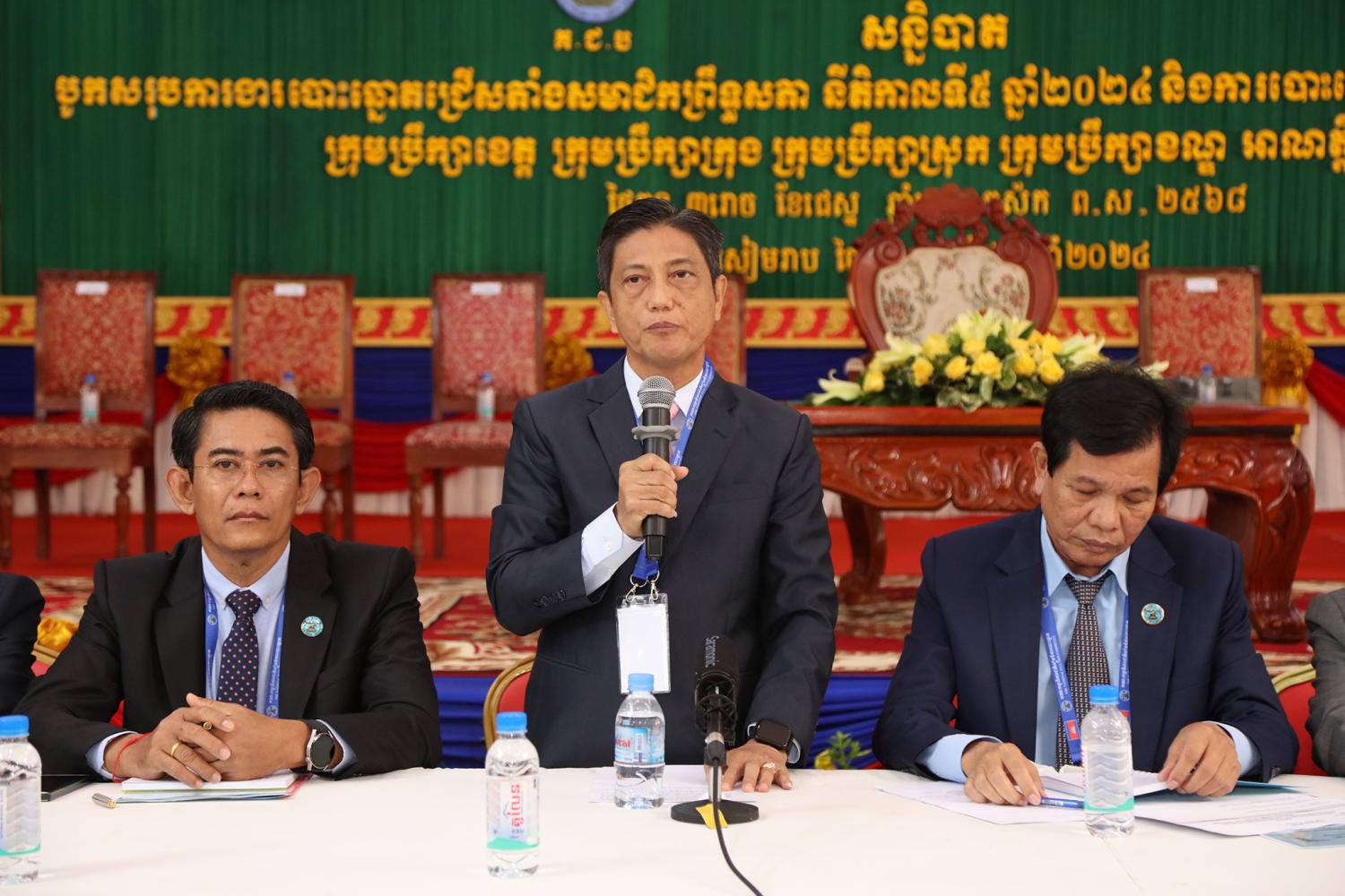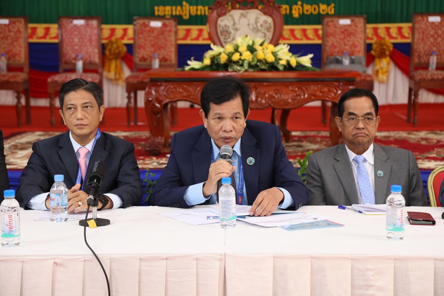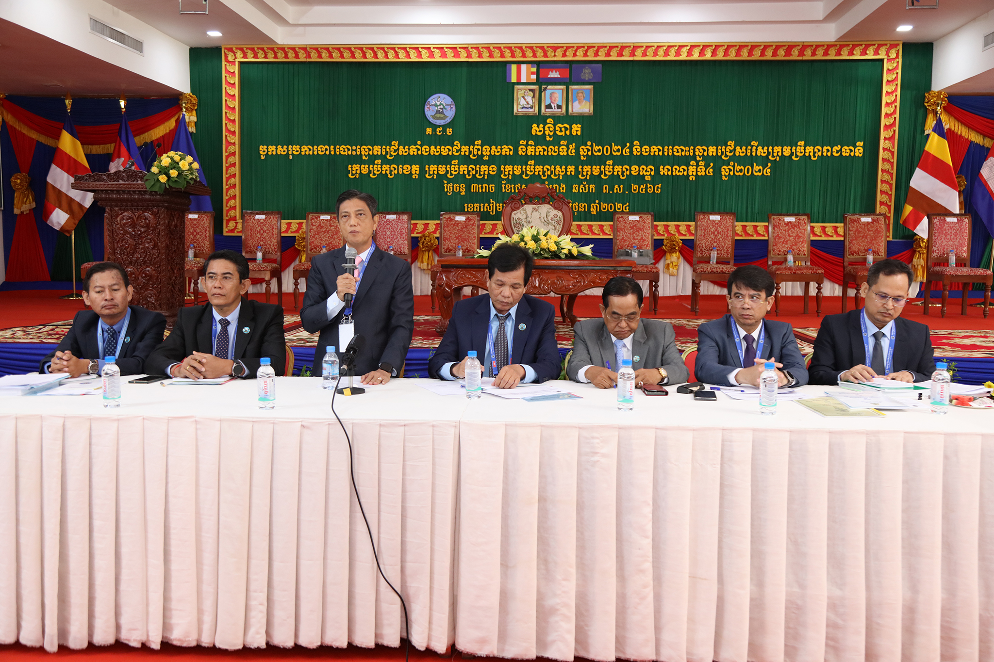រូបភាពសកម្មភាពកិច្ចពិភាក្សានៃអង្គសន្និបាតបូកសរុបការងាររៀបចំការបោះឆ្នោតជ្រើសតាំងសមាជិកព្រឹទ្ធសភា នីតិកាលទី៥ ឆ្នាំ២០២៤ និងការបោះឆ្នោតជ្រើសរើសក្រុមប្រឹក្សារាជធានី ក្រុមប្រឹក្សាខេត្ត ក្រុមប្រឹក្សាក្រុង ក្រុមប្រឹក្សាស្រុក ក្រុមប្រឹក្សាខណ្ឌ អាណត្តិទី៤ ឆ្នាំ២០២៤ នាព្រឹកថ្ងៃទី២៤ ខែមិថុនា ឆ្នាំ២០២៤ នៅភោជនីយដ្ឋានសមភាពថ្មី ដែលស្ថិតនៅសង្កាត់ស្វាយដង្គំ ក្រុងសៀមរាប ខេត្តសៀមរាប