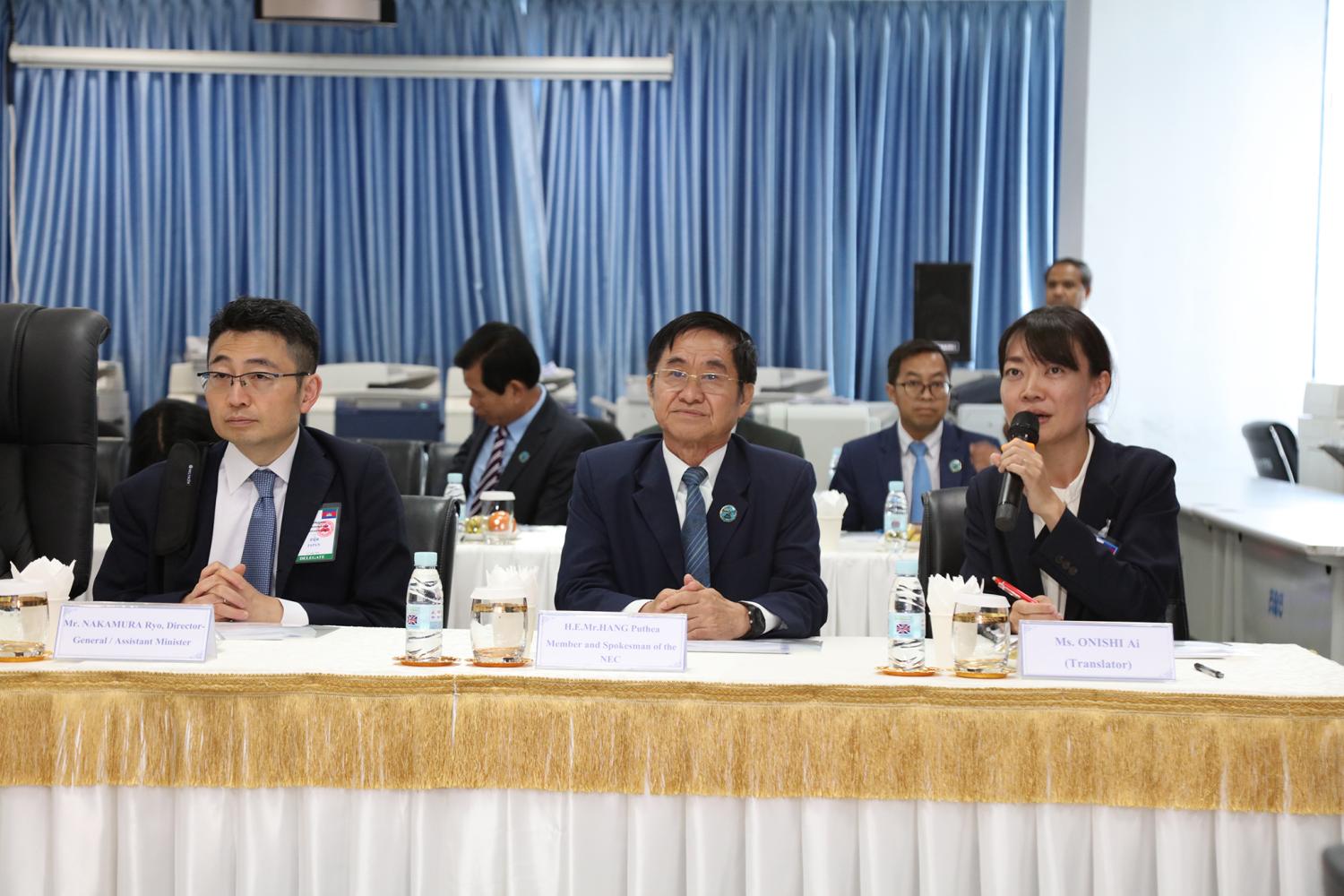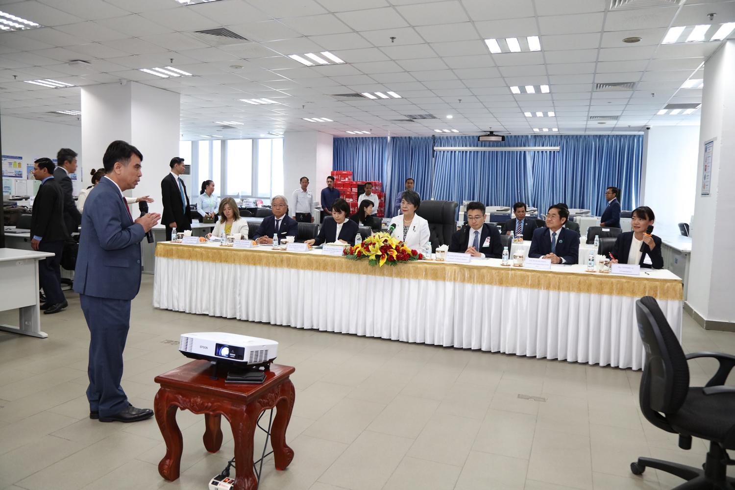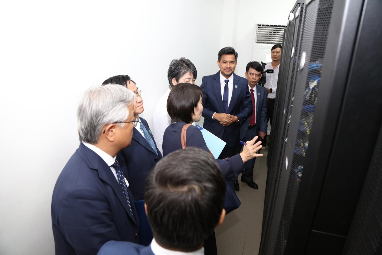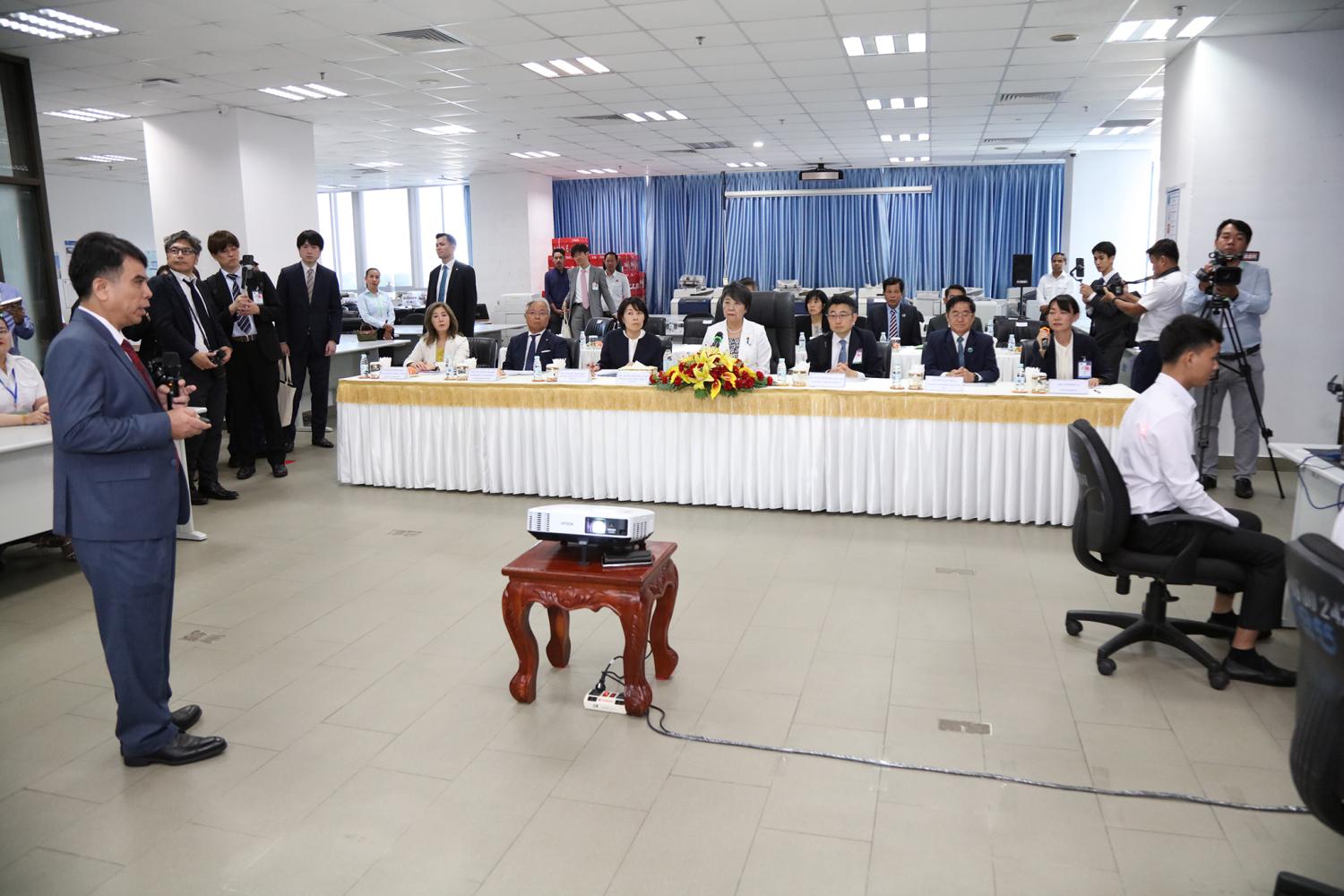 រូបភាពសកម្មភាព ឯកឧត្ដម តុប ឫទ្ធី អគ្គនាយកនៃអគ្គនាយកដ្ឋានសេវាកម្មច្បាប់ និងបច្ចេកទេស បានបង្ហាញអំពីម៉ាស៊ីនមេ (Server) និងធ្វើបទបង្ហាញអំពីការចុះឈ្មោះបោះឆ្នោតនៅកម្ពុជា ជូនដល់លោកជំទាវ ខាមីខាវ៉ា យ៉ូកុ (KAMIKAWA Yoko) រដ្ឋមន្ត្រីក្រសួងការបរទេសជប៉ុន និងសហការី នារសៀលថ្ងៃទី៦ ខែកក្កដា ឆ្នាំ២០២៤ នៅទីស្ដីការ គ.ជ.ប