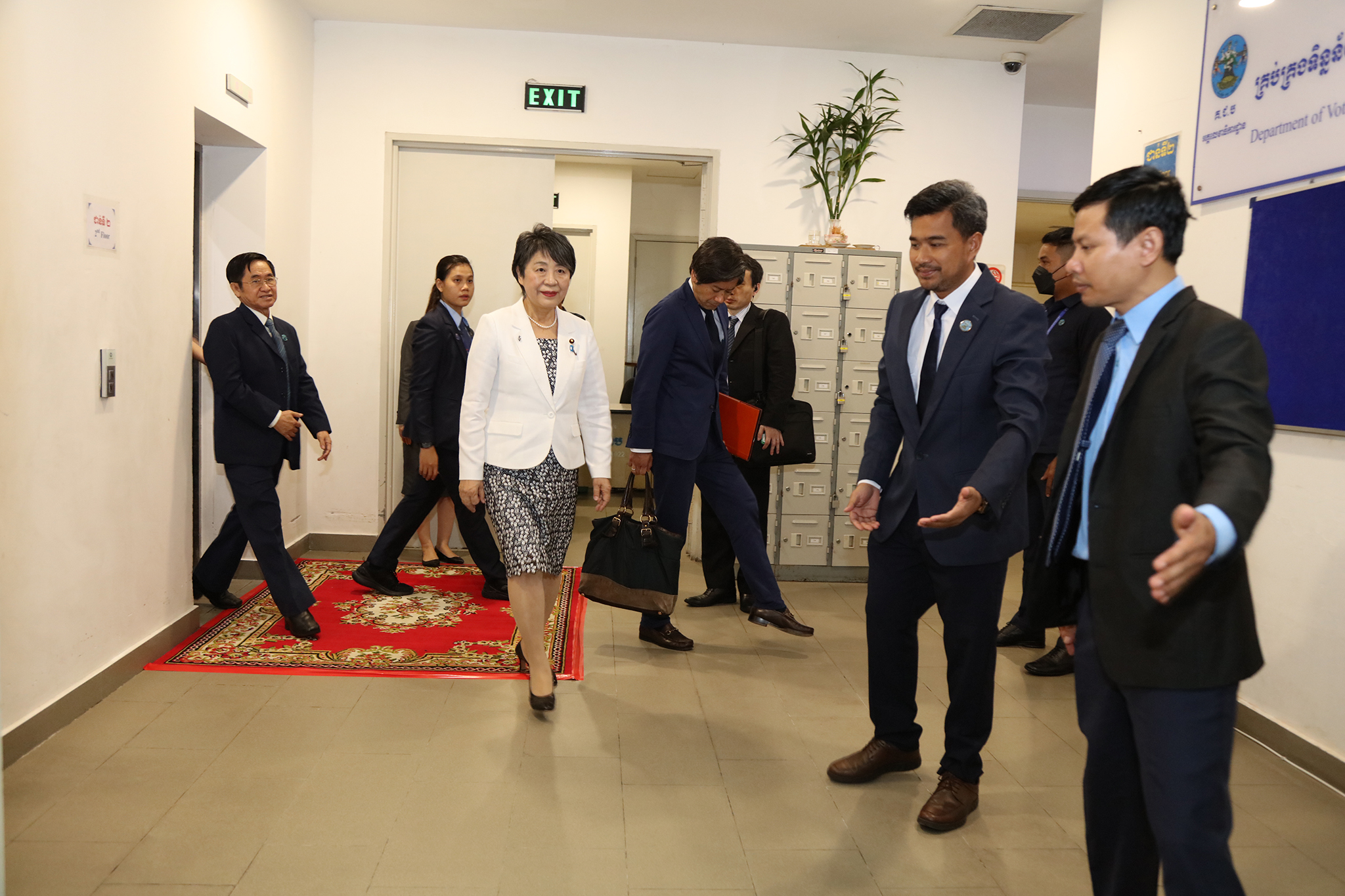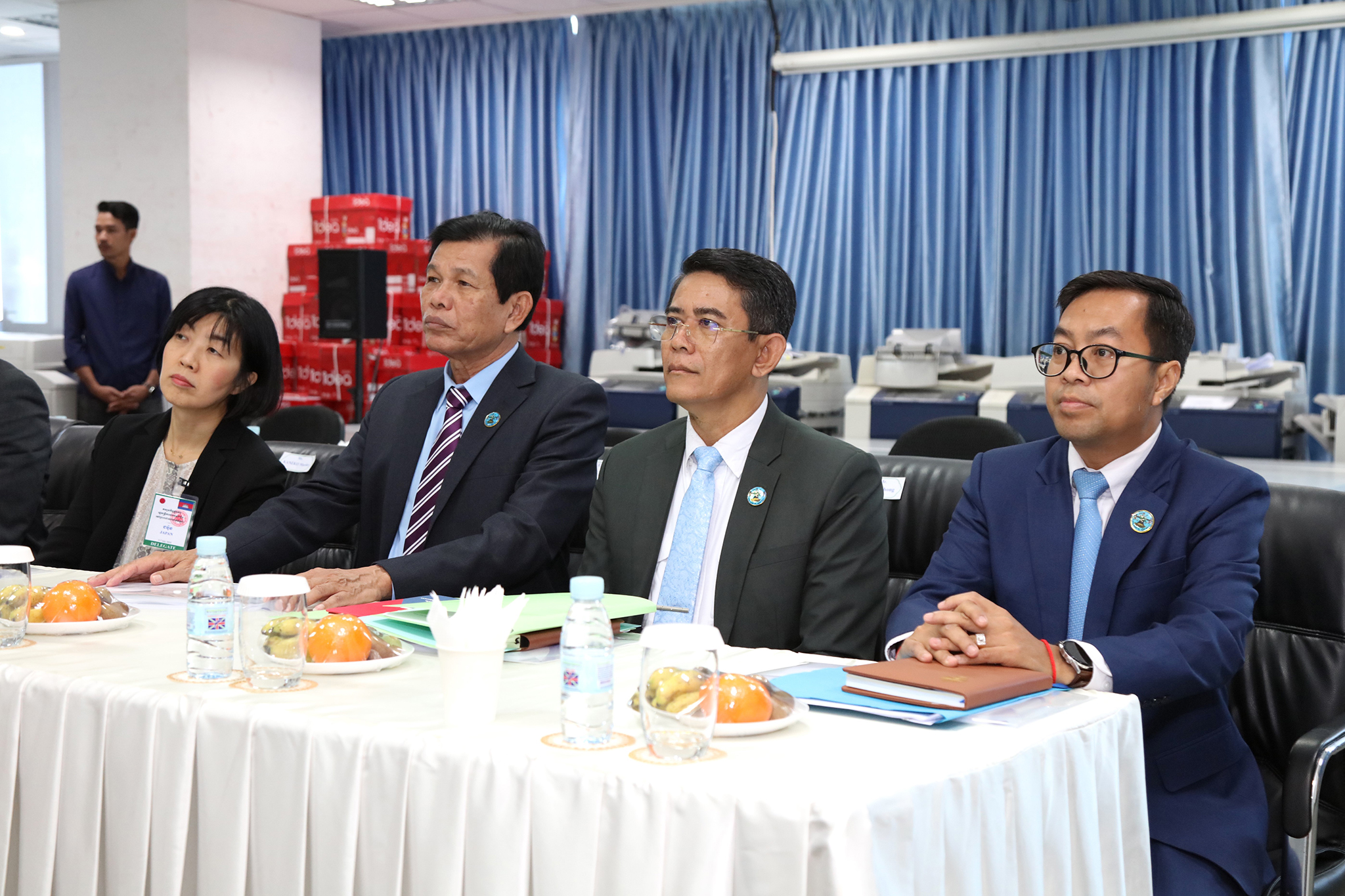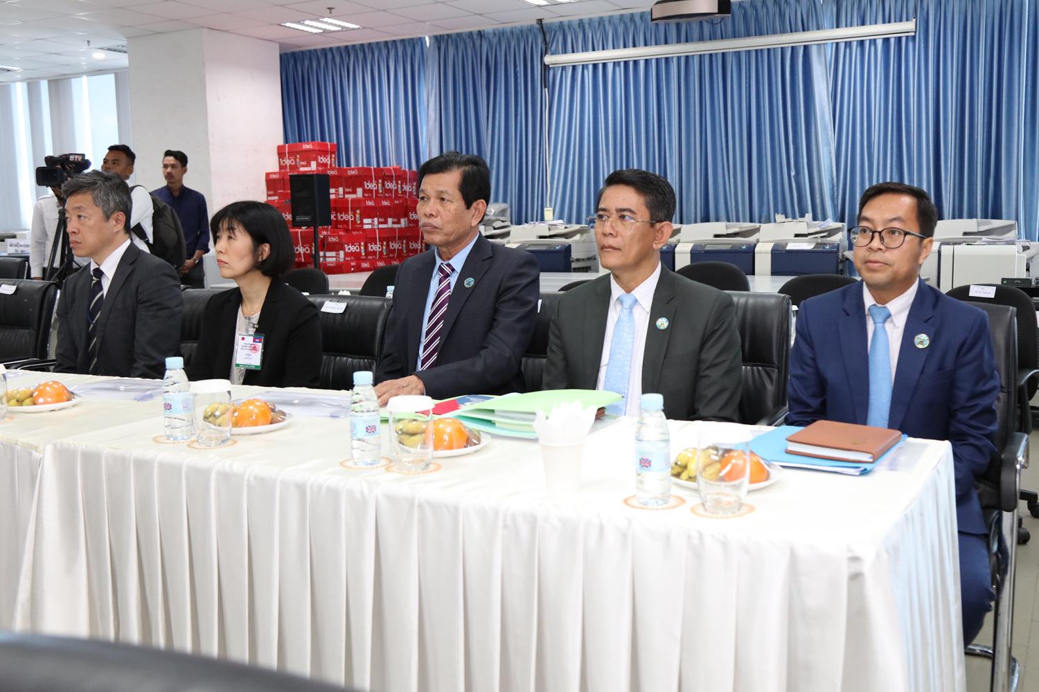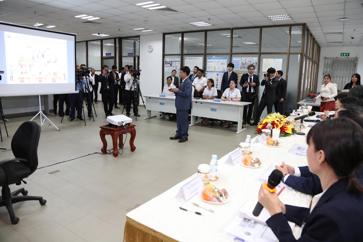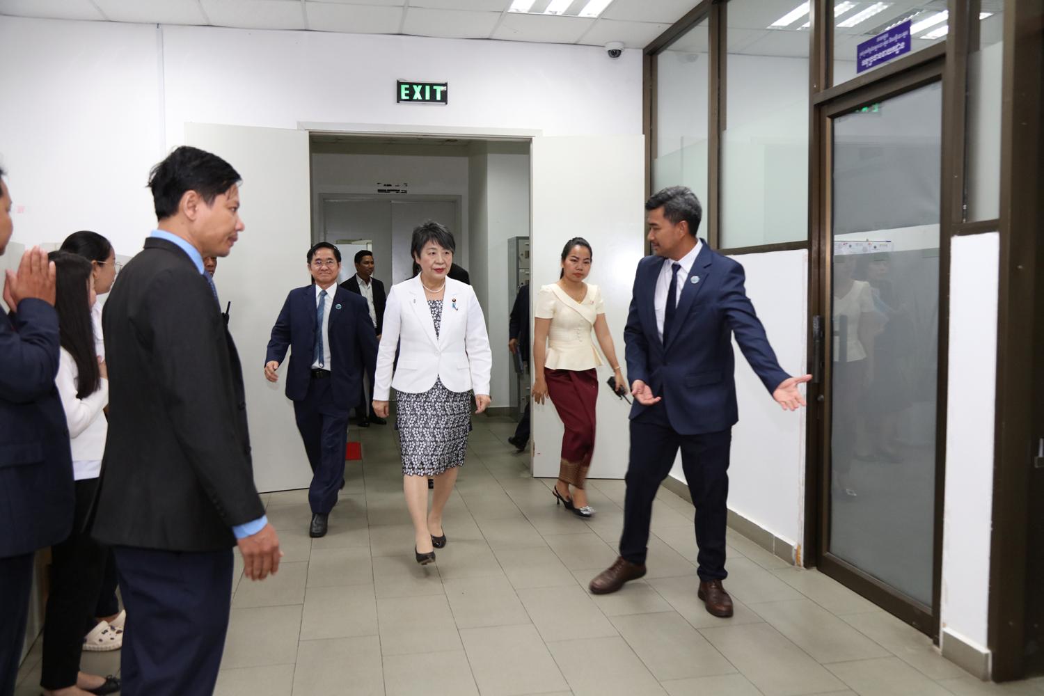 រូបភាពសកម្មភាព ឯកឧត្ដម តុប ឫទ្ធី អគ្គនាយកនៃអគ្គនាយកដ្ឋានសេវាកម្មច្បាប់ និងបច្ចេកទេស បានបង្ហាញអំពីម៉ាស៊ីនមេ (Server) និងធ្វើបទបង្ហាញអំពីការចុះឈ្មោះបោះឆ្នោតនៅកម្ពុជា ជូនដល់លោកជំទាវ ខាមីខាវ៉ា យ៉ូកុ (KAMIKAWA Yoko) រដ្ឋមន្ត្រីក្រសួងការបរទេសជប៉ុន និងសហការី នារសៀលថ្ងៃទី៦ ខែកក្កដា ឆ្នាំ២០២៤ នៅទីស្ដីការ គ.ជ.ប